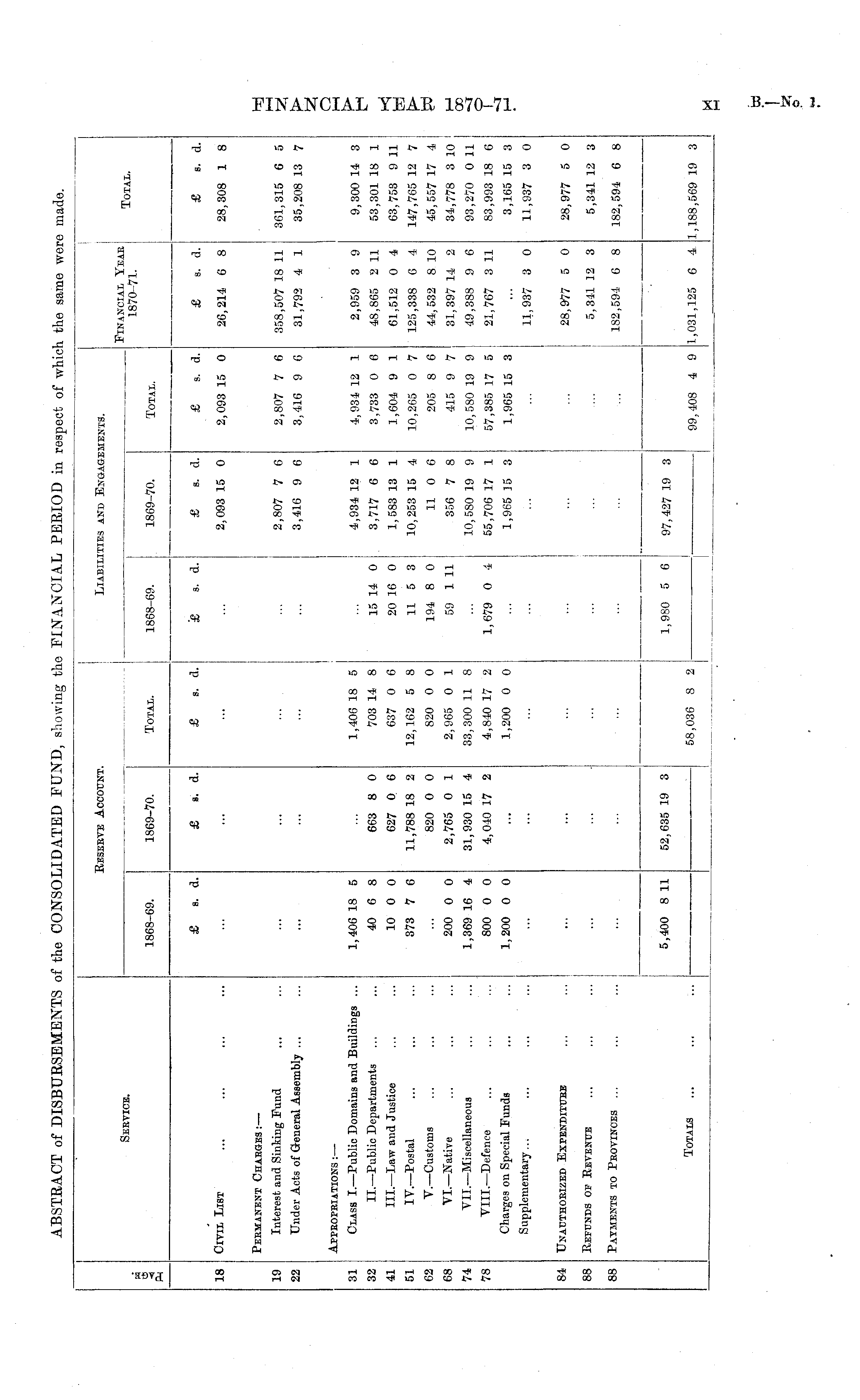 Reserve Account. Liabilities and Engagements. IS Service. Financial Year j 1870-71. Total. 1868-69. 1869-70. Total. Total. 1868-69. 1869-70. 1868-69. Total. I ! £ s. d. £ s. d. £ s. d. £ 9. d. £ s. d. £ s. d. £ s. a. £ s. d. 18 Civn List 2,093 15 0 2,093 15 0 26,214 6 8 28,308 1 8 Permanent Charges :— 2,807 7 6 2,807 7 6 358,507 18 11 | 19 Interest and Sinking Fund 361,315 6 5 22 Under Acts of G-eneral Assembly ... 3,416 9 6 3,416 9 6 31,792 4 1 I 35,208 13 7 Appropriations :— 1,406 18 5 I 1,406 18 5 4,934 12 1 4,934 12 1 9,300 14 3 31 Class I.—Public Domains and Buildings ... 2,959 3 9 32 II. —Public Departments III. —Law and Justice 40 6 8 663 8 0 703 14 8 15 14 0 3,717 6 6 3,733 0 6 48,865 2 11 53,301 18 1 41 10 0 0 627 0 6 637 0 6 20 16 0 1,583 13 1 1,604 9 1 61,512 0 4 63,753 9 11 51 IV.—Postal 373 7 6 11,788 18 2 12,162 5 8 11 5 3 10,253 15 4 10,265 0 7 125,338 G 4 147,765 12 7 62 V.—Customs 820 0 0 820 0 0 194 8 0 11 0 6 205 8 6 44,532 8 10 45,557 17 4 I 68 VI.—Native 200 0 0 2,765 0 1 2,985 0 1 59 1 11 356 7 8 415 9 7 31,397 14 2 34,778 3 10 j 74 VII.- —Miscellaneous 1,369 16 4 31,930 15 4 33,300 11 8 10,580 19 9 10,580 19 9 49,388 9 6 I 93,270 0 11 78 VIII.— Defence 800 0 0 4,010 17 2 4,840 17 2 1,679 0 4 55,706 17 1 57,385 17 5 21,767 3 11 83,993 18 6 Charges on Special Funds 1,200 0 0 i 1,200 0 0 1,965 ]5 3 | 1,965 15 3 3,165 15 3 Supplementary... 11,937 3 0 11,937 3 0 84 Unauthorized Expenditure I 28,977 5 0 28,977 5 0 88 Refunds oi Revenue 5,341 12 3 5,341 12 3 88 Payments to Provinces ... ... ... 132,594 6 8 182, 594 6 8 i ! I _ I ! Totals 5,400 8 11 52,635 19 3 1,980 5 6 97,427 19 3 I 99,408 4 9 1,031,125 6 4 1,188,569 19 3