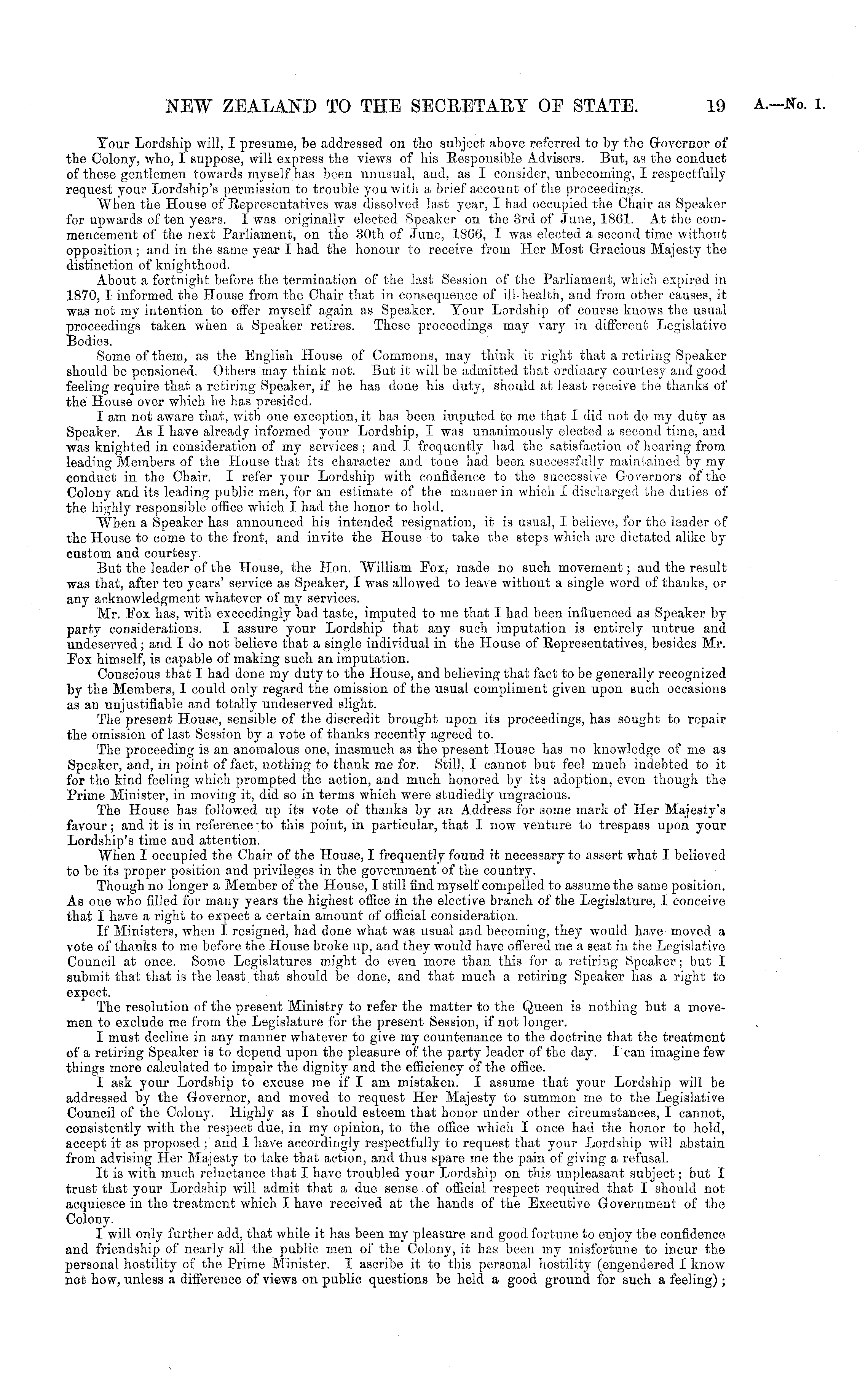 Tour Lordship will, I presume, be addressed on the subject above referred to by the Governor of the Colony, who, I suppose, will express the views of his Eespousible Advisers. But, as the conduct of these gentlemen towards myself has been unusual, and, as I consider, unbecoming, I respectfully request your Lordship's permission to trouble you with a brief account of the proceedings. When the House of Representatives was dissolved last year, I had occupied the Chair as Speaker for upwards of ten years. I was originally elected Speaker on the 3rd of June, 1861. At the commencement of the next Parliament, on the 30th of June, 1866, I was elected a second time without opposition ; and in the same year I had the honour to receive from Her Most Gracious Majesty the distinction of knighthood. About a fortnight before the termination of the last Session of the Parliament, which expired in 1870, I informed the House from the Chair that in consequence of ill-health, and from other causes, it was not my intention to offer myself again as Speaker. Tour Lordship of course knows the usual proceedings taken when a Speaker retires. These proceedings may vary in different Legislative Bodies. Some of them, as the English House of Commons, may think it right that a retiring Speaker should be pensioned. Others may think not. But it will be admitted that ordinary courtesy and good feeling require that a retiring Speaker, if he has done his duty, should at least receive the thanks of the House over which he has presided. I am not aware that, with one exception, it has been imputed to me that I did not do my duty as Speaker. As I have already informed your Lordship, I was unanimously elected a second time, and was knighted in consideration of my services; and I frequently had the satisfaction of hearing from leading Members of the House that its character and tone had been successfully maintained by my conduct in the Chair. I refer your Lordship with confidence to the successive Governors of the Colony and its leading public men, for an estimate of the manner in which I discharged the duties of the highly responsible office which I had the honor to hold. When a Speaker has announced his intended resignation, it is usual, I believe, for the leader of the House to come to the front, and invite the House to take the steps which are dictated alike by custom and courtesy. But the leader of the House, the Hon. William 'Fox, made no such movement; and the result was that, after ten years' service as Speaker, I was allowed to leave without a single word of thanks, or any acknowledgment whatever of my services. Mr. Fox has, with exceedingly bad taste, imputed to me that I had been influenced as Speaker by party considerations. I assure your Lordship that any such imputation is entirely untrue and undeserved; and I do not believe that a single individual in the House of Representatives, besides Mr. Fox himself, is capable of making such an imputation. Conscious that I had done my duty to the House, and believing that fact to be generally recognized by the Members, I could only regard the omission of the usual compliment given upon such occasions as an unjustifiable and totally undeserved slight. The present House, sensible of the discredit brought upon its proceedings, has sought to repair the omission of last Session by a vote of thanks recently agreed to. The proceeding is an anomalous one, inasmuch as the present House has no knowledge of me as Speaker, and, in point of fact, nothing to thank me for. Still, I cannot but feel much indebted to it for the kind feeling which prompted the action, and much honored by its adoption, even though the Prime Minister, in moving it, did so in terms which were studiedly ungracious. The House has followed up its vote of thanks by an A.ddress for some mark of Her Majesty's favour; and it is in reference to this point, in particular, that I now venture to trespass upon your Lordship's time and attention. When I occupied the Chair of the House, I frequently found it necessary to assert what I believed to be its proper position and privileges in the government of the country. Though no longer a Member of the House, I still find myself compelled to assume the same position. As one who filled for many years the highest office in the elective branch of the Legislature, I conceive that I have a right to expect a certain amount of official consideration. If Ministers, when 1 resigned, had done what was usual and becoming, they would have moved a vote of thanks to me before the House broke up, and they would have offered me a seat in the Legislative Council at once. Some Legislatures might do even more than this for a retiring Speaker; but I submit that that is the least that should be done, and that much a retiring Speaker has a right to expect. The resolution of the present Ministry to refer the matter to the Queen is nothing but a movemen to exclude me from the Legislature for the present Session, if not longer. I must decline in any manner whatever to give my countenance to the doctrine that the treatment of a retiring Speaker is to depend upon the pleasure of the party leader of the day. I can imagine few things more calculated to impair the dignity and the efficiency of the office. I ask your Lordship to excuse me if I am mistaken. I assume that your Lordship will be addressed by the Governor, and moved to request Her Majesty to summon me to the Legislative Council of the Colony. Highly as I should esteem that honor under other circumstances, I cannot, consistently with the respect due, in my opinion, to the office which I once had the honor to hold, accept it as proposed ;' and I have accordingly respectfully to request that your Lordship will abstain from advising Her Majesty to take that action, and thus spare me the pain of giving a refusal. It is with much reluctance that I have troubled your Lordship on this unpleasant subject; but I trust that your Lordship will admit that a due