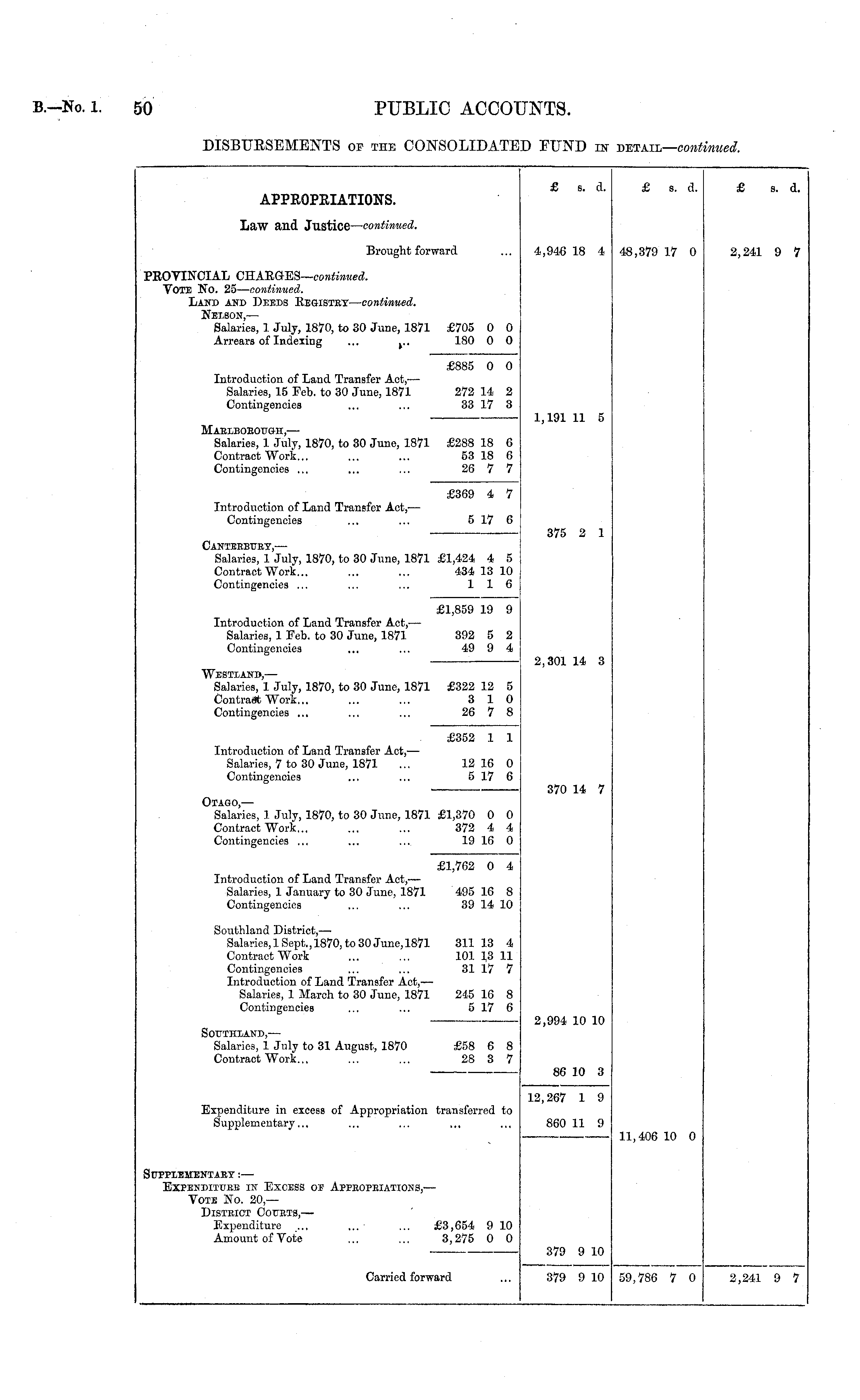 DISBUESEMENTS of the CONSOLIDATED FUND in detail— eont; Inned. APPROPBIATIONS. £ s. a. £ s. d. £ a. d. Law and Justice — continued. 4,946 18 4 48,379 17 0 2,241 9 7 Brought forward PROVINCIAL CHARGffiS— continued. Vote No. 25— continued. Land and Deeds Registry— continued. Nelson, — Salaries, 1 July, 1870, to 30 June, 1871 £705 0 0 Arrears of Indexing ... ,.. 180 0 0 £885 0 0 Introduction of Land Transfer Act, — Salaries, 15 Feb. to 30 June, 1871 272 14 2 Contingencies ... ... 33 17 3 Mablboboug-h,— Salaries, 1 July, 1870, to 30 June, 1871 £288 18 6 Contract Work... ... ... 53 18 6 Contingencies ... ... ... 26 7 7 1,191 11 5 £369 4 7 Introduction of Land Transfer Act,- — Contingencies ... ... 5 17 6 375 2 1 C"^ A WF"R'RT^TT"R"V - Salaries, 1 July, 1870, to 30 June, 1871 £1,424 4 5 Contract Work... ... ... 434 13 10 Contingencies ... ... ... 116 £1,859 19 9 Introduction of Land Transfer Act, — Salaries, 1 Feb. to 30 June, 1871 392 5 2 Contingencies ... ... 49 9 4 2,301 14 3 Westland, —■ Salaries, 1 July, 1870, to 30 June, 1871 £322 12 5 Contrast Work... ... ... 3 10 Contingencies ... ... ... 26 7 8 £352 1 1 Introduction of Land Transfer Act, — Salaries, 7 to 30 June, 1871 ... 12 16 0 Contingencies ... ... 5 17 6 £352 1 1 12 16 0 5 17 6 370 14 7 Otago,— Salaries, 1 July, 1870, to 30 June, 1871 £1,370 0 0 Contract Work... ... ... 372 4 4 Contingencies ... ... ... 19 16 0 £1,762 0 4 Introduction of Land Transfer Act,— Salaries, 1 January to 30 June, 1871 495 16 8 Contingencies ... ... 39 14 10 Southland District, — Salaries,lSept.,1870,to30June,1871 311 13 4 Contract Work ... ... 101 13 11 Contingencies ... ... 31 17 7 Introduction of Land Transfer Act, — Salaries, 1 March to 30 June, 1871 245 16 8 Contingencies ... ... 5 17 6 Southland, — Salaries, 1 July to 31 August, 1870 £58 6 8 Contract Work... ... ... 28 3 7 2,994 10 10 86 10 3 Expenditure in excess of Appropriation transferred to Supplementary... 12,267 1 9 860 11 9 11,406 10 0 Supplement abt : — expenditure! in excess of appbopbiations,— Vote No. 20,— District Courts,— Expenditure .... ... ... £3,654 9 10 Amount of Vote ... ... 3,275 0 0 379 9 10 Carried forward 379 9 10 59,786 7 0 2,241 9 7
