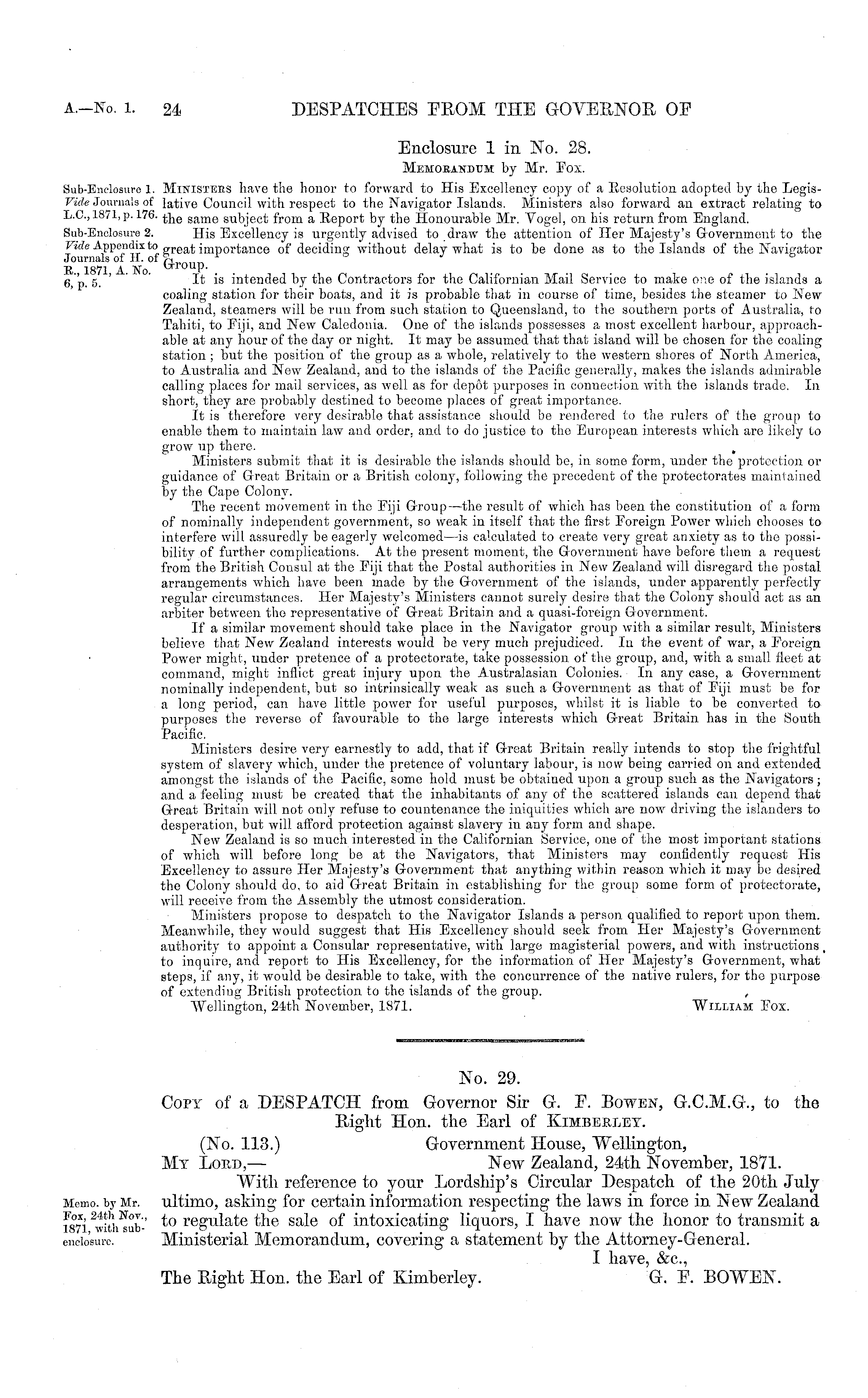 Enclosure 1 in No. 28. Memorandum by Mr. Fox. Mintstees have the honor to forward to His Excellency copy of a Resolution adopted by the Legislative Council with respect to the Navigator Islands. Ministers also forward an extract relating to the same subject from a Report by the Honourable Mr. Vogel, on his return from England. His Excellency is urgently advised to draw the attention of Her Majesty's Government to the great importance of deciding without delay what is to be done as to the Islands of the Navigator Group. It is intended by the Contractors for the Californian Mail Service to make one of the islands a coaling station for their boats, and it is probable that in course of time, besides the steamer to New Zealand, steamers will be run from such station to Queensland, to the southern ports of Australia, to Tahiti, to Fiji, and New Caledonia. One of the islands possesses a most excellent harbour, approachable at any hour of the day or night. It may be assumed that that island will be chosen for the coaling station ; but the position of the group as a whole, relatively to the western shores of North America, to Australia and New Zealand, and to the islands of the Pacific generally, makes the islands admirable calling places for mail services, as well as for depot purposes in connection with the islands trade. In short, they are probably destined to become places of great importance. It is therefore very desirable that assistance should be rendered to the rulers of the group to enable them to maintain law and order, and to do justice to the European interests which are likely to grow up there. Ministers submit that it is desirable the islands should be, in some form, under the protection or guidance of Great Britain or a British colony, following the precedent of the protectorates maintained by the Cape Colony. The recent movement in the Fiji Group —the result of which has been the constitution of a form of nominally independent government, so weak in itself that the first Foreign Power which chooses to interfere will assuredly be eagerly welcomed —is calculated to create very great anxiety as to the possibility of further complications. At the present moment, the Government have before them a request from the British Consul at the Fiji that the Postal authorities in New Zealand will disregard the postal arrangements which have been made by the Government of the islands, under apparently perfectly regular circumstances. Her Majesty's Ministers cannot surely desire that the Colony should act as an arbiter between the representative of Great Britain and a quasi-foreign Government. If a similar movement should take place in the Navigator group with a similar result, Ministers believe that New Zealand interests would be very much prejudiced. Iv the event of war, a Foreign Power might, under pretence of a protectorate, take possession of the group, and, with a small fleet at command, might inflict great injury upon the Australasian Colonies. In any case, a Government nominally independent, but so intrinsically weak as such a Government as that of Fiji must be for a long period, can have little power for useful purposes, whilst it is liable to be converted to purposes the reverse of favourable to the large interests which Great Britain has in the South Pacific. Ministers desire Yerj earnestly to add, that if Great Britain really intends to stop the frightful system of slavery which, under the pretence of voluntary labour, is now being carried on and extended amongst the islands of the Pacific, some hold must be obtained upon a group such as the Navigators; and a feeling must be created that the inhabitants of any of the scattered islands can depend that Great Britain will not only refuse to countenance the iniquities which are now driving the islanders to desperation, but will afford protection against slavery in any form and shape. New Zealand is so much interested in the Californian Service, one of the most important stations of which will before long be at the Navigators, that Ministers may confidently request His Excellency to assure Her Majesty's Government that anything within, reason which it may be desired the Colony should do, to aid Great Britain in establishing for the group some form of protectorate, will receive from the Assembly the utmost consideration. Ministers propose to despatch to the Navigator Islands a person qualified to report upon them. Meanwhile, they would suggest that His Excellency should seek from Her Majesty's Government authority to appoint a Consular representative, with large magisterial powers, and with instructions, to inquire, and report to His Excellency, for the information of Her Majesty's Government, what steps, if any, it would be desirable to take, with the concurrence of the native rulers, for the purpose of extending British protection to the islands of the group. "Wellington, 24th November, 1871. "William Fox.