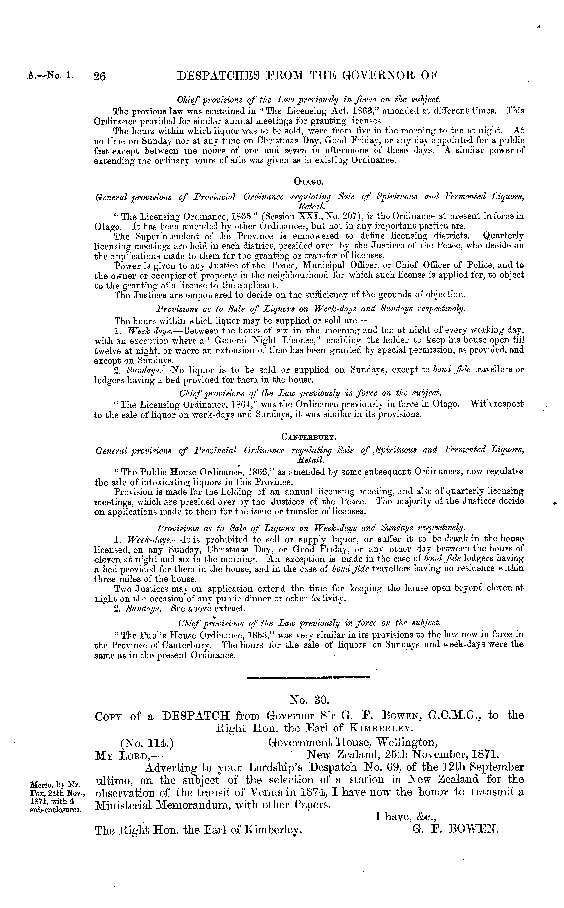 No. 30. Copy of a DESPATCH from Governor Sir G. I\ Bowen, G.C.M.G., to the Right Hon. the Earl of Kjmbebxey. (No. 114.) Government House, "Wellington, My Lord, — New Zealand, 25th November, 1871. Adverting to your Lordship's Despatch No. 69, of the 12th September ultimo, on the subject of the selection of a station in New Zealand for the observation of the transit of Tenus in 1874, I have now the honor to transmit a Ministerial Memorandum, with other Papers. I have, &c, The Eight Hon. the Earl of Kimberley. G. ~E. BOWEN.