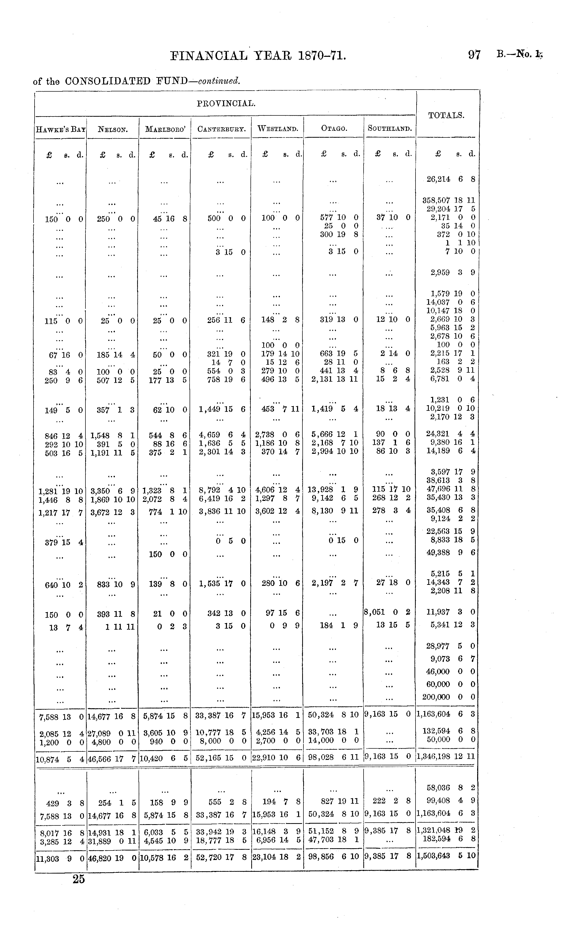 if the CONSOLIDATED FUND— continued. pkovincia: TOTALS. Hawke's Bat Kelson. Marlboro' Cakteebtjky. Westland. Otago. Southland. £ s. d. £ s. a. £ a. d. £ s. a. £ b. a. £ s. a. £ s. a. £ s. d. 26,214 6 8 150 "0 0 250 0 0 45 16 8 500" 0 0 100" 0 0 577 10 0 25 0 0 300 19 8 37 10 0 358,507 18 11 29,204 17 5 2,171 0 0 35 14 0 372 0 10 1 1 10 7 10 0 3 15 0 3 15 0 2,959 3 9 I 115 0 0 ... ae" 0 0 25 0 0 256 11 6 148" 2 8 100 0 0 179 14 10 15 12 6 279 10 0 496 13 5 319 13 0 12 10 0 1,579 19 0 14,037 0 6 10,14-7 18 0 2,669 10 3 5,963 15 2 2,678 10 6 100 0 0 2,215 17 1 163 2 2 2,528 9 11 6,781 0 4 67 ie 0 185 14 4 50 0 0 321 19 0 14 7 0 554 0 3 758 19 6 663 19 5 28 11 0 441 13 4 2,131 13 11 2 14 0 83 4 0 250 9 6 100 0 0 507 12 5 25 0 0 177 13 5 8 6 8 15 2 4 149" 5 0 357" 1 3 62" 10 0 1,449 15 6 453" 7 11 1,419" 5 4 18 13 4 1,231 0 6 10,219 0 10 2,170 12 3 846 12 4 292 10 10 503 16 5 1,548 8 1 391 5 0 1,191 11 5 544 8 6 88 16 6 375 2 1 4,659 6 4 1,636 5 5 2,301 14 3 2,738 0 6 1,186 10 8 370 14 7 5,666 12 1 2,168 7 10 2,994 10 10 90 0 0 137 1 6 86 10 3 24,321 4 4 9,380 16 1 14,189 6 4 1,281 19 10 1,446 8 8 3,350 6 9 1,869 10 10 1,323 8 1 2,072 8 4 8,792 4 10 6,419 16 2 4,606 12 4 1,297 8 7 13,928" 1 9 9,142 6 5 11517 10 268 12 2 3,597 17 9 38,613 3 8 47,596 11 8 35,430 13 3 1,217 17 7 3,672 12 3 774 1 10 3,836 11 10 3,602 12 4 8,130 9 11 278 3 4 35,408 6 8 9,124 2 2 379 15 4 0" 5 0 0 15 0 22,563 15 9 8,833 18 5 150 0 0 49,388 9 6 640 10 2 833 10 9 139" 8 0 1,535 17 0 280 10 6 2,197" 2 7 27 18 0 5,215 5 1 14,343 7 2 2,208 11 8 150 0 0 393 11 8 21 0 0 342 13 0 97 15 6 8,051 0 2 11,937 3 0 13 7 4 i 1 11 11 0 2 3 3 15 0 0 9 9 184 1 9 13 15 5 5,341 12 3 I 28,977 5 0 9,073 6 7 46,000 0 0 60,000 0 0 200,000 0 0 7,588 13 0 14,677 16 8 5,874 15 8 33,387 16 7 15,953 16 1 50,324 8 10 9,163 15 0 1,163,604 6 3 2,085 12 4 1,200 0 0 27,089 0 11 4,800 0 0 3,605 10 9 940 0 0 10,777 18 5 8,000 0 0 4,256 14 5 2,700 0 0 33,703 18 1 14,000 0 0 132,594 6 8 50,000 0 0 10,874 5 4 46,566 17 7 10,420 6 5 52,165 15 0 22,910 10 6 98,028 6 11 9,163 15 0 1,346,198 12 11 58,036 8 2 429 3 8 254 1 5 158 9 9 555 2 8 194 7 8 827 19 11 222 2 8 99,408 4 9 7,588 13 0 14,677 16 8 14,931 18 1 31,889 0 11 46,820 19 0 5,874 15 8 33,387 16 7 15,953 16 1 50,324 8 10 9,163 15 0 1,163,604 6 3 8,017 16 8 3,285 12 4 6,033 5 5 4,545 10 9 33,942 19 3 18,777 18 5 16,148 3 9 6,956 14 5 51,152 8 9 47,703 18 1 9,385 17 8 1,321,048 19 2 182,594 6 8 11,303 9 0 10,578 16 2 52,720 17 8 23,104 18 2 98,856 6 10 9,385 17 8 1,503,643 5 10 25