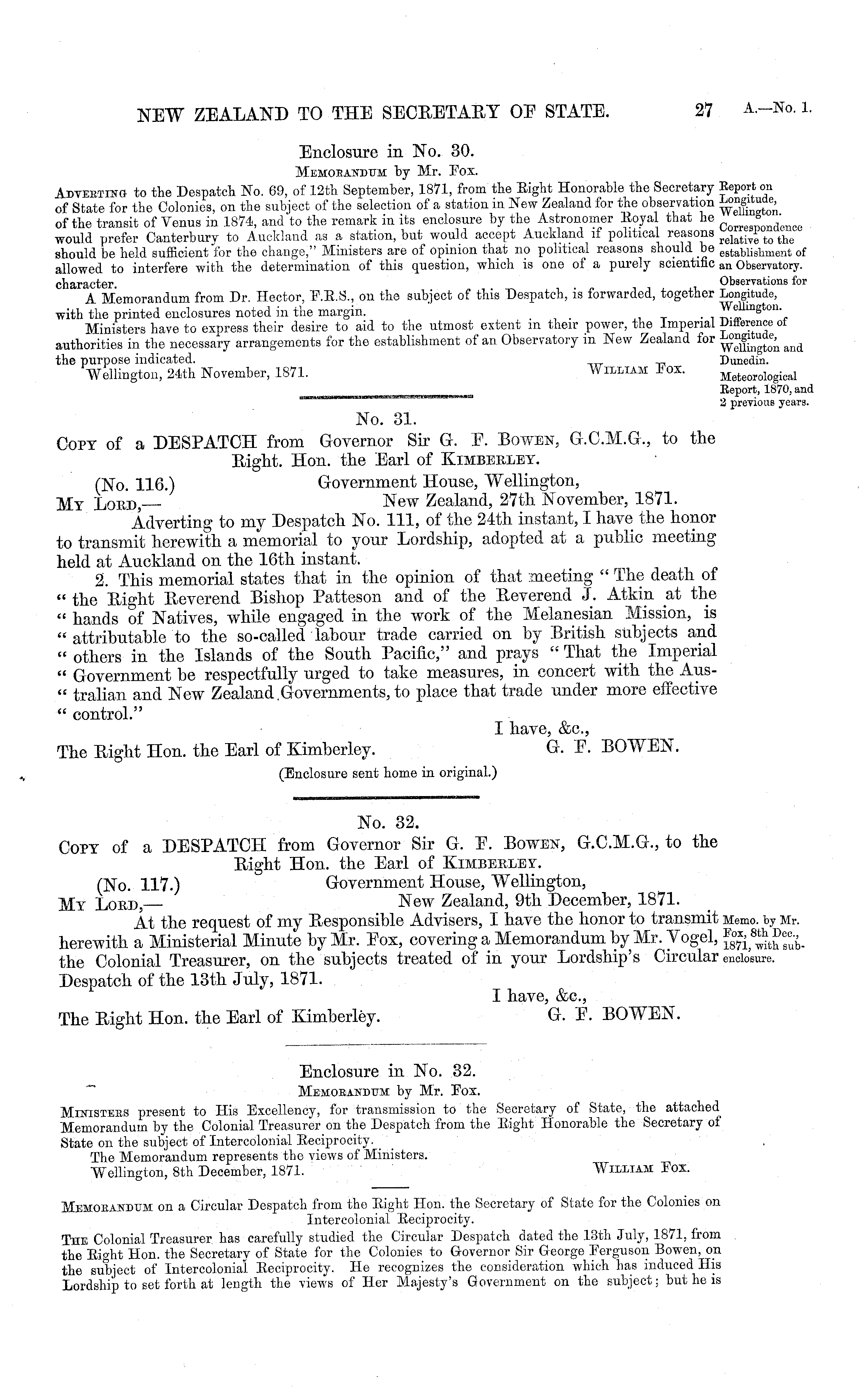 Enclosure in No. 30. Memorandum by Mr. Fox. Adyeeting to the Despatch No. 69, of 12th September, 1871, from the Sight Honorable the Secretary of State for the Colonies, on the subject of the selection of a station in New Zealand for the observation of the transit of Venus in 1874, and to the remark in its enclosure by the Astronomer Eoyal that he would prefer Canterbury to Auckland as a station, but would accept Auckland if political reasons should be held sufficient for the change," Ministers are of opinion that no political reasons should be allowed to interfere with the determination of this question, which is one of a purely scientific A Memorandum from Dr. Hector, F.K.S., on the subject of this Despatch, is forwarded, together with the printed enclosures noted in the margin. Ministers have to express their desire to aid to the utmost extent m their power, the Imperial authorities in the necessary arrangements for the establishment of an Observatory in New Zealand for the purpose indicated. Wellington, 24th November, 1871. William Fox.