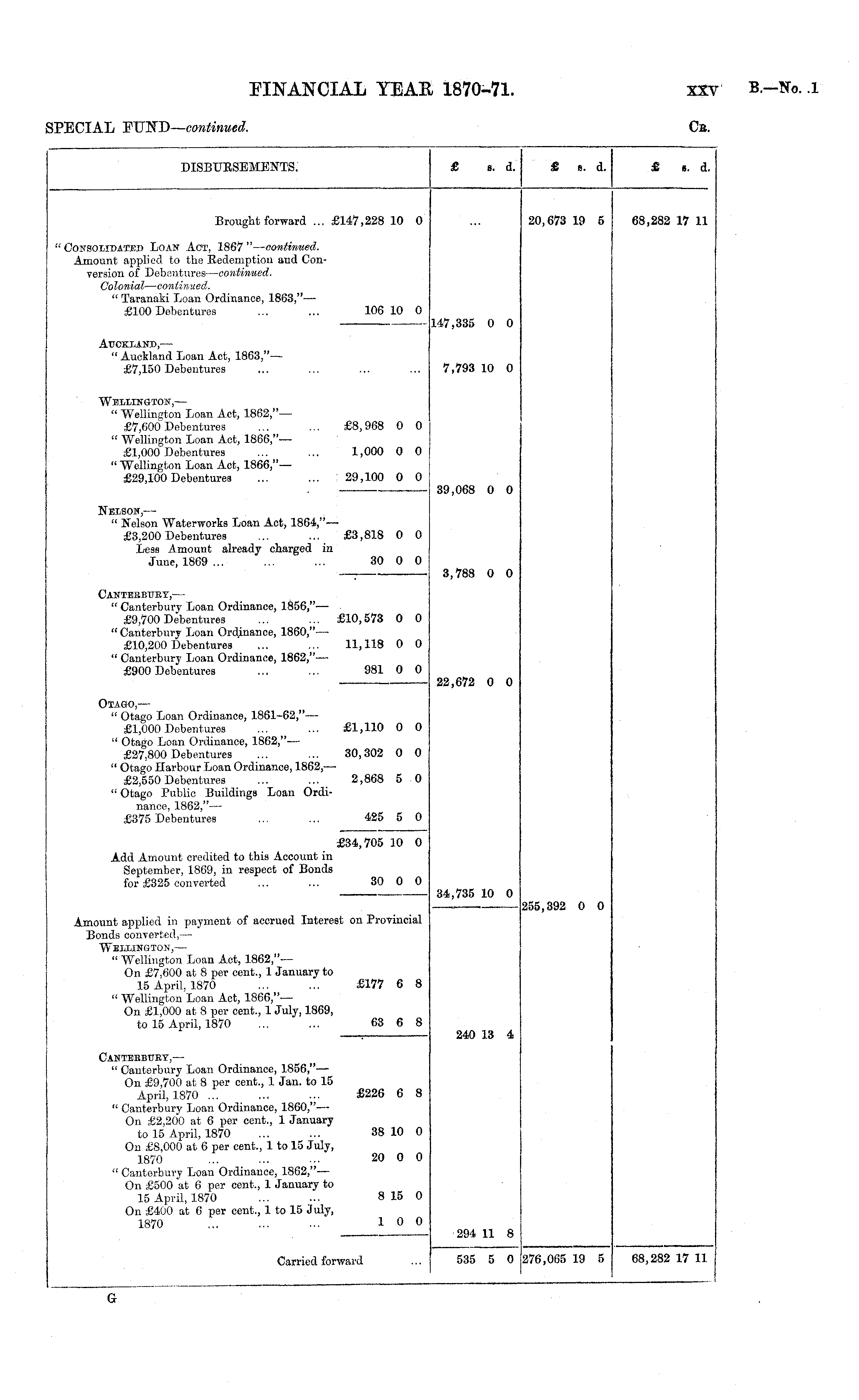 IPECIAL FUND— continued. Ce. DISBURSEMENTS. £ 8. d. £ e. d. £ b. a. Brought forward ... £147,228 10 0 20,673 19 6 68,282 17 11 " Consolidated Loan Act, 1867 " — continued. Amount applied to the Redemption and Conversion of Debentures — continued. Colonial — continued. " Taranaki Loan Ordinance, 1863," — £100 Debentures ... ... 106 10 0 Auckland, — " Auckland Loan Act, 1863,"— £7,150 Debentures 147,335 0 0 7,793 10 0 Wellington,— " Wellington Loan Act, 1862,"— £7,600 Debentures ... ... £8,968 0 0 " Wellington Loan Act, 1866,"' —■ £1,000 Debentures ... ... 1,000 0 0 " Wellington Loan Act, 1866,"— £29,100 Debentures ... ... 29,100 0 0 Nelson, —■ " Nelson Waterworks Loan Act, 1864,"— £3,200 Debentures ... ... £3,818 0 0 Less Amount already charged in June, 1869 ... ... ... 30 0 0 39,068 0 0 3,788 0 0 ClNTEBEimY, — " Canterbury Loan Ordinance, 1856," — £9,700 Debentures ... ... £10,573 0 0 "Canterbury Loan Ordinance, 1860," — £10,200 Debentures ... ... 11,118 0 0 " Canterbury Loan Ordinance, 1862," — £900 Debentures ... ... 981 0 0 22,672 0 0 Otaqo,— " Otago Loan Ordinance, 1861-62," — £1,000 Debentures ... ... £1,110 0 0 " Otago Loan Ordinance, 1862," — £27,800 Debentures ... ... 30,302 0 Oj " Otago Harbour Loan Ordinance, 1862, — £2,550 Debentures ... ... 2,868 5 0 " Otago Public Buildings Loan Ordinance, 1862," — £375 Debentures ... ... 425 5 0 £34,705 10 0 Add Amount credited to this Account in September, 1869, in respect of Bonds for £325 converted ... ... 30 0 0 34,735 10 0 Amount applied in payment of accrued Interest on Provincial Bonds converted, — Wellington,— " Wellington Loan Act, 1862,"— On £7,600 at 8 per cent., 1 January to 15 April, 1870 ... ... £177 6 8 " Wellington Loan Act, 1866,"— On £1,000 at 8 per cent., 1 July, 1869, to 15 April, 1870 ... ... 63 6 8 255,392 0 0 240 13 4 Cantekbttky,— " Canterbury Loan Ordinance, 1856," — On £9,700 at 8 per cent., 1 Jan. to 15 April, 1870 ... ... ... £226 6 8 " Canterbury Loan Ordinance, 1860," — On £2,200 at 6 per cent., 1 January to 15 April, 1870 ... ... 38 10 0 On £8,000 at 6 per cent., 1 to 15 July, 1870 ... 20 0 0 " Canterbury Loan Ordinance, 1862," — On £500 at 6 per cent., 1 January to 15 April, 1870 ... ... 8 15 0 On £400 at 6 per cent., 1 to 15 July, 1870 10 0 294, 11 8 Carried forward 68,282 17 11 535 5 0 276,065 19 5