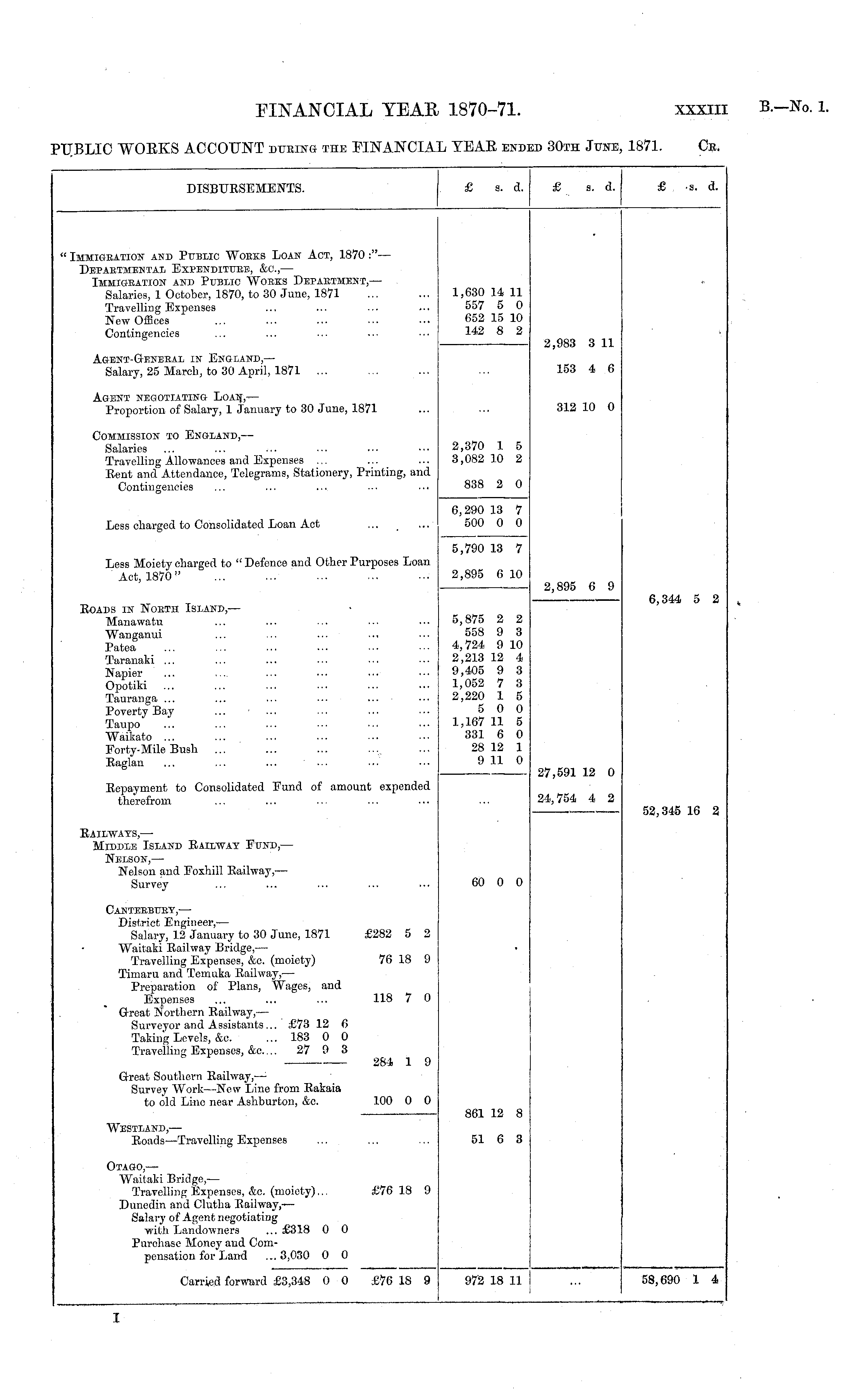 DISBURSEMENTS. £ s. d. £ s. d. £ s. d. " Immigration and Public Works Loan Act, 1870 :"— Departmental Expenditure, &c, — Immigration and Public Wobks Department,— Salaries, 1 October, 1870, to 30 June, 1871 ... ... I Travelling Expenses New Offices Contingencies 1,630 14 11 557 5 0 652 15 10 142 8 2 Agent-Genebal in England,— Salary, 25 March, to 30 April, 1871 ... 2,983 3 11 153 4 6 Agent negotiating Loan,— Proportion of Salary, 1 January to 30 June, 1871 312 10 0 Commission to England,— Salaries Travelling Allowances and Expenses ... Eent and Attendance, Telegrams, Stationery, Printing, and Contingencies 2,370 1 5 3,082 10 2 838 2 0 Less charged to Consolidated Loan Act 6,290 13 7 500 0 0 Less Moiety charged to " Defence and Other Purposes Loan Act, 1870" 5,790 13 7 2,895 6 10 2,895 6 9 Roads in North Island, — Manawatu Wanganui Patea Taranaki ... Napier Opotiki Tauranga ... ... ... ... ... Poverty Bay Taupo Waikato ... Forty-Mile Bush Raglan ... ... ... ... 5,875 2 2 558 9 3 4,724 9 10 2,213 12 4 9,405 9 3 1,052 7 3 2,220 1 5 5 0 0 1,167 11 5 331 6 0 28 12 1 9 11 0 6,344 5 2 Repayment to Consolidated Fund of amount expended therefrom 27,591 12 0 24,754 4 2 52,345 16 2 Railways,— Middle Island Railway Fund, — Nelson, — Nelson and Foxhill Railway,— Survey 60 0 0 Canterbury, — District Engineer, — Salary, 12 January to 30 June, 1871 £282 5 2 Waitaki Railway Bridge,— Travelling Expenses, &c. (moiety) 76 18 9 Timaru and Temuka Railway,— Preparation of Plans, Wages, and Expenses ... ... ... 118 7 0 Great Northern Railway,— Surveyor and Assistants... £73 12 0 Taking Levels, &c. ... 183 0 0 Travelling Expenses, &e.... 27 9 3 281 1 9 Great Southern Railway,—; Survey Work —New Line from Rakaia to old Line near Ashburton, &c. 100 0 0 861 12 8 Westland, — Roads —Travelling Expenses 51 6 3 Otago,— Waitaki Bridge, — Travelling Expenses, &c. (moiety)... £76 18 9 Dunedin and Clutha Railway,— Salary of Agent negotiating with Landowners ...£318 0 0 Paroliase Money and Compensation for Land ...3,030 0 0 Carried forward £3,348 0 0 £76 18 9 972 18 11 58,690 1 4