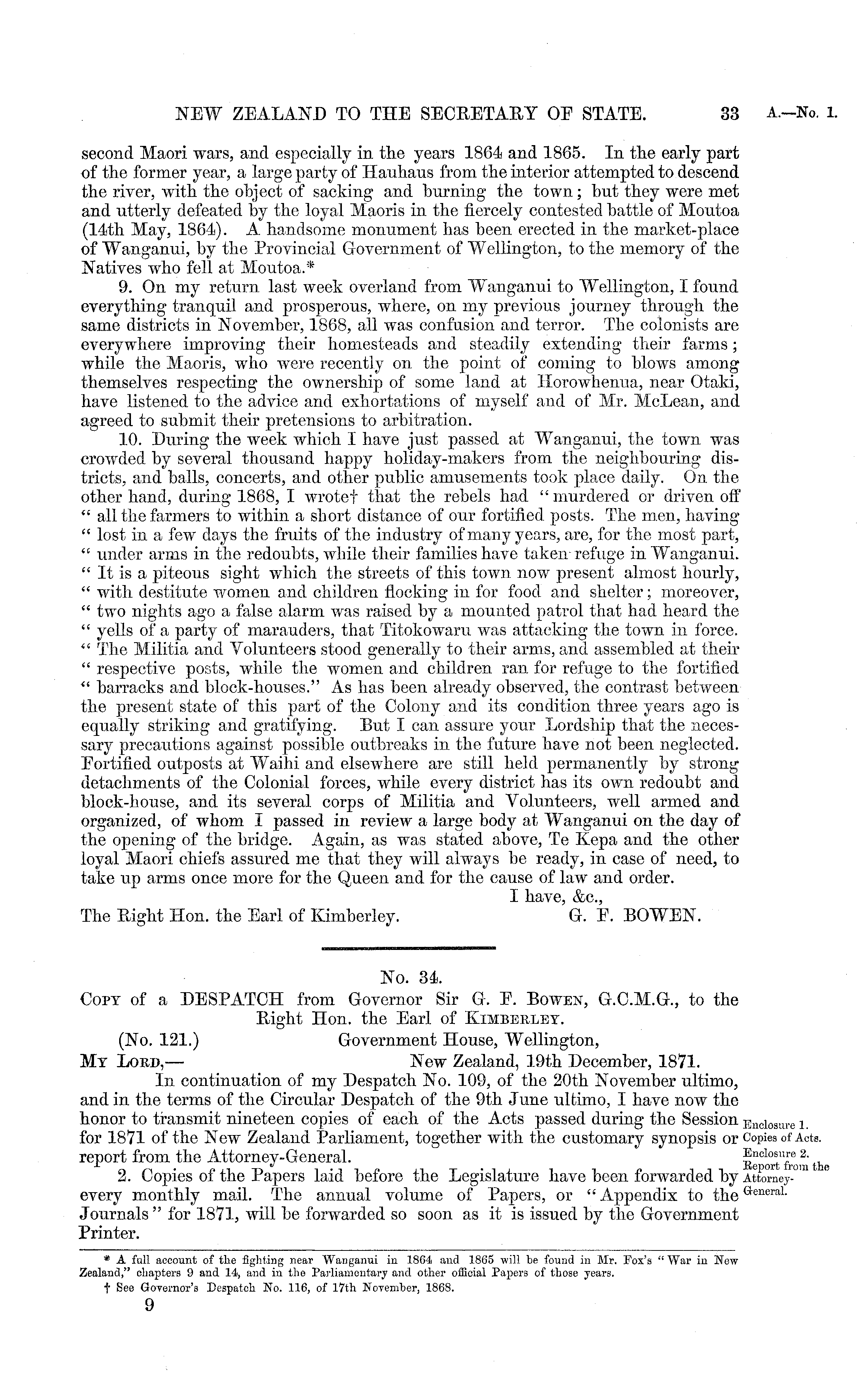 No. 34. Copt of a DESPATCH from Governor Sir G. P. Bowen, G.C.M.G., to the Right Hon. the Earl of Kimberley. (No. 121.) Government House, Wellington, My Lord, — New Zealand, 19th December, 1871. In continuation of my Despatch No. 109, of the 20th November ultimo, and in the terms of the Circular Despatch of the 9th June ultimo, I have now the honor to transmit nineteen copies of each of the Acts passed during the Session for 1871 of the New Zealand Parliament, together with the customary synopsis or report from the Attorney-General. 2. Copies of the Papers laid before the Legislature have been forwarded by every monthly mail. The annual volume of Papers, or " Appendix to the Journals " for 1871, will be forwarded so soon as it is issued by the Government Printer. * A full account of the fighting near Wanganul in 1864 and 1865 will be found in Mr. Fox's " War in Sew Zealand," chapters 9 and 14, and in tho Parliamentary and other official Papers of those years, t See Governor's Despatch No. 116, of 17th November, 1868. 9