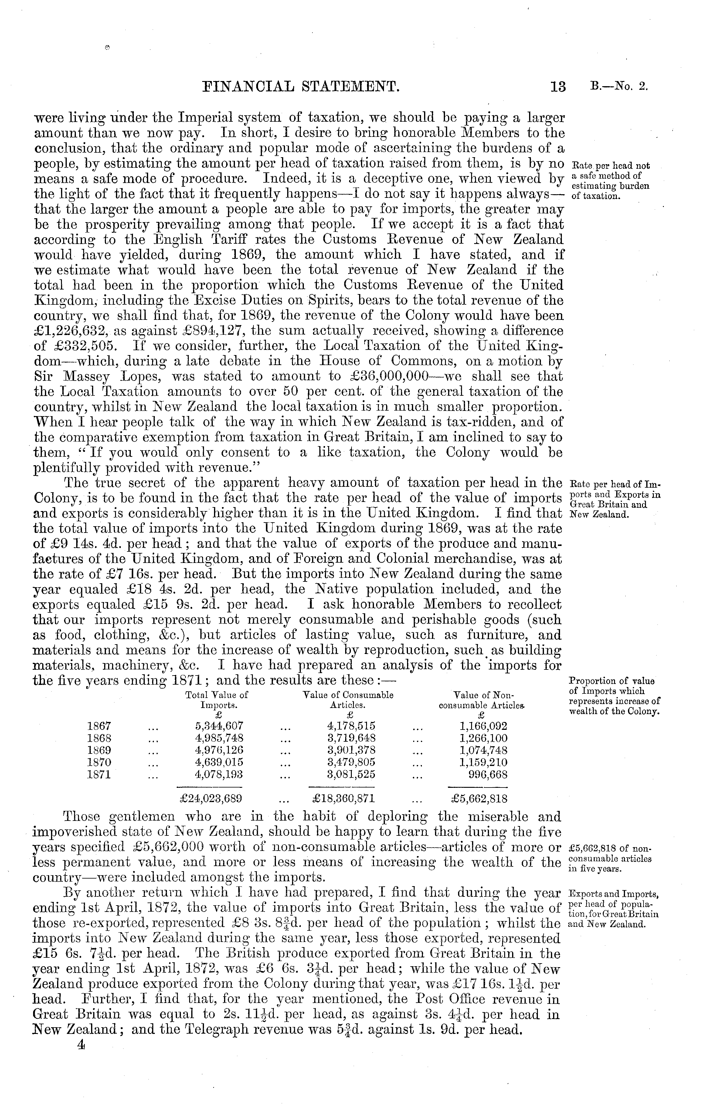 were living under the Imperial system of taxation, we should be paying a larger amount than we now pay. In short, I desire to bring honorable Members to the conclusion, that the ordinary and popular mode of ascertaining the burdens of a people, by estimating the amount per head of taxation raised from them, is by no means a safe mode of procedure. Indeed, it is a deceptive one, when viewed by the light of the fact that it frequently happens —I do not say it happens always — that the larger the amount a people are able to pay for imports, the greater may be the prosperity prevailing among that people. If we accept it is a fact that according to the English Tariff rates the Customs Revenue of New Zealand would have yielded, during 1869, the amount which I have stated, and if we estimate what would have been the total revenue of New Zealand if the total had been in the proportion which the Customs Revenue of the United Kingdom, including the Excise Duties on Spirits, bears to the total revenue of the country, we shall find that, for 1869, the revenue of the Colony would have been £1,226,632, as against £894,127, the sum actually received, showing a difference of £332,505. If we consider, further, the Local Taxation of the United Kingdom—which, during a late debate in the House of Commons, on a motion by Sir Massey Lopes, was stated to amount to £36,000,000 —we shall see that the Local Taxation amounts to over 50 per cent, of the general taxation of the country, whilst in New Zealand the local taxation is in much smaller proportion. When I hear people talk of the way in which New Zealand is tax-ridden, and of the comparative exemption from taxation in Great Britain, I am inclined to say to them, "If you would only consent to a like taxation, the Colony would be plentifully provided with revenue." The true secret of the apparent heavy amount of taxation per head in the Colony, is to be found in the fact that the rate per head of the value of imports and exports is considerably higher than it is in the United Kingdom. I find that the total value of imports into the United Kingdom during 1869, was at the rate of £9 14s. 4d. per head ; and that the value of exports of the produce and manufactures of the United Kingdom, and of Foreign and Colonial merchandise, was at the rate of £7 16s. per head. But the imports into New Zealand during the same year equaled £18 4s. 2d. per head, the Native population included, and the exports equaled £15 9s. 2d. per head. I ask honorable Members to recollect that our imports represent not merely consumable and perishable goods (such as food, clothing, &c), but articles of lasting value, such as furniture, and materials and means for the increase of wealth by reproduction, such as building materials, machinery, &c. I have had prepared an analysis of the imports for the five years ending 1871; and the results are these : — Total Value of Value of Consumable Value of NonImports. Articles. consumable Articles. 1867 ... 5,344,607 ... 4,178,515 ... 1,166,092 1868 ... 4,9,85,748 ... 3,719,648 ... 1,266,100 1869 ... 4.976,126 ... 3,901,378 ... 1,074,748 1870 ... 4,639,015 ... 3,479,805 ... 1,159,210 1871 ... 4,078,193 ... 3,081,525 ... 996,668 £24,023,689 ... £18,360,871 ... £5,662,818 Those gentlemen who are in the habit of deploring the miserable and impoverished state of New Zealand, should be happy to learn that during the five years specified £5,662,000 worth of non-consumable articles —articles of more or less permanent value, and more or less means of increasing the wealth of the country —were included amongst the imports. By another return which I have had prepared, I find that during the year ending Ist April, 1872, the value of imports into Great Britain, less the value of those re-exported, represented £8 3s. Bf-d. per head of the population ; whilst the imports into New Zealand during the same year, less those exported, represented £15 6s. 7-|cl. per head. The British produce exported from Great Britain in the year ending Ist April, 1872, was £6 6s. 3-|fi. per head; while the value of New Zealand produce exported from the Colony during that year, was £17 16s. 1-Jd. per head. Further, I find that, for the year mentioned, the Eost Office revenue in Great Britain was equal to 2s. ll|-d. per head, as against 3s. 4Jd, per head in New Zealand; and the Telegraph revenue was sfd. against Is. 9d. per head. 4