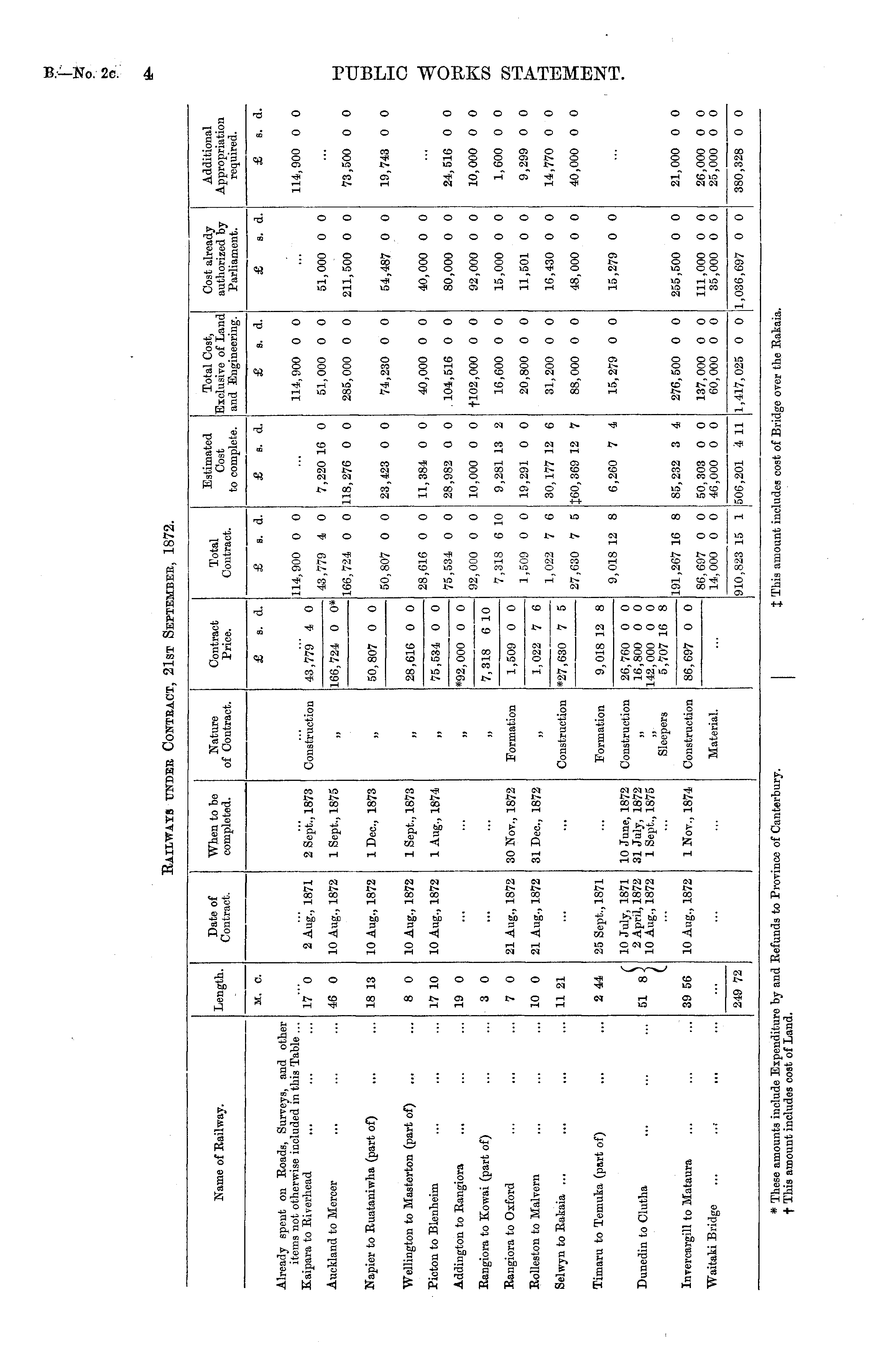 Name of Railway. Length. Date of Contract. When to be completed. Nature of Contract. Contract Price. Total Contract. Estimated Cost to complete. Total Cost, Exclusive of Land and Engineering. Cost already authorized by Parliament. Additional Appropriation required. - M. C. £ s. d. £ a. d. £ 8. d. £ a. d. £ s. d. £ s. d. Already spent on Roads, Surveys, and other items not otherwise included in this Table ... Kaipara to Eiverhead ... 2 Aug.', 1871 2 Sept'., 1873 43,779" 4 0 166, 724 0 0* 114, 900 0 0 114, 900 0 0 114, 900 0 0 17 0 Construction 7,220 16 0 Auckland to Mercer 46 0 10 Aug., 1872 43,779 4 0 51,000 0 0 51,000 0 0 1 Sept., 1875 M 166,724 0 0 118,276 0 0 285, 000 0 0 73,500 0 0 Napier to Euataniwha (part of) 18 13 211, 500 0 0 10 Aug., 1872 1 Dec, 1873 >> 50,807 0 0 50,807 0 0 23,423 0 0 74,230 0 0 54,487 0 0 19,743 0 0 Wellington to Masterton (part of) 8 0 10 Aug., 1872 1 Sept., 1873 a 28,616 0 0 75,534 0 0 28,616 0 0 11,384 0 0 40,000 0 0 17 10 40,000 0 0 Picton to Blenheim 10 Aug., 1872 1 Aug., 1874 i> Addington to Kangiora 19 0 *92, 000 0 0 7,318 6 10 75,534 0 0 28,982 0 0 ! 104,516 0 0 80,000 0 0 24,516 0 0 a 92,000 0 0 I 10,000 0 0 |102,000 0 0 92,000 0 0 10,000 0 0 Rangiora to Kowai (part of) 3 0 )> Rangiora to Oxford 7 0 21 Aug., 1872 30 Not., 1872 7,318 6 10 9,281 13 2 16,600 0 0 15,000 0 0 1,600 0 0 Formation 1,509 0 0 1,022 7 6 1,509 0 0 19,291 0 0 20,800 0 0 11,501 0 0 9,299 0 0 Rolleston to Malvern 10 0 21 Aug., 1872 31 Dec, 1872 >j Selwyn to Eakaia ... 11 21 *27,630 7 5 1,022 7 6 30,177 12 6 31,200 0 0 16,430 0 0 14,770 0 0 Construction 27,630 7 5 J60.369 12 7 88,000 0 0 48,000 0 0 40,000 0 0 Timaru to Temuka (part of) 2 44 25 Sept., 1871 Formation 9,018 12 8 6,260 7 4 15,279 0 0 15,279 0 0 Dunedin to Clutha 51 8j 10 July, 1871 2 April, 1872 10 Aug., 1872 10 June, 1872 31 July, 1872 1 Sept., 1875 Construction » 26,760 0 0 16,800 0 0 142,000 0 0 5,707 16 8 Invercargill to Mataura Sleepers 85,232 3 4 276,500 0 0 255,500 0 0 21,000 0 0 39 56 10 Aug., 1872 1 Nov., 1874 86,697 0 0 191,267 16 8 Construction Waitaki Bridge ... .. .• ,,, Material. 50,303 0 0 46,000 0 0 506,201 i 11 137, 000 0 0 60,000 0 0 111,000 0 0 35,000 0 0 26,000 0 0 25,000 0 0 14,000 0 0 249 72 910,823 15 1 380,328 0 0 1,417,025 0 0 1,036,697 0 0 * These amounts include Expenditure by and Refunds to Province of Canterbury. + This amount includes cost of Land. % This amount includes cost of Bridge over the Eakaia.