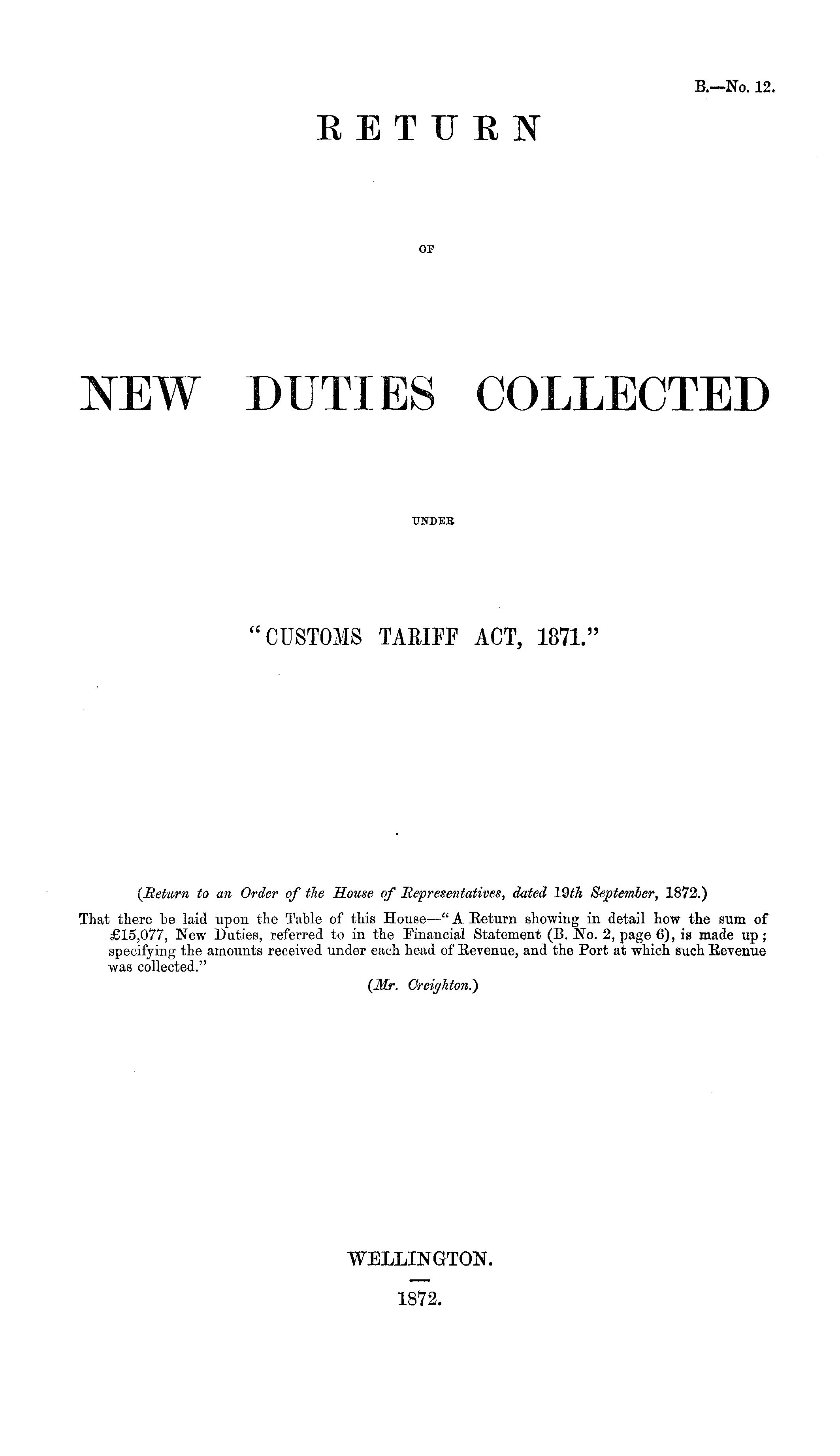 {Beturn to an Order of the House of Representatives, dated ldth September, 1872.) That there be laid upon the Table of this House—" A Beturn showing in detail how the sum of £15,077, New Duties, referred to in the Financial Statement (B. No. 2, page 6), is made up ; specifying the amounts received under each head of Revenue, and the Port at which such Eevenue was collected." (JKr. Greighton.)