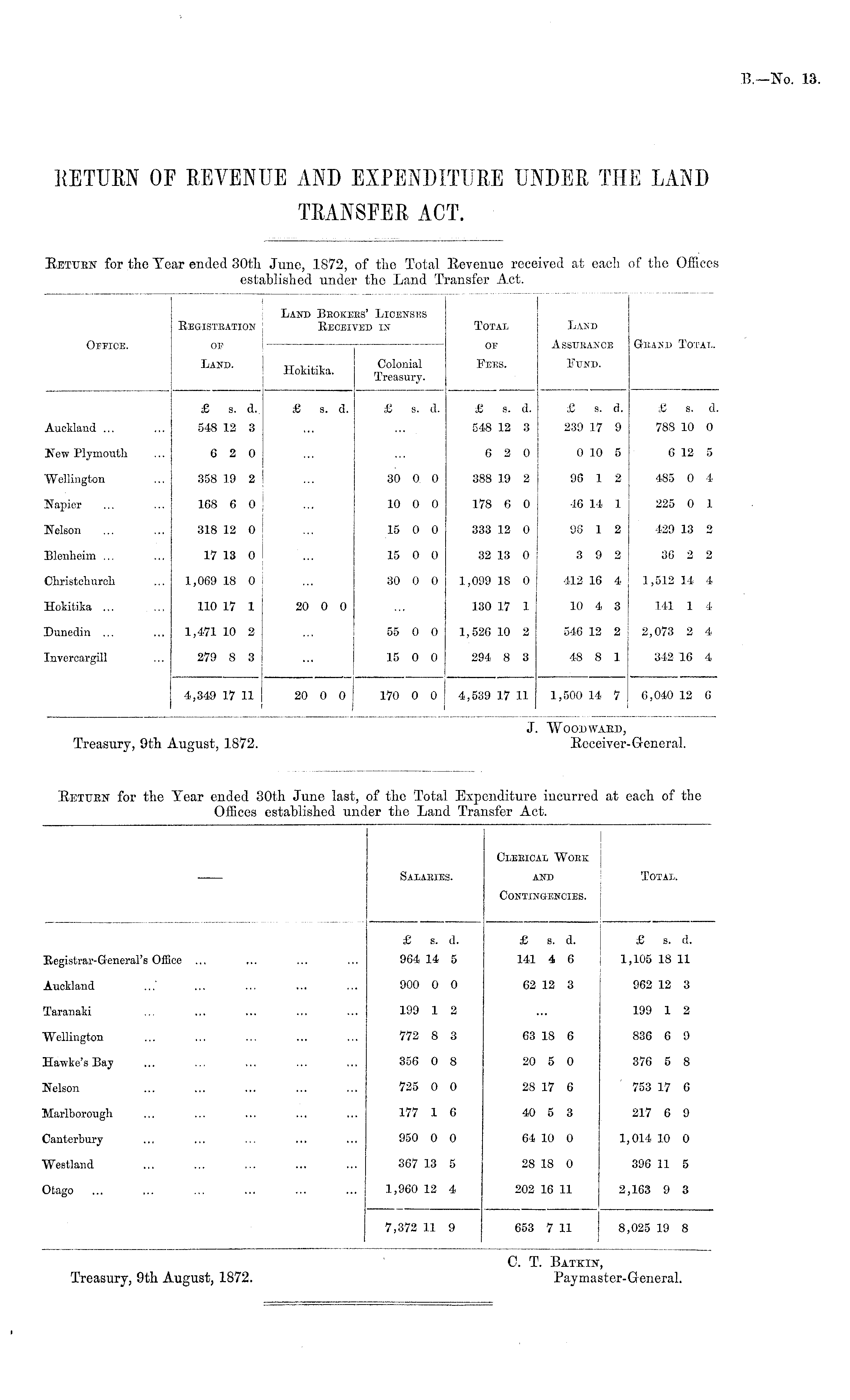RETURN for the Year ended 30th June, 1872, of the Total Revenue received at each of the Offices established under the Land Transfer Act.