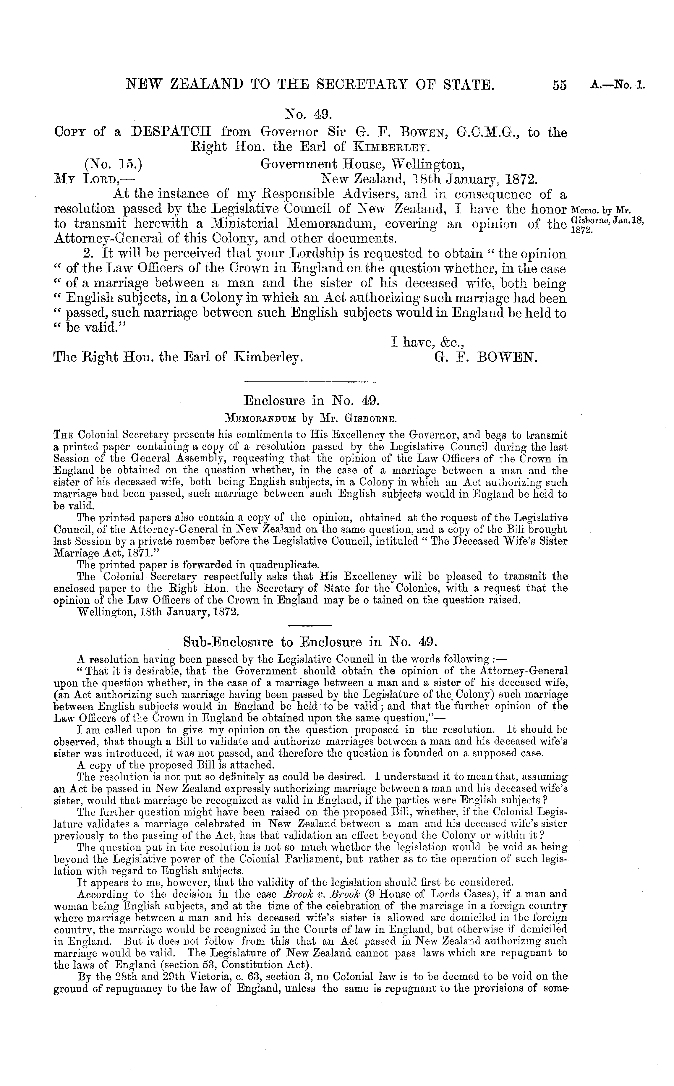 Enclosure in No. 49. Memorandum by Mr. Gisbobne. The Colonial Secretary presents his comliments to His Excellency the Governor, and begs to transmit a printed paper containing a copy of a resolution passed by the Legislative Council during the last Session of the General Assembly, requesting that the opinion of the Law Officers of the Crown in England be obtained on the question whether, in the case of a marriage between a man and the sister of his deceased wife, both being English subjects, in a Colony in which an Act authorizing such marriage had been passed, such marriage between such English subjects would in England be held to be valid. The printed papers also contain a copy of the opinion, obtained at the request of the Legislative Council, of the Attorney-General in New Zealand on the same question, and a copy of the Bill brought last Session by a private member before the Legislative Council, intituled " The Deceased Wife's Sister Marriage Act, 1871." The printed paper is forwarded in quadruplicate. The Colonial Secretary respectfully asks that His Excellency will be pleased to transmit the enclosed paper to the Eight Hon. the Secretary of State for the Colonies, with a request that the opinion of the Law Officers of the Crown in England may be o tamed on the question raised. Wellington, 18th January, 1872.