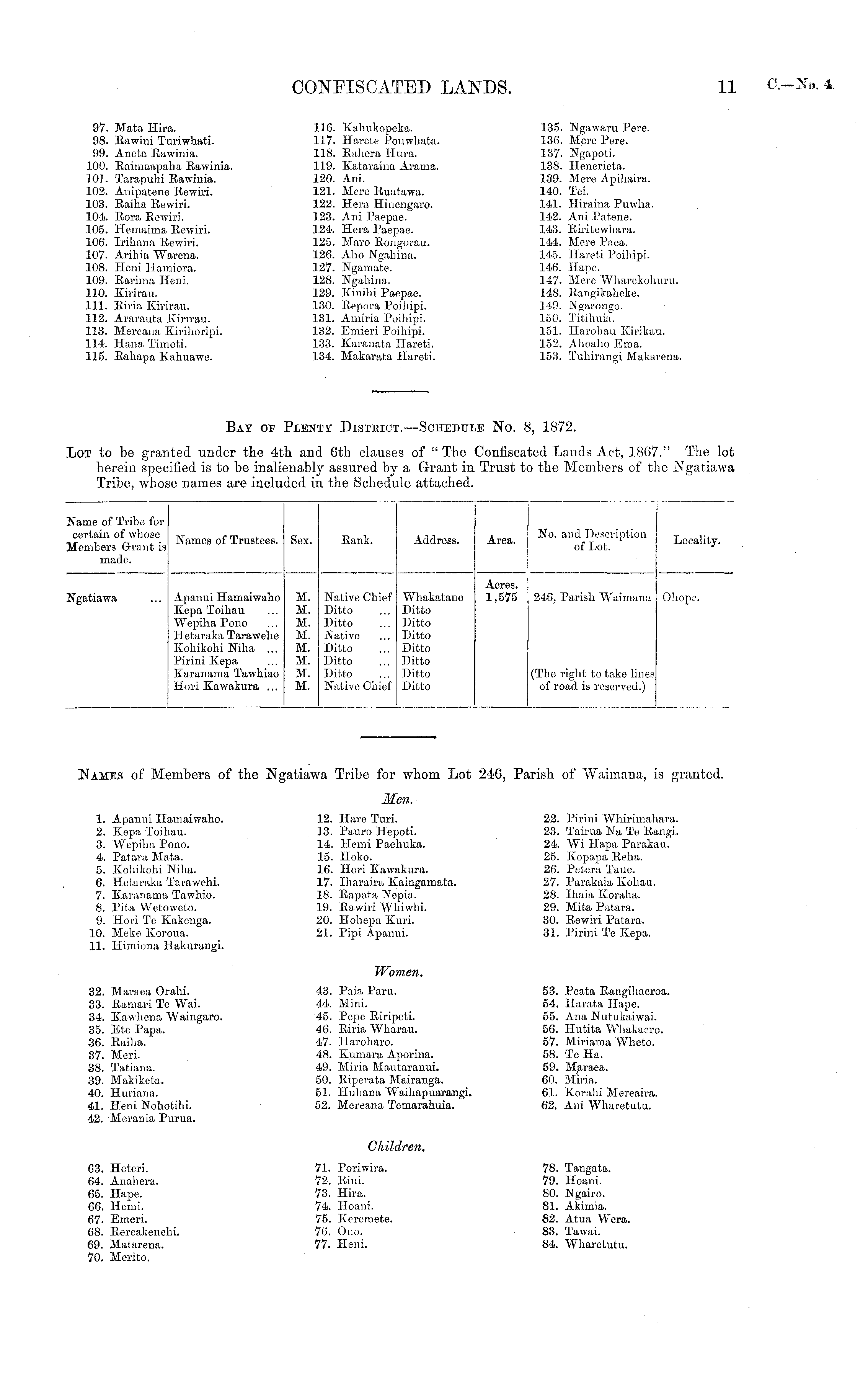 BAY OF PLENTY DISTRICT. —SCHEDULE No. 8, 1872. LOT to be granted under the 4th and 6th clauses of "The Confiscated Lands Act, 1867." The lot herein specified is to be inalienably assured by a Grant in Trust to the Members of the Ngatiawa Tribe, whose names are included in the Schedule attached.