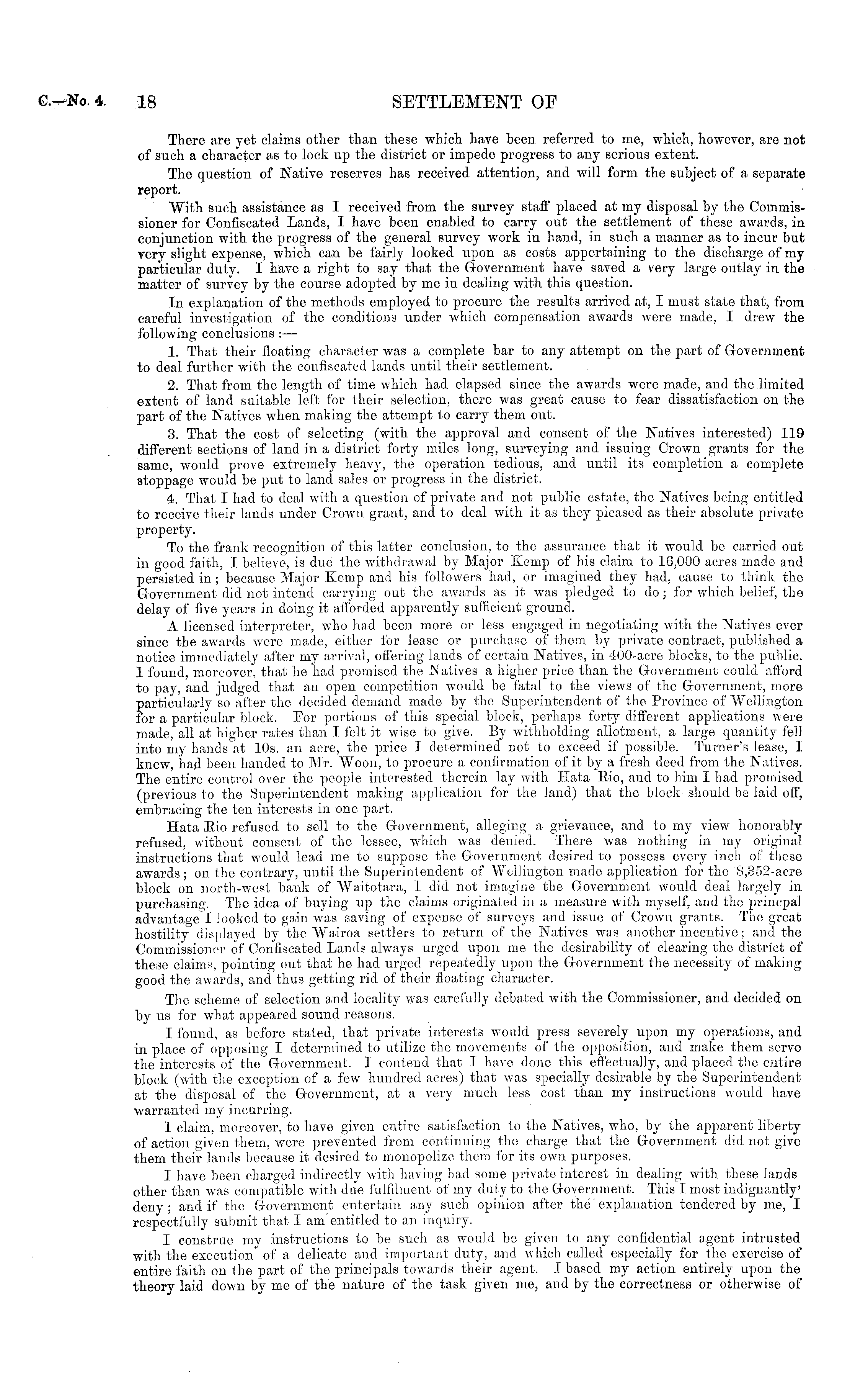 There are yet claims other than these which have been referred to me, which, however, arc not of such a character as to lock up the district or impede progress to any serious extent. The question of Native reserves has received attention, and will form the subject of a separate report. With such assistance as I received from the survey staff placed at my disposal by the Commissioner for Confiscated Lands, I have been enabled to carry out the settlement of these awards, in conjunction with the progress of the general survey work in hand, in such a manner as to incur but yery slight expense, which can be fairly looked upon as costs appertaining to the discharge of my particular duty. I have a right to say that the Government have saved a very large outlay in the matter of survey by the course adopted by me in dealing with this question. In explanation of the methods employed to procure the results arrived at, I must state that, from careful investigation of the conditions under which compensation awards were made, I drew the following conclusions : — 1. That their floating character was a complete bar to any attempt on the part of Government to deal further with the confiscated lands until their settlement. 2. That from the length of time which had elapsed since the awards were made, and the limited extent of land suitable left for their selection, there was great cause to fear dissatisfaction on the part of the Natives when making the attempt to carry them out. 3. That the cost of selecting (with the approval and consent of the Natives interested) 119 different sections of land in a district forty miles long, surveying and issuing Crown grants for the same, would prove extremely heavy, the operation tedious, and until its completion a complete stoppage would be put to land sales or progress in the district. 4. That I had to deal with a question of private and not public estate, the Natives being entitled to receive their lands under Crown grant, and to deal with it as they pleased as their absolute private property. To the frank recognition of this latter conclusion, to the assurance that it would be carried out in good faith, I believe, is duo the withdrawal by Major Kemp of his claim to 16,000 acres made and persisted in ; because Major Kemp and his followers had, or imagined they had, cause to think the Government did not intend carrying out the awards as it was pledged to do ; for which belief, the delay of five years in doing it afforded apparently sufficient ground. A licensed interpreter, who had been more or less engaged in negotiating with the Natives ever since the awards were made, either for lease or purchase of them by private contract, published a notice immediately after my arrival, offering lands of certain Natives, in 400-acre blocks, to the public. I found, moreover, that he had promised the Natives a higher price than the Government could afford to pay, and judged that an open competition would be fatal to the views of the Government, more particularly so after the decided demand made by the Superintendent of the Province of Wellington for a particular block. For portions of this special block, perhaps forty different applications were made, all at higher rates than I felt it wise to give. By withholding allotment, a large quantity fell into my hands at 10s. an acre, the price I determined not to exceed if possible. Turner's lease, I knew, had been handed to Mr. Woon, to procure a confirmation of it by a fresh deed from the Natives. The entire control over the people interested therein lay with Hata Bio, and to him I had promised (previous to the Superintendent making application for the land) that the block should be laid off, embracing the ten interests in one part. Hata Eio refused to sell to the Government, alleging a grievance, and to my view honorably refused, without consent of the lessee, which was denied. There was nothing in my original instructions that would lead me to suppose the Government desired to possess every inch of these awards; on the contrary, until the Superintendent of Wellington made application for the 8,352-acre block on north-west bank of Waitotara, I did not imagine the Government would deal largely in purchasing. The idea of buying up the claims originated in a measure with myself, and the princpal advantage I looked to gain was saving of expense of surveys and issue of Crown grants. The great hostility displayed by the Wairoa settlers to return of the Natives was another incentive; and the Commissioner of Confiscated Lands always urged upon me the desirability of clearing the district of these claims, pointing out that he had urged repeatedly upon the Government the necessity of making good the awards, and thus getting rid of their floating character. The scheme of selection and locality was carefully debated with the Commissioner, and decided on by us for what appeared sound reasons. I found, as before stated, that private interests would press severely upon my operations, and in place of opposing I determined to utilize the movements of the opposition, and make them serve the interests of the Government. I contend that I have done this effectually, and placed the entire block (with the exception of a few hundred acres) that was specially desirable by the Superintendent at the disposal of the Government, at a very much less cost than my instructions would have warranted my incurring. I claim, moreover, to have given entire satisfaction to the Natives, who, by the apparent liberty of action given them, were prevented from continuing the charge that the Government did not give them their lands because it desired to monopolize, them for its own purposes. I have been charged indirectly with having had some private interest in dealing with these lands other than was compatible with due fulfilment of my duty to the Government. This I most indignantly' deny; and if the Government entertain any such opinion after the explanation tendered by me