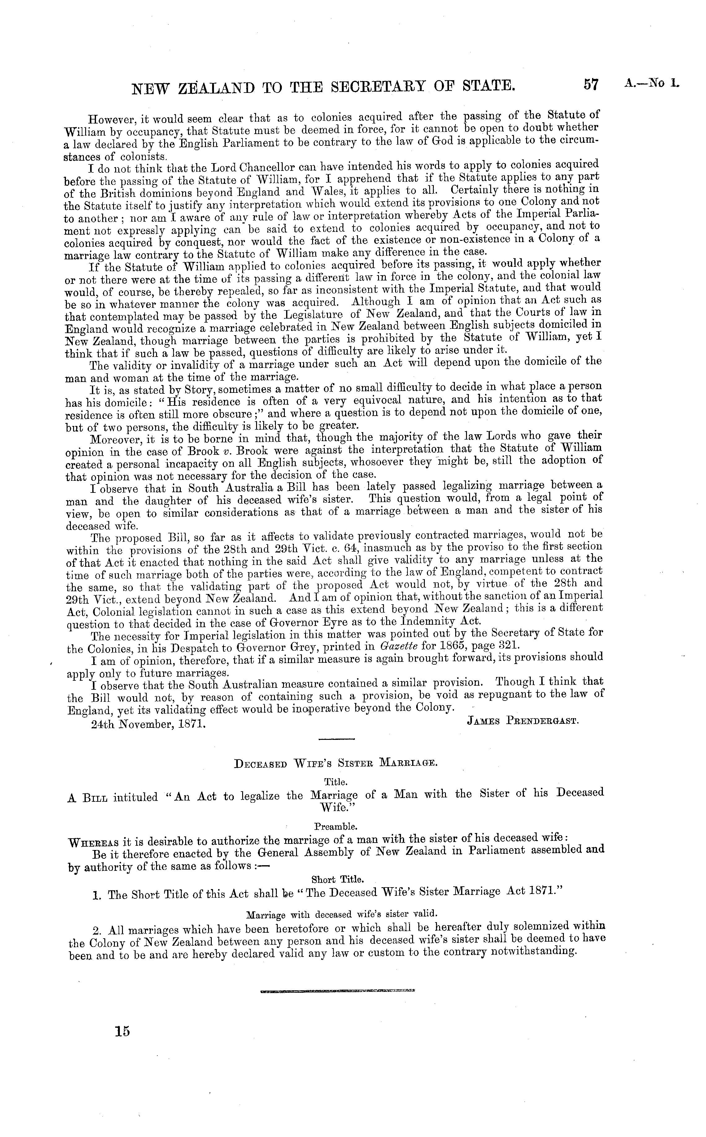 However, it would seem clear that as to colonies acquired after the passing of the Statute of William by occupancy, that Statute must be deemed in force, for it cannot be open to doubt whether a law declared by the English Parliament to be contrary to the law of God is applicable to the circumstances of colonists. . . , I do not think that the Lord Chancellor can have intended his words to apply to colonies acquired before the passing of the Statute of William, for I apprehend that if the Statute applies to any part of the British dominions beyond England and Wales, it applies to all. Certainly there is nothing in the Statute itself to justify any interpretation which would extend its provisions to one Colony and not to another ; nor ami aware of any rule of law or interpretation whereby Acts of the Imperial Parliament not expressly applying can "be said to extend to colonies acquired by occupancy and not to colonies acquired by conquest, nor would the fact of the existence or non-existence m a Colony ot a marriage law contrary to the Statute of William make any difference in the case. If the Statute of William applied to colonies acquired before its passing, it would apply whether or not there were at the time of its passing a different law in force in the colony, and the colonial law would, of course, be thereby repealed, so far as inconsistent with the Imperial Statute, and that would be so in whatever manner the colony was acquired. Although I am of opinion that an Act such as that contemplated may be passed by the Legislature of New Zealand, and that the Courts of law in England would recognize a marriage celebrated in New Zealand between English subjects domiciled m New Zealand, though marriage between the parties is prohibited by the Statute of William, yet I think that if such a law be passed, questions of difficulty are likely to arise under it The validity or invalidity of a marriage under such an Act will depend upon the domicile ot the man and woman at the time of the marriage. It is, as stated by Story, sometimes a matter of no small difficulty to decide in what place a person has his domicile: "His residence is often of a very equivocal nature, and his intention as to that residence is often still more obscure;" and where a question is to depend not upon the domicile of one, but of two persons, the difficulty is likely to be greater. _ Moreover, it is to be borne in mind that, though the majority of the law Lords who gave their opinion in the case of Brook v. Brook were against the interpretation that the Statute of William created a personal incapacity on all English subjects, whosoever they might be, still the adoption of that opinion was not necessary for the decision of the case. I observe that in South Australia a Bill has been lately passed legalizing marriage between a man and the daughter of his deceased wife's sister. This question would, from a legal point of view, be open to similar considerations as that of a marriage between a man and the sister of his deceased wife. . ~ ~ , The proposed Bill, so far as it affects to validate previously contracted marriages, would not be within the provisions of the 28th and 29th Vict. c. 64, inasmuch as by the proviso to the first section of that Act it enacted that nothing in the said Act shall give validity to any marriage unless at the time of such marriage both of the parties were, according to the law of England, competent to contract the same, so that the validating part of the proposed Act would not, by virtue of the 28th and 29th Vict., extend beyond New Zealand. And lam of opinion that, without the sanction of an Imperial Act, Colonial legislation cannot in such a case as this extend beyond New Zealand; this is a different question to that decided in the case of Governor Eyre as to the Indemnity Act. The necessity for Imperial legislation in this matter was pointed out by the Secretary of State for the Colonies, in his Despatch to Governor Grey, printed in Gazette for 1865, page 321. I am of opinion, therefore, that if a similar measure is again brought forward, its provisions should apply only to future marriages. .. I observe that the South Australian measure contained a similar provision. 1 hough 1 think that the Bill would not, by reason of containing such a provision, be void as repugnant to the law of England, yet its validating effect would be inoperative beyond the Colony. 24th November, 1871. James Peendeegast.
