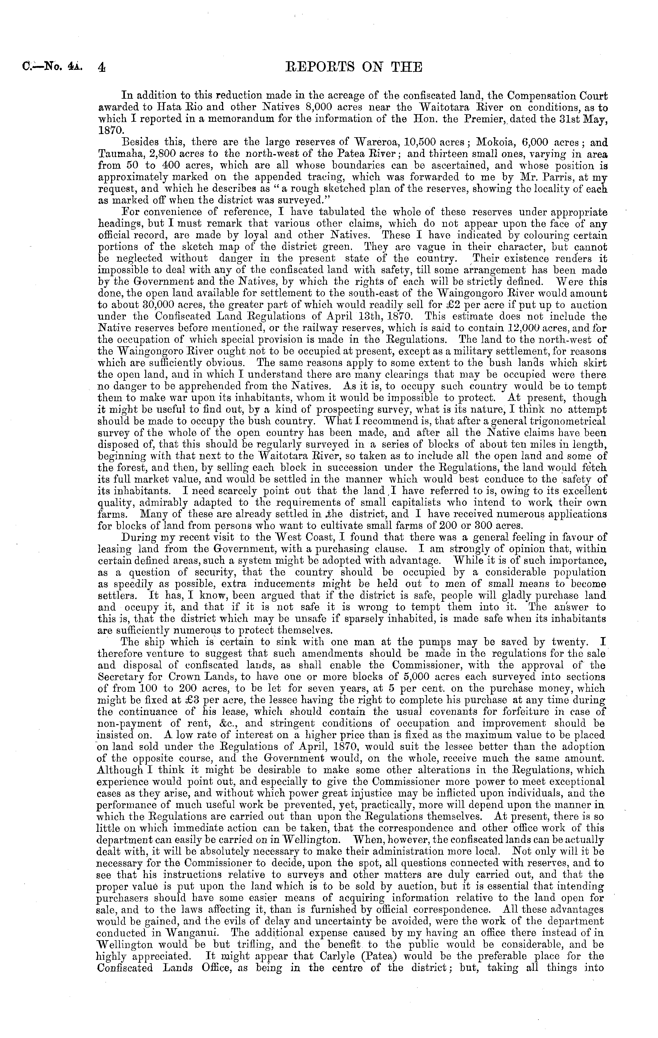 In addition to this reduction made in the acreage of the confiscated land, the Compensation Court awarded to Hata Bio and other Natives 8,000 acres near the Waitotara River on conditions, as to which I reported in a memorandum for the information of the Hon. the Premier, dated the 31st May, 1870. Besides this, there are the large reserves of Wareroa, 10,500 acres ; Mokoia, 6,000 acres ; and Taumaha, 2,800 acres to the north-west of the Patea River; and thirteen small ones, varying in area from 50 to 400 acres, which are all whose boundaries can be ascertained, and whose position is approximately marked on the appended tracing, which was forwarded to me by Mr. Parris, at my request, and which he describes as " a rough sketched plan of the reserves, showing the locality of each as marked off when the district was surveyed." For convenience of reference, I have tabulated the whole of these reserves under appropriate headings, but I must remark that various other claims, which do not appear upon the face of any official record, are made by loyal and other Natives. These I have indicated by colouring certain portions of the sketch map of the district green. They are vague in their character, but cannot be neglected without danger in the present state of the country. Their existence renders it impossible to deal with any of the confiscated land with safety, till some arrangement has been made by the Government and the Natives, by which the rights of each will be strictly defined. Were this done, the open land available for settlement to the south-east of the Waingongoro River would amount to about 30,000 acres, the greater part of which would readily sell for £2 per acre if put up to auction under the Confiscated Land Regulations of April 13th, 1870. This estimate does not include the Native reserves before mentioned, or the railway reserves, which is said to contain 12,000 acres, and for the occupation of which special provision is made in the Regulations. The land to the north-west of the Waingongoro River ought not to be occupied at present, except as a military settlement, for reasons which are sufficiently obvious. The same reasons apply to some extent to the bush lands which skirt the open land, and in which I understand there are many clearings that may be occupied were there no danger to be apprehended from the Natives. As it is, to occupy such country would be to tempt them to make war upon its inhabitants, whom it would be impossible to protect. At present, though it might be useful to find out, by a kind of prospecting survey, what is its nature, I think no attempt should be made to occupy the bush country. What I recommend is, that after a general trigonometrical survey of the whole of the open country has been made, and after all the Native claims have been disposed of, that this should be regularly surveyed in a series of blocks of about ten miles in length, beginning with that next to the Waitotara River, so taken as to include all the open land and some of the forest, and then, by selling each block in succession under the Regulations, the land would fetch its full market value, and would be settled in the manner which would best conduce to the safety of its inhabitants. I need scarcely point out that the land I have referred to is, owing to its excellent quality, admirably adapted to the requirements of small capitalists who intend to work their own farms. Many of these are already settled in .the district, and I have received numerous applications for blocks of land from persons who want to cultivate small farms of 200 or 300 acres. During my recent visit to the West Coast, I found that there was a general feeling in favour of leasing land from the Government, with a purchasing clause. lam strongly of opinion that, within certain defined areas, such a system might be adopted with advantage. While it is of such importance, as a question of security, that the country should be occupied by a considerable population as speedily as possible, extra inducements might be held out to men of small means to become settlers. It has, I know, been argued that if the district is safe, people will gladly purchase land and occupy it, and that if it is not safe it is wrong to tempt them into it. The answer to this is, that the district which may be unsafe if sparsely inhabited, is made safe when its inhabitants are sufficiently numerous to protect themselves. The ship which is certain to sink with one man at the pumps may be saved by twenty. I therefore venture to suggest that such amendments should be made in the regulations for the sale and disposal of confiscated lands, as shall enable the Commissioner, with the approval of the Secretary for Crown Lands, to have one or more blocks of 5,000 acres each surveyed into sections of from 100 to 200 acres, to be let for seven years, at 5 per cent, on the purchase money, which might be fixed at £3 per acre, the lessee having the right to complete his purchase at any time during the continuance of his lease, which should contain the usual covenants for forfeiture in case of non-payment of rent, &c, and stringent conditions of occupation and improvement should be insisted on. A low rate of interest on a higher price than is fixed as the maximum value to be placed on land sold under the Regulations of April, 1870, would suit the lessee better than the adoption of the opposite course, and the Government would, on the whole, receive much the same amount. Although I think it might be desirable to make some other alterations in the Regulations, which experience would point out, and especially to give the Commissioner more power to meet exceptional cases as they arise, and without which power great injustice may be inflicted upon individuals, and the performance of much useful work be prevented, yet, practically, more will depend upon the manner in which the Regulations are carried out than upon the Regulations themselves. At present, there is so little o