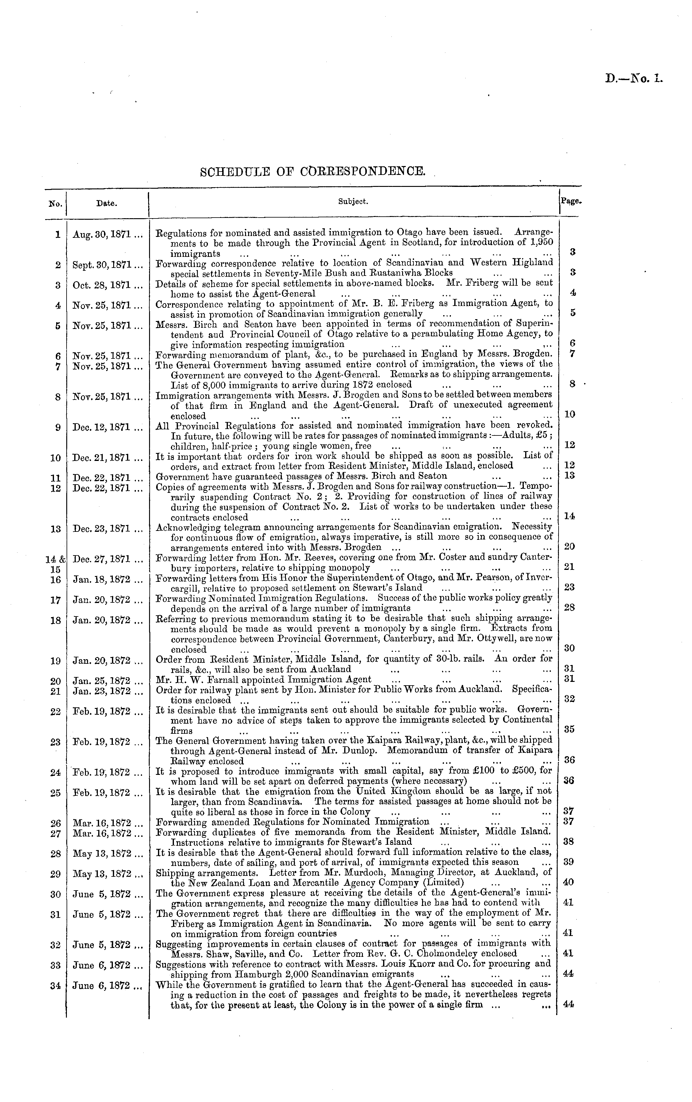 No. Date. Subject. Page, Aug. 30,1871... Regulations for nominated and assisted immigration to Otago have been issued. Arrangements to be made through the Provincial Agent in Scotland, for introduction of 1,950 immigrants ... ... ... ■■■ ... ... Forwarding correspondence relative to location of Scandinavian and Western Highland special settlements in Seventy-Mile Bush and Ruataniwha Blocks Details of scheme for special settlements in above-named blocks. Mr. Friberg will be sent home to assist the Agent-General Correspondence relating to appointment of Mr. B. E. Friberg as Immigration Agent, to assist in promotion of Scandinavian immigration generally Messrs. Birch and Seaton have been appointed in terms of recommendation of Superintendent and Provincial Council of Otago relative to a perambulating Home Agency, to give information respecting immigration Forwarding memorandum of plant, &c, to be purchased in England by Messrs. Brogden. The General Government having assumed entire control of immigration, the views of the Government are conveyed to the Agent-General. Remarks as to shipping arrangements. List of 8,000 immigrants to arrive during 1872 enclosed Immigration arrangements with Messrs. J. Brogden and Sons to be settled between members of that firm in England and the Agent-General. Draft of unexecuted agreement enclosed All Provincial Regulations for assisted and nominated immigration have been revoked. In future, the following will be rates for passages of nominated immigrants: —Adults, £5 ; children, half-price ; young single women, free It is important that orders for iron work should be shipped as soon as possible. List of orders, and extract from letter from Resident Minister, Middle Island, enclosed Government have guaranteed passages of Messrs. Birch and Seaton Copies of agreements with Messrs. J. Brogden and Sons for railway construction —1. Temporarily suspending Contract No. 2 ; 2. Providing for construction of lines of railway during the suspension of Contract No. 2. List of works to be undertaken under these contracts enclosed Acknowledging telegram announcing arrangements for Scandinavian emigration. Necessity for continuous flow of emigration, always imperative, is still more so in consequence of arrangements entered into with Messrs. Brogden ... Forwarding letter from Hon. Mr. Reeves, covering one from Mr. Coster and sundry Canterbury importers, relative to shipping monopoly Forwarding letters from His Honor the Superintendent of Otago, and Mr. Pearson, of Invercargill, relative to proposed settlement on Stewart's Island Forwarding Nominated Immigration Regulations. Success of the public works policy greatly depends on the arrival of a large number of immigrants Referring to previous memorandum stating it to be desirable that such shipping arrangements should be made as would prevent a monopoly by a single firm. Extracts from correspondence between Provincial Government, Canterbury, and Mr. Ottywell, are now enclosed Order from Resident Minister, Middle Island, for quantity of 30-lb. rails. An order for rails, &c, will also be sent from Auckland Mr. H. W. Farnall appointed Immigration Agent Order for railway plant sent by Hon. Minister for Public Works from Auckland. Specifications enclosed ... It is desirable that the immigrants sent out should be suitable for public works. Government have no advice of steps taken to approve the immigrants selected by Continental firms The General Government having taken over tho Kaipara Railway, plant, &c, will be shipped through Agent-General instead of Mr. Dunlop. Memorandum of transfer of Kaipara Railway enclosed It is proposed to introduce immigrants with small capital, say from £100 to £500, for whom land will be set apart on deferred payments (where necessary) It is desirable that the emigration from the United Kingdom should be as large, if not larger, than from Scandinavia. The terms for assisted passages at home should not be quite so liberal as those in force in the Colony Forwarding amended Regulations for Nominated Immigration ... Forwarding duplicates of five memoranda from the Resident Minister, Middle Island. Instructions relative to immigrants for Stewart's Island It is desirable that the Agent-General should forward full information relative to the class, numbers, date of sailing, and port of arrival, of immigrants expected this Beason Shipping arrangements. Letter from Mr. Murdoch, Managing Director, at Auckland, of the New Zealand Loan and Mercantile Agency Company (Limited) The Government express pleasure at receiving the details of the Agent-General's immigration arrangements, and recognize the many difficulties he has had to contend with The Government regret that there are difficulties in the way of the employment of Mr. Friberg as Immigration Agent in Scandinavia. No more agents will be sent to carry on immigration from foreign countries Suggesting improvements in certain clauses of contract for passages of immigrants with Messrs. Shaw, Saville, and Co. Letter from Rev. G. C. Cholmondeley enclosed Suggestions with reference to contract with Messrs. Louis Knorr and Co. for procuring and shipping from Hamburgh 2,000 Scandinavian emigrants While the Government is gratified to learn that the Agent-General has succeeded in causing a reduction in the cost of passages and freights to be made, it nevertheless regrets that, for the present at least, the Colony is in the power of a single firm ... ... Sept. 30,1871... 3 2 3 3 Oct. 28,1871 ... 4 Nov. 25,1871... 4 5 5 Nov. 25,1871... Nov. 25,1871... Nov. 25,1871... 6 7 6 7 Nov. 25,1871 ... Dec. 12,1871 ... 10 Dec. 21,1871 ... 12 10 12 13 11 12 Dec. 22,1871 ... Dec. 22,1871 ... 13 Dec. 23,1871 ... It Dec. 27,1871 ... 20 A& 15 16 Jan. 18,1872 ... 21 23 17 Jan. 20,1872 ... 28 18 Jan. 20,1872 ... Jan. 20,1872 ... 30 19 20 21 Jan. 25,1872 ... Jan. 23,1872 ... 31 31 32 22 Feb. 19,1872 ... 23 Feb. 19,1872 ... 35 24 Feb. 19,1872 ... 3G 3G 25 Feb. 19,1872 ... Mar. 16