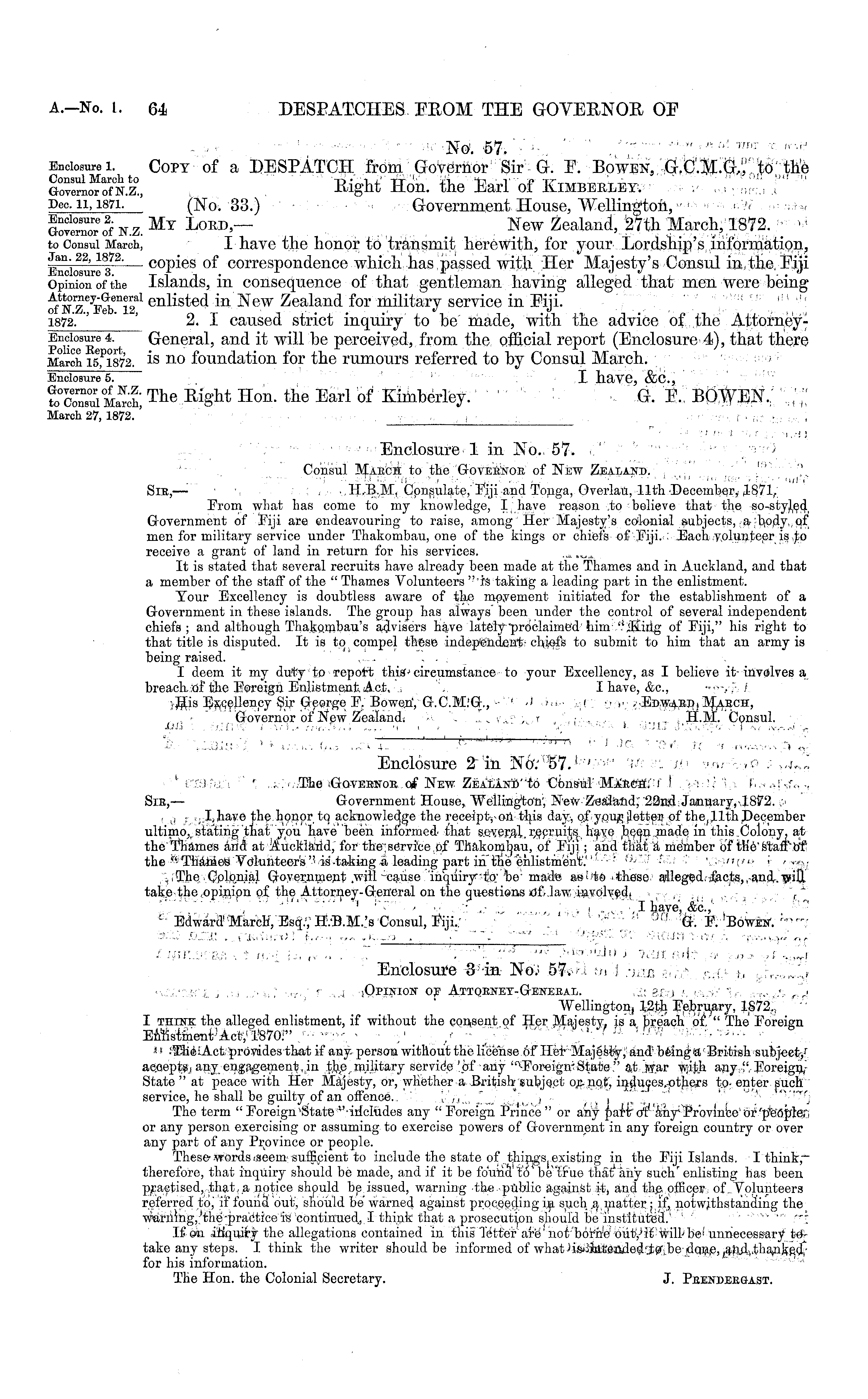 Enclosure 1 in No. 57. Consul Maech to the Goteenoe of New Zealand. ■■; A tlf 111 I'd .~ i : ■'~-. . ' ' ■-■>.-,., >: ■ r, ■ ~,).,-' Sic, — ; ,„■■■ ■ H.B.M, Consulate, Fiji and Tonga, Overlan, 11th December,lB7l, From what has come to my knowledge, I have reason to believe that the so-styl l ed h Government of Fiji are endeavouring to raise, among Her Majesty's colonial subjects, a biody,of men for military service under Thakombau, one of the kings or chiefs of Fiji. . .Each volunteer is^o receive a grant of land in return for his services. It is stated that several recruits have already been made at the Thames and in Auckland, and that a member of the staff of the " Thames Volunteers "is taking a leading part in the enlistment. Tour Excellency is doubtless aware of the mpyement initiated for the establishment of a Government in these islands. The group has always been under the control of several independent chiefs; and although Thakombau's axlvisers have lately "proclaimed him" iKlirig of Fiji," his right to that title is disputed. It is to compel these independent- chiefs to submit to him that an army is being raised. - . , I deem it my duty to report this' circumstance to your Excellency, as I believe it-involves a breach :of the Foreign Enlistment Act, i I have, &c, ••■->*■/ >His Excellency Sir George F, Boweri, G.C.M.'G., -' '»J ».■>■■ ;-r •, ~ ,<.Edw,abdiM,abch, Governor of New Zealand: - . ~ ; i x <* ■r,■ . i H.M. Consul. X.!!i . .;<;fi'; ; -~■;.-;;:,,:- ~ q , .. ' '~^ '■■■■'■■•:■■■ 1 ■:-; 1: ..'.;.,.. ■-,] -~ A -^-,.^> «.:. - -* 1 ' i ! . ' ''