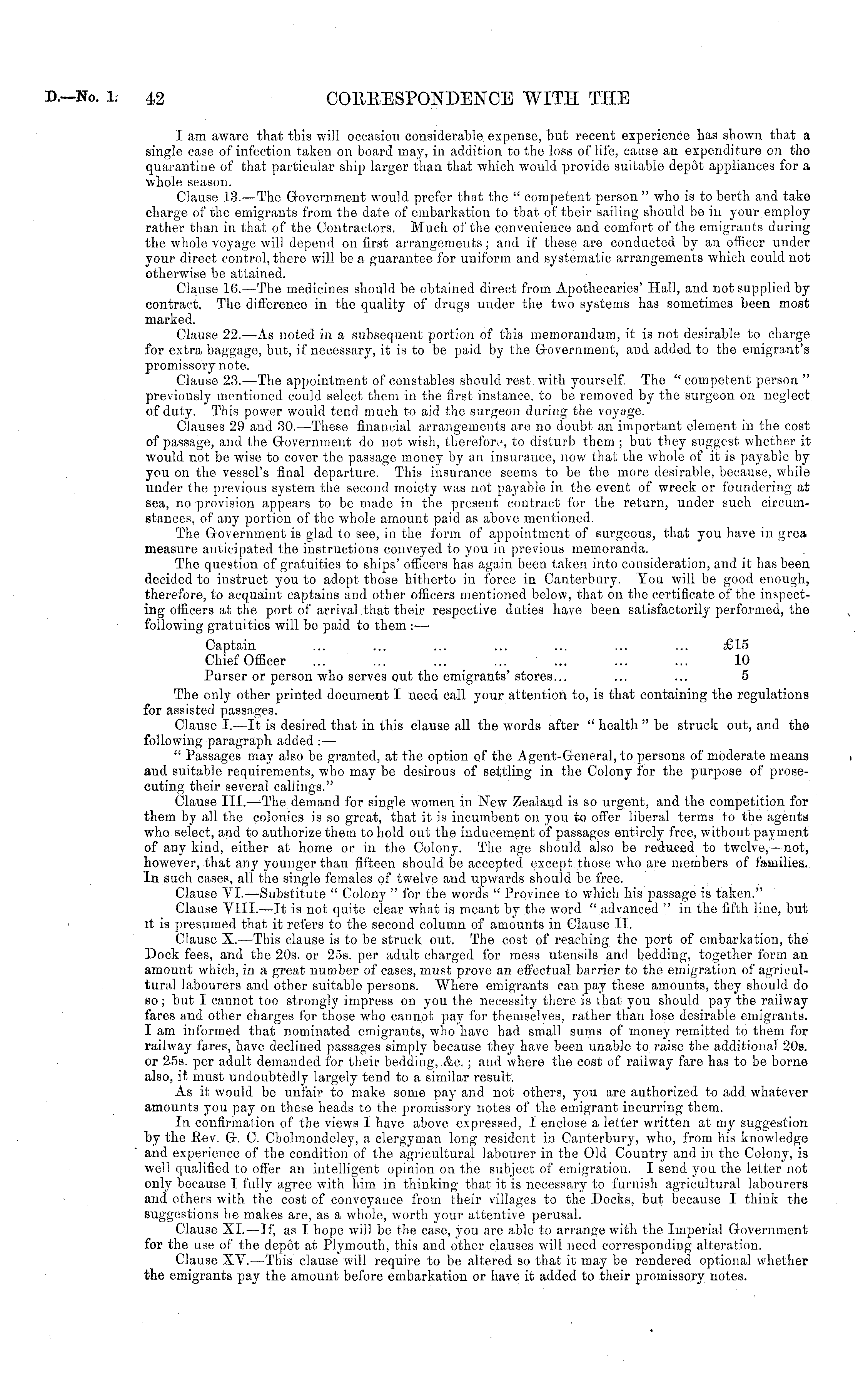 I am aware that this will occasion considerable expense, but recent experience has shown that a single case of infection taken on board may, in addition to the loss of life, cause an expenditure on th© quarantine of that particular ship larger than that which would provide suitable depot appliances for a whole season. Clause 13.—The Government would prefer that the " competent person " who is to berth and take charge of the emigrants from the date of embarkation to that of their sailing should be in your employ rather than in that of the Contractors. Much of the convenience and comfort of the emigrants during the whole voyage will depend on first arrangements; and if these are conducted by an officer under your direct control, there will be a guarantee for uniform and systematic arrangements which could not otherwise be attained. Clause 10.—The medicines should be obtained direct from Apothecaries' Hall, and not supplied by contract. The difference in the quality of drugs under the two systems has sometimes been most marked. Clause 22.—As noted in a subsequent portion of this memorandum, it is not desirable to charge for extra baggage, but, if necessary, it is to be paid by the Government, and added to the emigrant's promissory note. Clause 23.—The appointment of constables should rest, with yourself The "competent person " previously mentioned could select them in the first instance, to be removed by the surgeon on neglect of duty. This power would tend much to aid the surgeon during the voyage. Clauses 29 and 30. —These financial arrangements are no doubt an important element in the cost of passage, and the Government do not wish, therefor;', to disturb them ; but they suggest whether it would not be wise to cover the passage money by an insurance, now that the whole of it is payable by you on the vessel's final departure. This insurance seems to be the more desirable, because, while under the previous system the second moiety was not payable in the event of wreck or foundering at sea, no provision appears to be made in the present contract for the return, under such circumstances, of any portion of the whole amount paid as above mentioned. The Government is glad to see, in the form of appointment of surgeons, that you have in grea measure anticipated the instructions conveyed to you in previous memoranda. The question of gratuities to ships' officers has again been taken into consideration, and it has been decided to instruct you to adopt those hitherto in force in Canterbury. You will be good enough, therefore, to acquaint captains and other officers mentioned below, that on the certificate of the inspecting officers at the port of arrival that their respective duties have been satisfactorily performed, the following gratuities will be paid to them : —• Captain ... ... ... ... ... ... ... £15 Chief Officer ... ... ... ... ... ... ... 10 Purser or person who serves out the emigrants'stores... ... ... 5 The only other printed document I need call your attention to, is that containing the regulations for assisted passages. Clause I.—lt is desired that in this clause all the words after " health " be struck out, and the following paragraph added : — " Passages may also be granted, at the option of the Agent-General, to persons of moderate means and suitable requirements, who may be desirous of settling in the Colony for the purpose of prosecuting their several callings." Clause 111. —The demand for single women in New Zealand is so urgent, and the competition for them b}' all the colonies is so great, that it is incumbent on you to offer liberal terms to the agents who select, and to authorize them to hold out the inducement of passages entirely free, without payment of any kind, either at home or in the Colony. The age should also be reduced to twelve, —not, however, that any younger than fifteen should be accepted except those who are members of families. In such cases, all the single females of twelve and upwards should be free. Clause VI. —Substitute " Colony " for the words " Province to which his passage is taken." Clause VIII. —It is not quite clear what is meant by the word " advanced " in the fifth line, but it is presumed that it refers to the second column of amounts in Clause 11. Clause X.—This clause is to be struck out. The cost of reaching the port of embarkation, the Dock fees, and the 20s. or 255. per adult charged for mess utensils and bedding, together form an amount which, in a great number of cases, must prove an effectual barrier to the emigration of agricultural labourers and other suitable persons. Where emigrants can pay these amounts, they should do so ; but I cannot too strongly impress ou you the necessity there is that you should pay the railway fares and other charges for those who cannot pay for themselves, rather than lose desirable emigrants. I am informed that nominated emigrants, who have had small sums of money remitted to them for railway fares, have declined passages simply because they have been unable to raise the additional 20s. or 255. per adult demanded for their bedding, &c. ; and where the cost of railway fare has to be borne also, it must undoubtedly largely tend to a similar result. As it would be unfair to make some pay and not others, you are authorized to add whatever amounts you pay on these heads to the promissory notes of the emigrant incurring them. In confirmation of the views I have above expressed, I enclose a letter written at my suggestion by the Rev. G. C. Cholmondeley, a clergyman long resident in Canterbury, who, from his knowledge and experience of the condition of the agricultural labourer in the Old Country and in the Colony, is well qualified to offer an intelligent opinion on the subject of emigration. I send you the letter not only because I fully agree with him in thinking that it is necessary to furnish agricultural labourers and others with the cost of conveyance from their villages to th