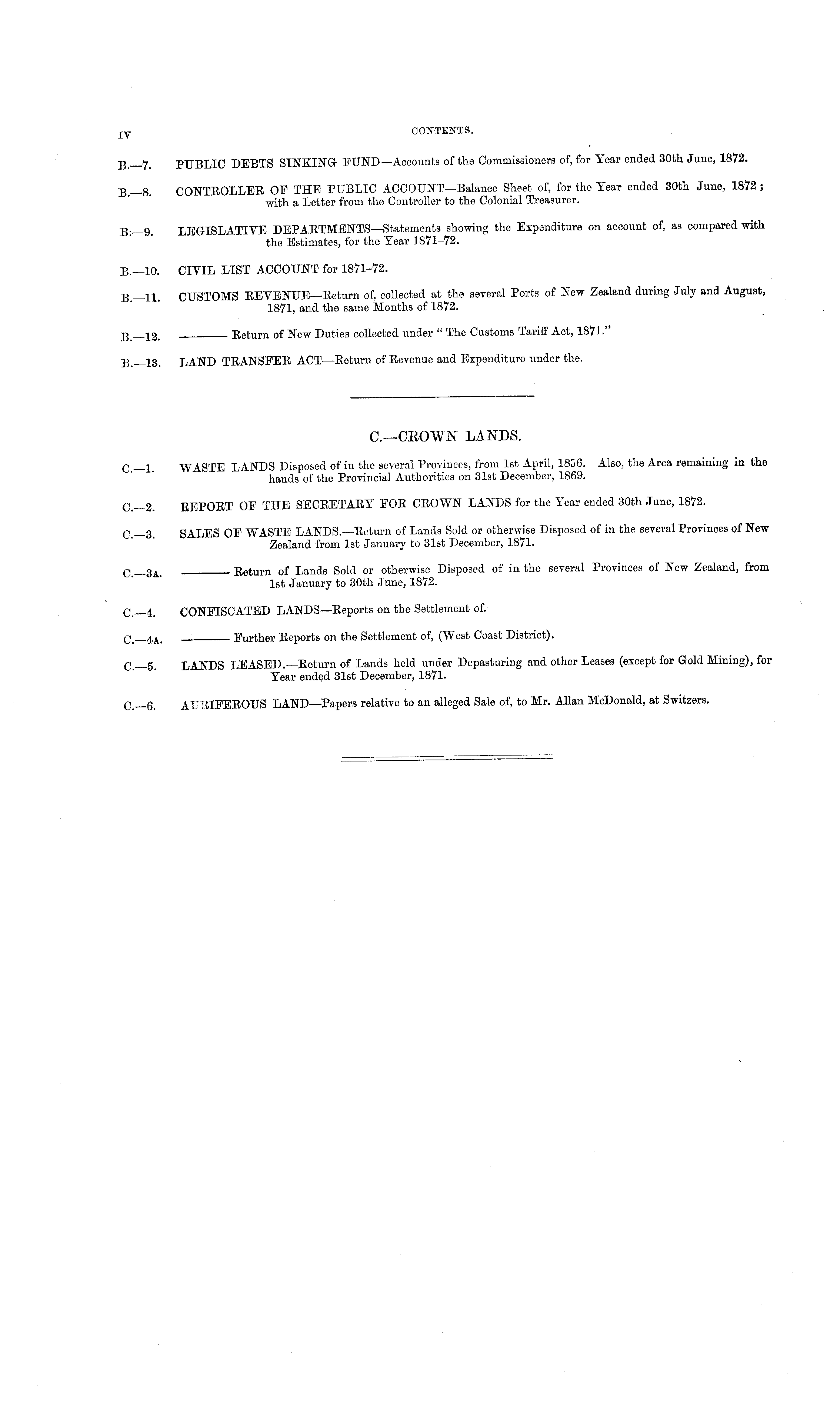 B—7. PUBLIC DEBTS SINKING FUND—Accounts of the Commissioners of, for Year ended 30th June, 1872. B —8. CONTROLLEE OF THE PUBLIC ACCOUNT—Balance Sheet of, for the Year ended 30th June, 1872 ; with a Letter from the Controller to the Colonial Treasurer. B— 9. LEGISLATIVE DEPAETMENTS—Statements showing the Expenditure on account of, as compared with the Estimates, for the Year 1871-72. B.—lo. CIVIL LIST ACCOUNT for 1871-72. B —11. CUSTOMS EEVENUE—Eeturn of, collected at the several Ports of New Zealand during July and August, 1871, and the same Months of 1872. B _ 12 Eeturn of New Duties collected under " The Customs Tariff Act, 1871." 8.—13. LAND TEANSFER ACT—Return of Revenue and Expenditure under the. C—CROWN LANDS. c_j WASTE LANDS Disposed of in the several Provinces, from Ist April, 1856. Also, the Area remaining in the hands of the Provincial Authorities on 31st December, 1869. C—2. REPORT OF THE SECRETARY FOR CROWN LANDS for the Year ended 30th June, 1872. C —3. SALES OF WASTE LANDS.—Return of Lands Sold or otherwise Disposed of in the several Provinces of New Zealand from Ist January to 31st December, 1871. c _ 3a _ Return of Lands Sold or otherwise Disposed of in the several Provinces of New Zealand, from Ist January to 30th June, 1872. C— 4. CONFISCATED LANDS—Reports on the Settlement of. C—4a. Further Reports on the Settlement of, (West Coast District). C,_s. LANDS LEASED.—Return of Lands held under Depasturing and other Leases (except for Gold Mining), for Year ended 31st December, 1871. O—6. AURIFEROUS LAND—Papers relative to an alleged Sale of, to Mr. Allan McDonald, at Switzers.