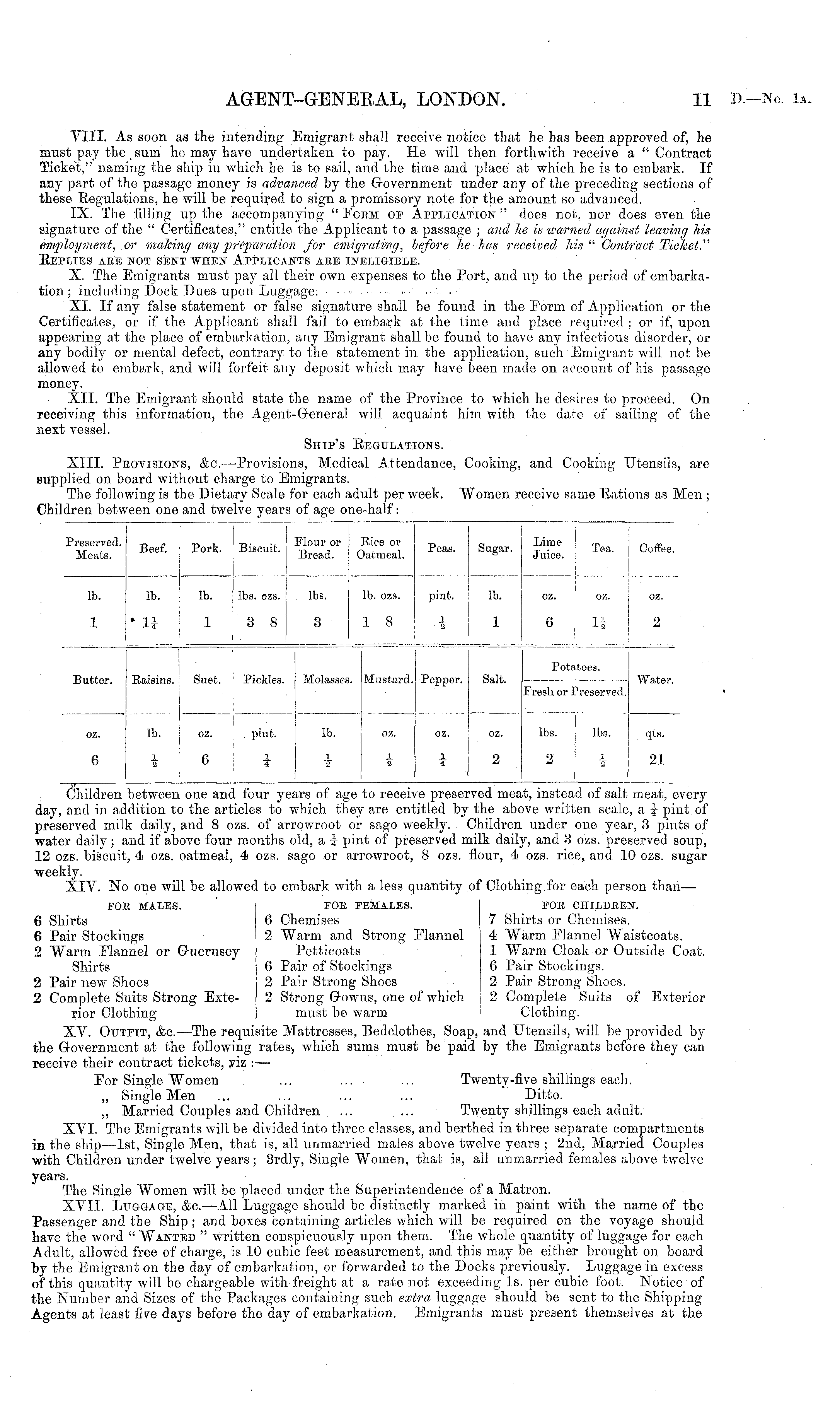 VIII. As soon as the intending Emigrant shall receive notice that he has been approved of, he must pay the, sum ho may have undertaken to pay. He will then forthwith receive a " Contract Ticket," naming the ship in which he is to sail, and the time and place at which he is to embark. If any part of the passage money is advanced by the Government under any of the preceding sections of these Regulations, ho will be required to sign a promissory note for the amount so advanced. IX. The filling up the accompanying " Form of Application " does not, nor does even the signature of the " Certificates," entitle the Applicant to a passage ; and he is teamed against leaving his employment, or making any preparation for emigrating, before he has received his" Contract Ticket." Replies ace not sent when Applicants are ineligible. X. The Emigrants must pay all their own expenses to the Port, and up to the period of embarkation ; including Dock Dues upon Luggage. • ■ . ■ . ■ XI. If any false statement or false signature shall be found in the Form of Application or the Certificates, or if the Applicant shall fail to embark at the time and place required ; or if, upon appearing at the place of embarkation, any Emigrant shall be found to have any infectious disorder, or any bodily or mental defect, contrary to the statement in the application, such Emigrant will not be allowed to embark, and will forfeit any deposit which may have been made on account of his passage money. XII. The Emigrant should state the name of the Province to which he desires to proceed. On receiving this information, the Agent-General will acquaint him with the date of sailing of the next vessel. Ship's Regulations. XIII. Peovisions, &c. —Provisions, Medical Attendance, Cooking, and Cooking Utensils, are supplied on board without charge to Emigrants. The following is the Dietary Scale for each adult per week. Women receive same Rations as Men ; Children between one and twelve years of age one-half: