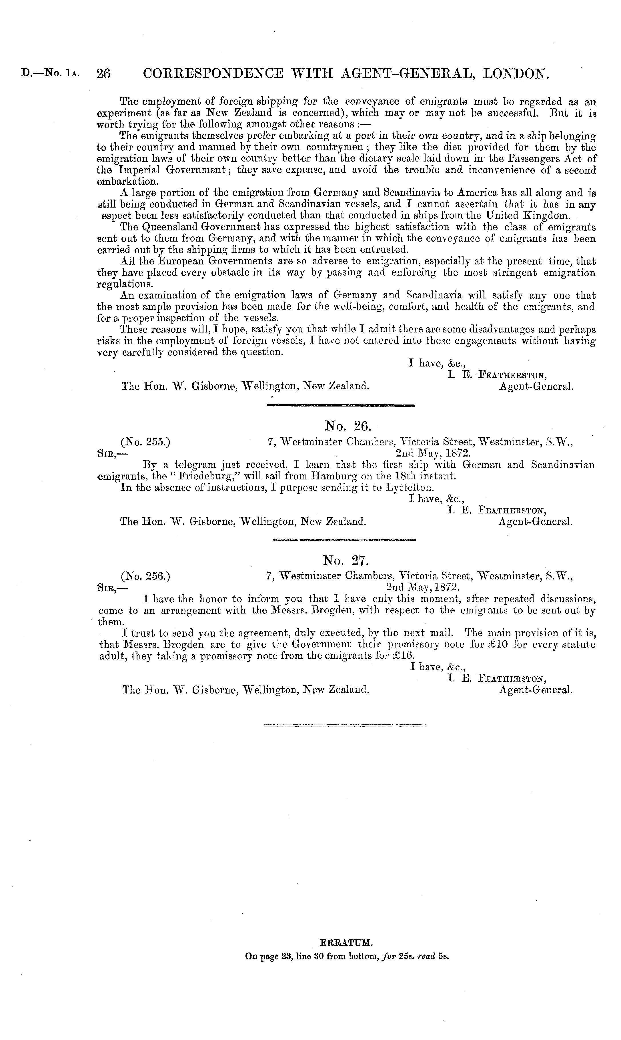 No. 27. (No. 256.) 7, Westminster Chambers, Victoria Street, Westminster, S.W., Sir,— 2nd May, 1872. I have the honor to inform you that I have only this moment, after repeated discussions, come to an arrangement with the Messrs. Brogden, with respect to the emigrants to be sent out by them. I trust to send you the agreement, duly executed, by the next mail. The main provision of it is, that Messrs. Brogden are to give the Government their promissory note for £10 for every statute adult, they taking a promissory note from the emigrants for £16. I have, &c, I. E. Featherston, The Hon. W. Gisborne, Wellington, New Zealand. Agent-General. ERRATUM. On page 23, line 30 from bottom, for 25b. read ss.