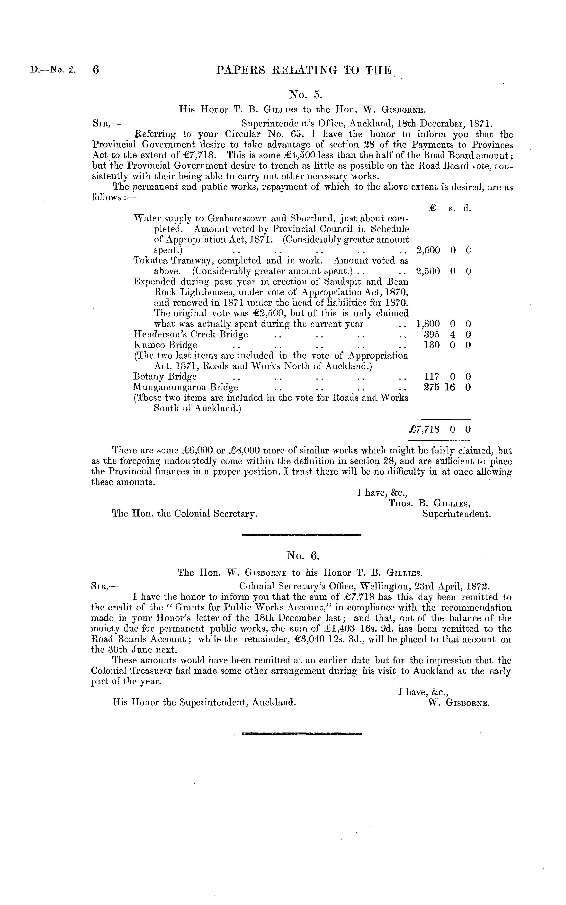 No. 6. The Hon. W. Gisborne to his Honor T. B. Gillies. Sir, — Colonial Secretary's Office, Wellington, 23rd April, 1872. I have the honor to inform you that the sum of £7,718 has this day been remitted to the credit of the " Grants for Public Works Account," in compliance with the recommendation made in your Honor's letter of the 18th December last; and that, out of the balance of the moiety due for permanent public works, the sum of £1,403 16s. 9d. has been remitted to the Road Boards Account ; while the remainder, £3,040 12s. 3d., will be placed to that account on the 30th June next. These amounts would have been remitted at an earlier date but for the impression that the Colonial Treasurer had made some other arrangement during his visit to Auckland at the early part of the year. I have, &c, His Honor the Superintendent, Auckland. W. Gisborne.