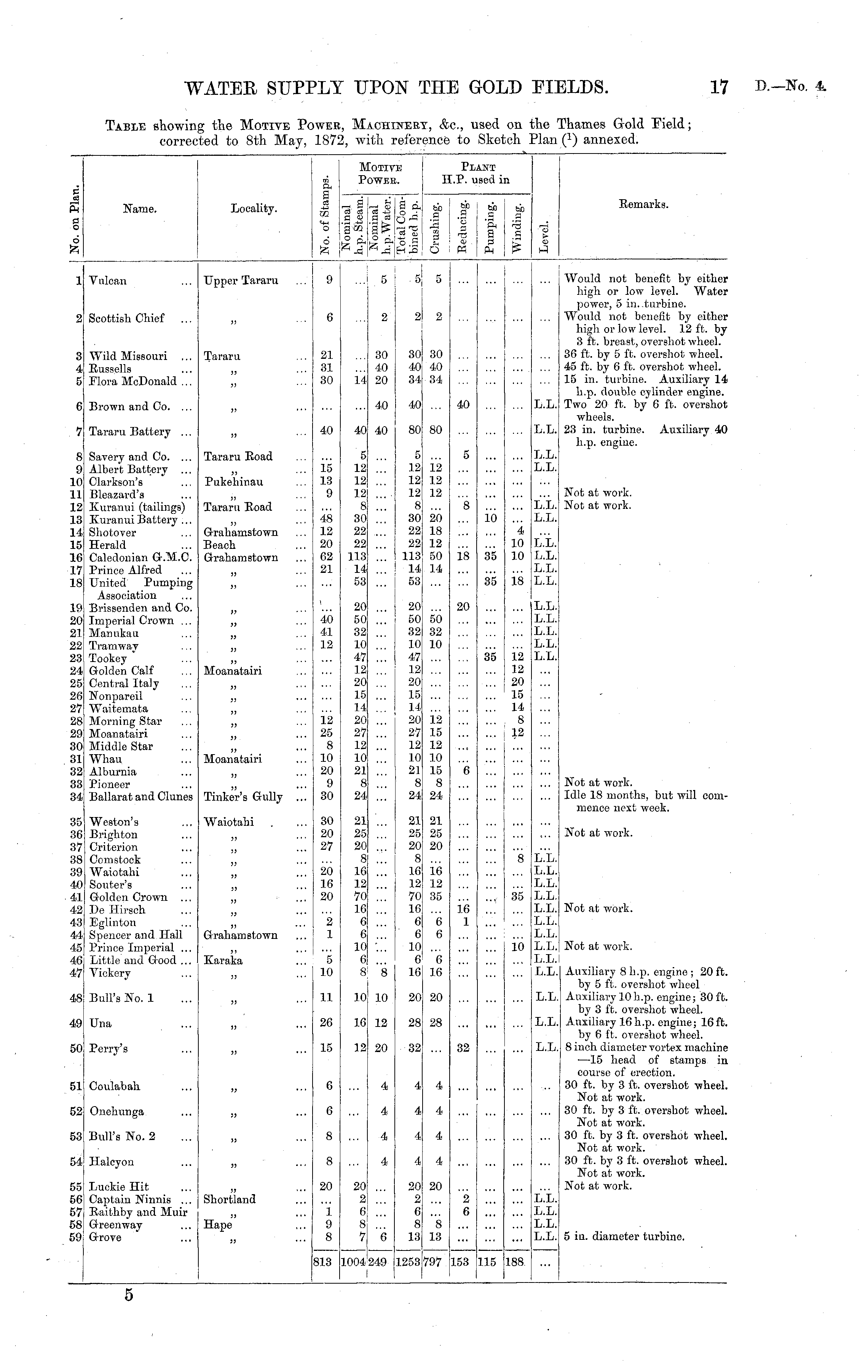 TABLE showing the MOTIVE POWER, MACHINERY, &c, used on the Thames Gold Field; corrected to 8th May, 1872, with reference to Sketch Plan ( l) annexed.