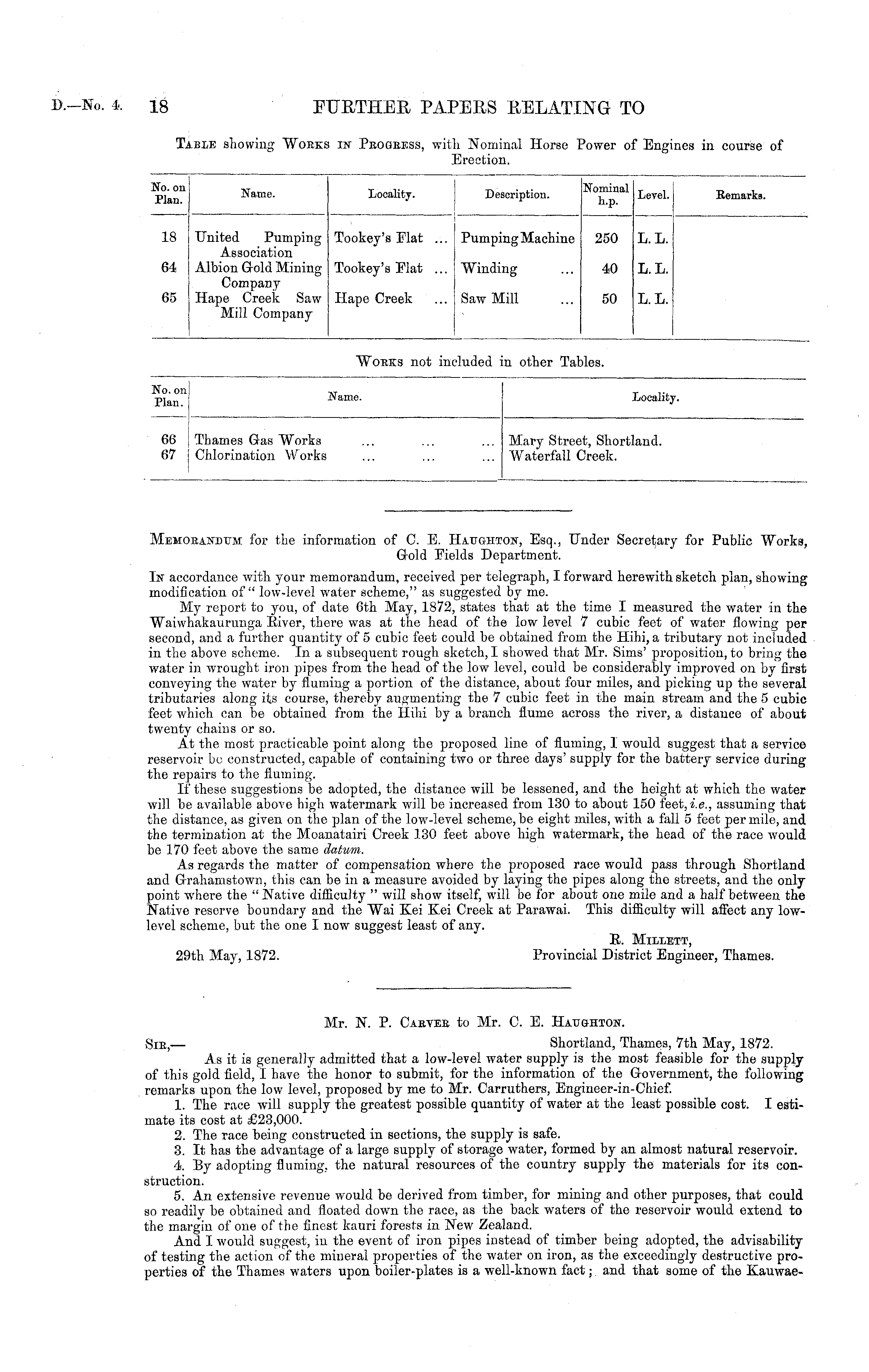 Mr. N". P. Cabyee to Mr. C. E. Hatjghtoh". Sib,— Shortland, Thames, 7th May, 1872. As it is generally admitted that a low-level water supply is the most feasible for the supply of this gold field, I have the honor to submit, for the information of the Government, the following remarks upon the low level, proposed by me to Mr. Carruthers, Engineer-in-Chief. 1. The race will supply the greatest possible quantity of water at the least possible cost. I estimate its cost at £23,000. 2. The race being constructed in sections, the supply is safe. 3. It has the advantage of a large supply of storage water, formed by an almost natural reservoir. 4. By adopting fluming, the natural resources of the country supply the materials for its construction. 5. An extensive revenue would be derived from timber, for mining and other purposes, that could so readily be obtained and floated down the race, as the back waters of the reservoir would extend to the margin of one of the finest kauri forests in New Zealand. And I would suggest, in the event of iron pipes instead of timber being adopted, the advisability of testing the action of the mineral properties of the water on iron, as the exceedingly destructive properties of the Thames waters upon boiler-plates is a well-known fact; and that some of the Kauwae-