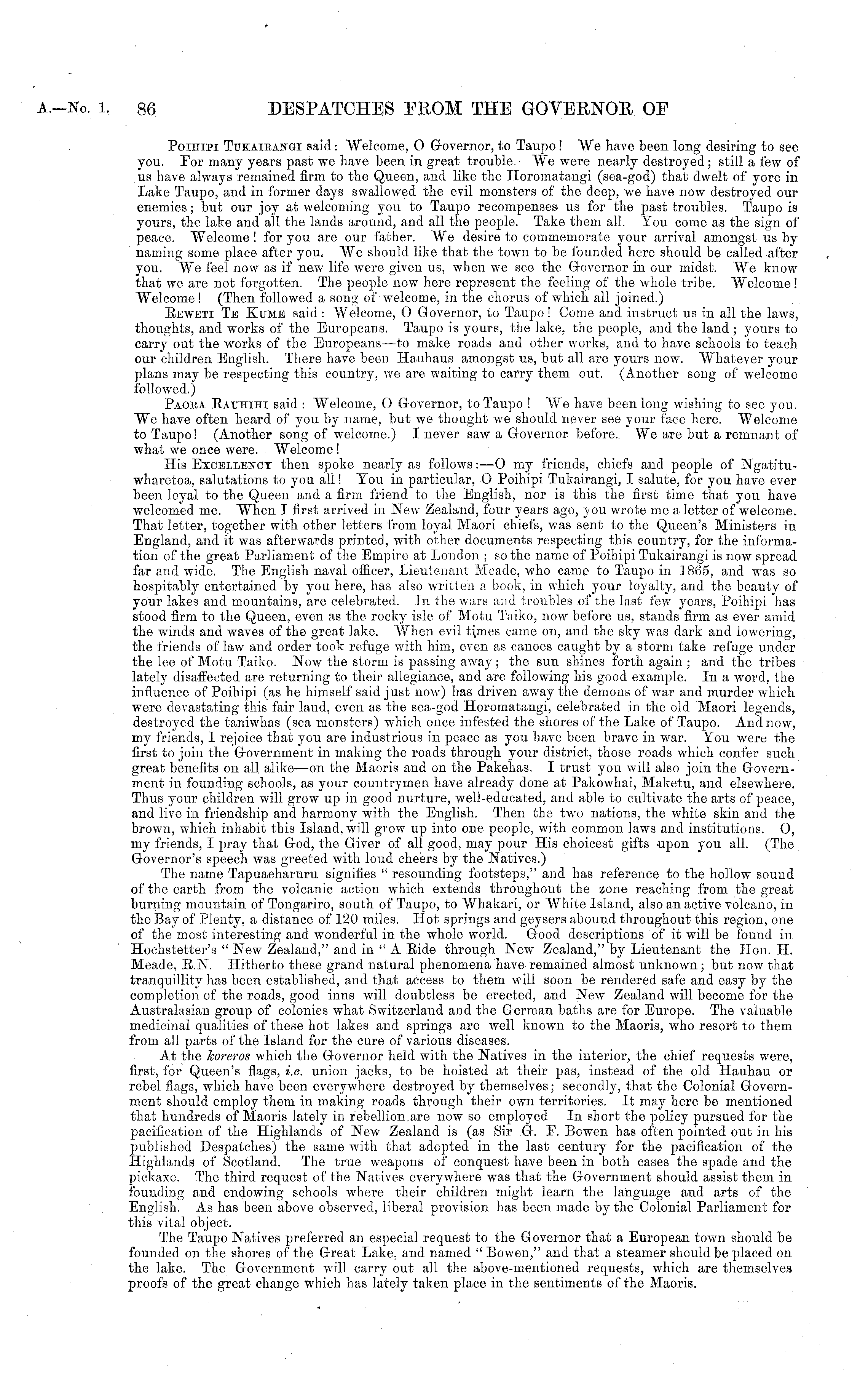 Poihipi Tukaikangi said : "Welcome, 0 Governor, to Taupo ! We have been long desiring to see you. For many years past we have been in great trouble. We were nearly destroyed; still a few of us have always remained firm to the Queen, and like the Horomatangi (sea-god) that dwelt of yore in Lake Taupo, and in former days swallowed the evil monsters of the deep, we have now destroyed our enemies; but our joy at welcoming you to Taupo recompenses us for the past troubles. Taupo is yours, the lake and all the lands around, and all the people. Take them all. You come as the sign of peace. Welcome ! for you are our father. We desire to commemorate your arrival amongst us by naming some place after you. We should like that the town to be founded here should be called after you. We feel now as if new life were given us, when we see the Governor in our midst. We know that we are not forgotten. The people now here represent the feeling of the whole tribe. Welcome! Welcome! (Then followed a song of welcome, in the chorus of which all joined.) Beweti Te Kttmb said : Welcome, 0 Governor, to Taupo! Come and instruct us in all the laws, thoughts, and works of the Europeans. Taupo is yours, the lake, the people, and the land ; yours to carry out the works of the Europeans —to make roads and other works, and to have schools to teach our children English. There have been Hauhaus amongst us, but all are yours now. Whatever your plans may be respecting this country, we are waiting to carry them out. (Another song of welcome followed.) Paoba Baotiirt said : Welcome, O Governor, to Taupo ! We have been long wishing to see you. We have often heard of you by name, but we thought we should never see your face here. Welcome to Taupo! (Another song of welcome.) I never saw a Governor before. We are but a remnant of what we once were. Welcome! His Excellency then spoke nearly as follows: —O my friends, chiefs and people of Ngatituwharetoa, salutations to you all! You in particular, O Poihipi Tukairangi, I salute, for you have ever been loyal to the Queen and a firm friend to the English, nor is this the first time that you have welcomed me. When I first arrived in New Zealand, four years ago, you wrote me a letter of welcome. That letter, together with other letters from loyal Maori chiefs, was sent to the Queen's Ministers in England, and it was afterwards printed, with other documents respecting this country, for the information of the great Parliament of the Empire at London ; so the name of Poihipi Tukairangi is now spread far and wide. The English naval officer, Lieutenant Meade, who came to Taupo in 1805, and was so hospitably entertained by you here, has also written a book, in which your loyalty, and the beauty of your lakes and mountains, are celebrated. In the wars and troubles of the last few years, Poihipi has stood firm to the Queen, even as the rocky isle of Motu Taiko, now before us, stands firm as ever amid the winds and waves of the great lake. When evil t;mes came on, and the sky was dark and lowering, the friends of law and order took refuge with him, even as canoes caught by a storm take refuge under the lee of Motu Taiko. Now the storm is passing away; the sun shines forth again ; and the tribes lately disaffected are returning to their allegiance, and are following his good example. In a word, the influence of Poihipi (as he himself said just now) has driven away the demons of war and murder which were devastating this fair land, even as the sea-god Horomatangi, celebrated in the old Maori legends, destroyed the taniwhas (sea monsters) which once infested the shores of the Lake of Taupo. And now, my friends, I rejoice that you are industrious in peace as you have been brave in war. You were the first to join the Government in making the roads through your district, those roads which confer such great benefits on all alike —on the Maoris and on the Pakehas, I trust you will also join the Government in founding schools, as your countrymen have already done at Pakowhai, Maketu, and elsewhere. Thus your children will grow up in good nurture, well-educated, and able to cultivate the arts of peace, and live in friendship and harmony with the English. Then the two nations, the white skin and the brown, which inhabit this Island, will grow up into one people, with common laws and institutions. 0, my friends, I pray that God, the Giver of all good, may pour His choicest gifts upon you all. (The Governor's speech was greeted with loud cheers by the Natives.) The name Tapuaeharuru signifies " resounding footsteps," and has reference to the hollow sound of the earth from the volcanic action which extends throughout the zone reaching from the great burning mountain of Tongariro, south of Taupo, to Whakari, or White Island, also an active volcano, in the Bay of Plenty, a distance of 120 miles. Hot springs and geysers abound throughout this region, one of the most interesting and wonderful in the whole world. Good descriptions of it will be found in Hochstetter's " New Zealand," and in " A Bide through New Zealand," by Lieutenant the Hon. PI. Meade, B.N. Hitherto these grand natural phenomena have remained almost unknown; but now that tranquillity has been established, and that access to them will soon be rendered safe and easy by the completion of the roads, good inns will doubtless be erected, and New Zealand will become for the Australasian group of colonies what Switzerland and the German baths are for Europe. The valuable medicinal qualities of these hot lakes and springs are well known to the Maoris, who resort to them from all parts of the Island for the cure of various diseases. At the Jcoreros which the Governor held with the Natives in the interior, the chief requests were, first, for Queen's flags, i.e. union jacks, to be hoisted at their pas, instead of the old Hauhau or rebel flags, which have been everywhere destroyed by themselves; secondly, that the Colonial Government should employ them