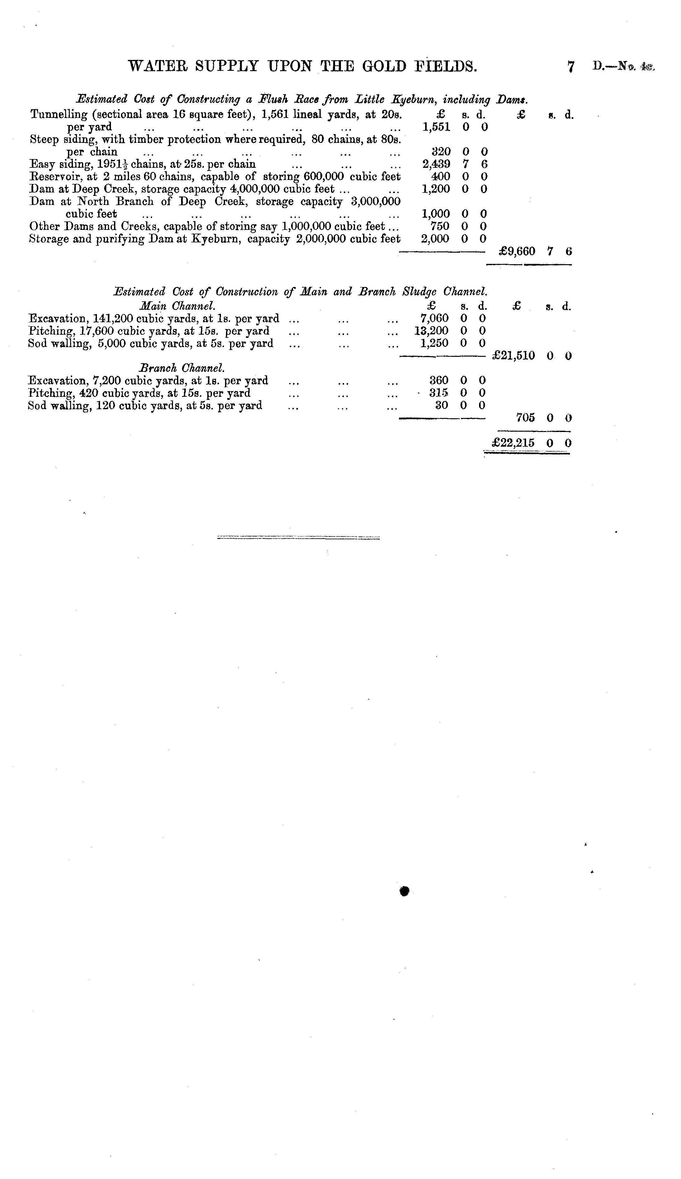 Estimated Cost of Constructing a Elush Race from Little Kyeburn, including Dams. Tunnelling (sectional area 16 square feet), 1,561 lineal yards, at 20s. £ s. d. £ ». d. per yard ... ... ... ... ... ... 1,551 0 0 Steep siding, with timber protection where required, 80 chains, at 80s. per chain ... ... ... ... ... ... 320 0 0 Easy siding, 1951| chains, at- 255. per chain ... ... ... 2,439 7 6 Beservoir, at 2 miles 60 chains, capable of storing 600,000 cubic feet 400 0 0 Dam at Deep Creek, storage capacity 4,000,000 cubic feet ... ... 1,200 0 0 Dam at North Branch of Deep Creek, storage capacity 3,000,000 cubic feet ... ... ... ... ... ... 1,000 0 0 Other Dams and Creeks, capable of storing say 1,000,000 cubic feet... 750 0 0 Storage and purifying Dam at Kyeburn, capacity 2,000,000 cubic feet 2,000 0 0 £9,660 7 6 Estimated Cost of Construction of Main and Branch Sludge Channel. Main Channel. £ s. d. £ s. d. Excavation, 141,200 cubic yards, at Is. per yard ... ... ... 7,060 0 0 Pitching, 17,600 cubic yards, at 15s. per yard ... ... ... 13,200 0 0 Sod walling, 5,000 cubic yards, at ss. per yard ... ... ... 1,250 0 0 £21,510 0 0 Branch Channel. Excavation, 7,200 cubic yards, at Is. per yard ... ... ... 360 0 0 Pitching, 420 cubic yards, at 15s. per yard ... ... ... - 315 0 0 Sod walling, 120 cubic yards, at ss. per yard ... ... ... 30 0 0 705 0 0 £22,215 0 0