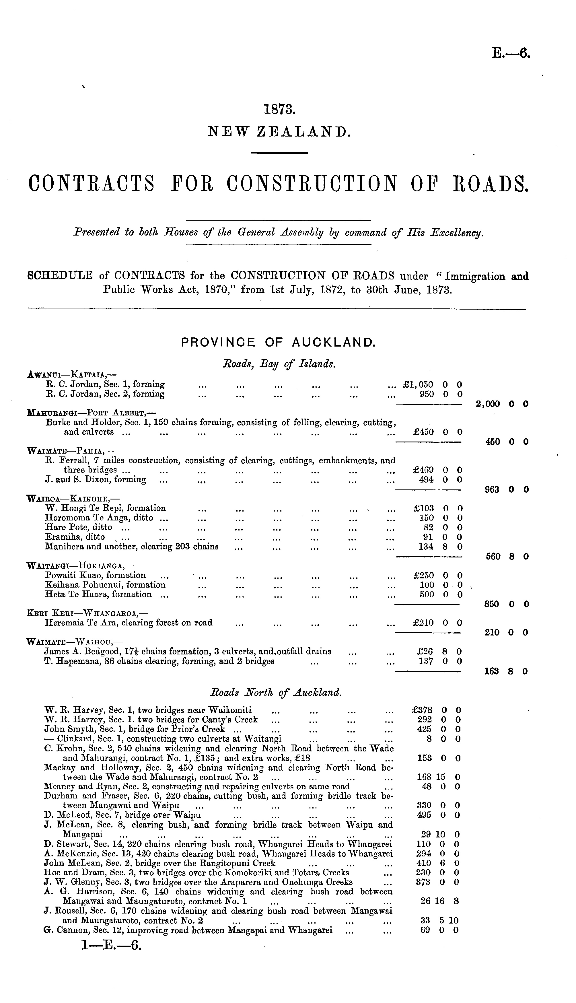 Presented to both Houses of the General Assembly by command of His Excellency. SCHEDULE of CONTRACTS for the CONSTRUCTION OF ROADS under " Immigration and Public Works Act, 1870," from Ist July, 1872, to 30th June, 1873.