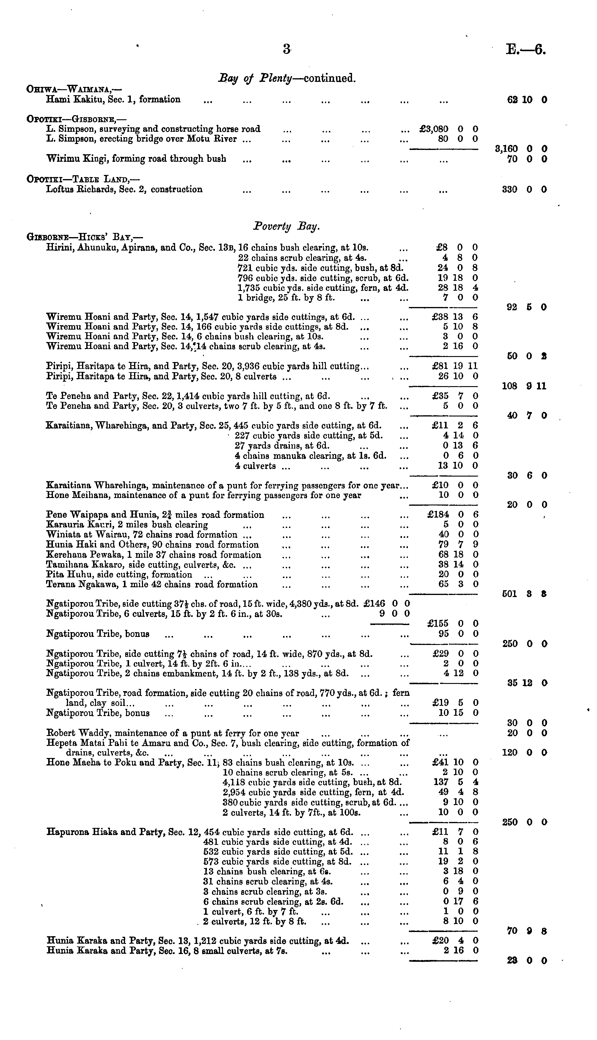 Poverty Bay. Gisboene —Hices' Bat, — Hirini, Ahuuuku, Apirana, and Co., Sec. 13e, 16 chains bush clearing, at 10s. ... £8 0 0 22 chains scrub clearing, at 4s. ... 4 8 0 721 cubic yds. Bide cutting, bush, at Bd. 24 0 8 796 cubic yds. side cutting, scrub, at 6d. 10 18 0 1,735 cubic yds. side cutting, fern, at 4d. 28 18 4 1 bridge, 25"ft. by 8 ft. ... ... 7 0 0 92 5 0 Wirenra Hoani and Party, Sec. 14, 1,547 cubic yards side cuttings, at 6d. ... ... £38 13 6 Wiremu Hoani and Party, Sec. 14, 166 cubic yards side cuttings, at Bd. ... ... 510 8 Wiremu Hoani and Party, Sec. 14, 6 chains bush clearing, at 10s. ... ... 3 0 0 Wiremu Hoani and Party, Sec. 14/14 chains scrub clearing, at 4s. ... ... 2 16 0 50 0 2 Piripi, Haritapate Hira, and Party, Sec. 20, 3,936 cubic yards hill cutting... ... £81 19 11 Piripi, Haritapate Hira, and Party, Sec. 20, 8 culverts ... ... 26 10 0 108 9 11 To Peneha and Party, See. 22,1,414 cubic yards hill cutting, at 6d. ... ... £35 7 0 To Peneha and Party, Sec. 20, 3 culverts, two 7 ft. by 5 ft., and one 8 ft. by 7 ft. ... 5 0 0 40 7 0 Karaitiana, Wharehinga, and Party, Sec. 25, 445 cubic yards side cutting, at 6d. ... £11 2 6 • 227 cubic yards side cutting, at sd. ... 4140 27 yards drains, at 6d. ... ... 0 13 6 4 chains manuka clearing, at Is. 6d. ... 0 6 0 4 culverts ... ... ... ... 13 10 0 30 6 0 Karaitiana Wharehinga, maintenance of a punt for ferrying passengers for one year... £10 0 0 Hone Meihana, maintenance of a punt for ferrying passengers for one year ... 10 0 0 20 0 0 Pene Waipapa and Hunia, 2f miles road formation ... ... ... ... £184 0 6 , Karauria Kar.ri, 2 miles bush clearing ... ... ... ... ... 5 0 0 Winiata at Wairau, 72 chains road formation ... ... ... ... ... 40 0 0 Himia Ilaki and Others, 90 chains road formation ... ... ... ... 79 7 9 Kerehana Pewaka, 1 mile 37 chains road formation ... ... ... ... 68 18 0 Tamihana luikaro, side cutting, culverts, &c. ... ... ... ... ... 38 14 0 Pita Ilulm, side cutting, formation ... ... ... ... ... ... 20 0 0 Terana Ngakawa, 1 inilo 42 chains road formation ... ... ... ... 65 3 0 501 3 8 Egatiporou Tribe, side cutting 37i chs. of road, 15 ft. wide, 4,380 yds., at Bd. £146 0 0 Ngatiporou Tribe, 6 culverts, 15 ft. by 2 ft. 6 in., at 30s. ... 9 0 0 £155 0 0 Ngatiporou Tribe, bonuß ... ... ... ... ... ... ... 95 0 0 ■ 250 0 0 Ngatiporou Tribe, side cutting 74 chains of road, 14 ft. wide, 870 yds., at Bd. ... £29 0 0 Ngatiporou Tribe, 1 culvert, 14 ft. by 2ft. 6 in.... ... ... ... ... 200 Ngatiporou Tribe, 2 chains embankment, 14 ft. by 2 ft., 138 yds., at Bd. ... ... 412 0 35 12 0 Ngatiporou Tribe, road formation, Bide cutting 20 chains of road, 770 yds., at 6d.; fern land, clay 50i1... ... ... ... ... ... ... ... £19 5 0 Ngatiporou Tribe, bonus ... ... ... ... ... ... ... 10 15 0 30 0 0 Kobert "Waddy, maintenance of a punt at ferry for one year ... ... ... ... 20 0 0 Hepota Matai Palii te Amaru and Co., Sec. 7, bush clearing, side cutting, formation of drains, culverts, &c. ... ... ... ... ... ... ... ... 120 0 0 Hone llaeha to Poku and Party, Sec. 11; 83 chains bush clearing, at 10s. ... ... £4110 0 10 chains scrub clearing, at ss. ... ... 2 10 0 4,118 cubic yards side cutting, bush, at Bd. 137 5 4 2,954 cubic yards side cutting, fern, at 4d. 49 4 8 380 cubic yards side cutting, scrub,at Gd. ... 910 0 2 culverts, 14 ft. by 7ft., at 100s. ... 10 0 0 250 0 0 Hapurona Iliaka and Party, See. 12, 454 cubic yards side cutting, at 6d. ... ... £11 7 0 481 cubic yards side cutting, at 4d. ... ... 8 0 6 532 cubic yards side cutting, at sd. ... ... 11 1 8 573 cubic yards side cutting, at Bd. ... ... 19 2 0 13 chains bush clearing, at 6». ... ... 3 18 0 31 chains scrub clearing, at 4s. ... ... 6 4 0 3 chains scrub clearing, at 3s. ... ... 0 9 0 , 6 chains scrub clearing, at 2s. 6d. ... ... 017 6 1 culvert, 6 ft. by 7 ft. ... ... ... 10 0 2 culverts, 12 ft. by 8 ft. ... ... ... 810 0 70 9 8 Hunia Karaka and Party, Sec. 13, 1,212 cubic yards side cutting, at 4d. ... ... £20 4 0 Hunia Karaka and Party, Sec. 16, 8 small culverts, at 7s. ... ... ... 2 16 0 23 0 0