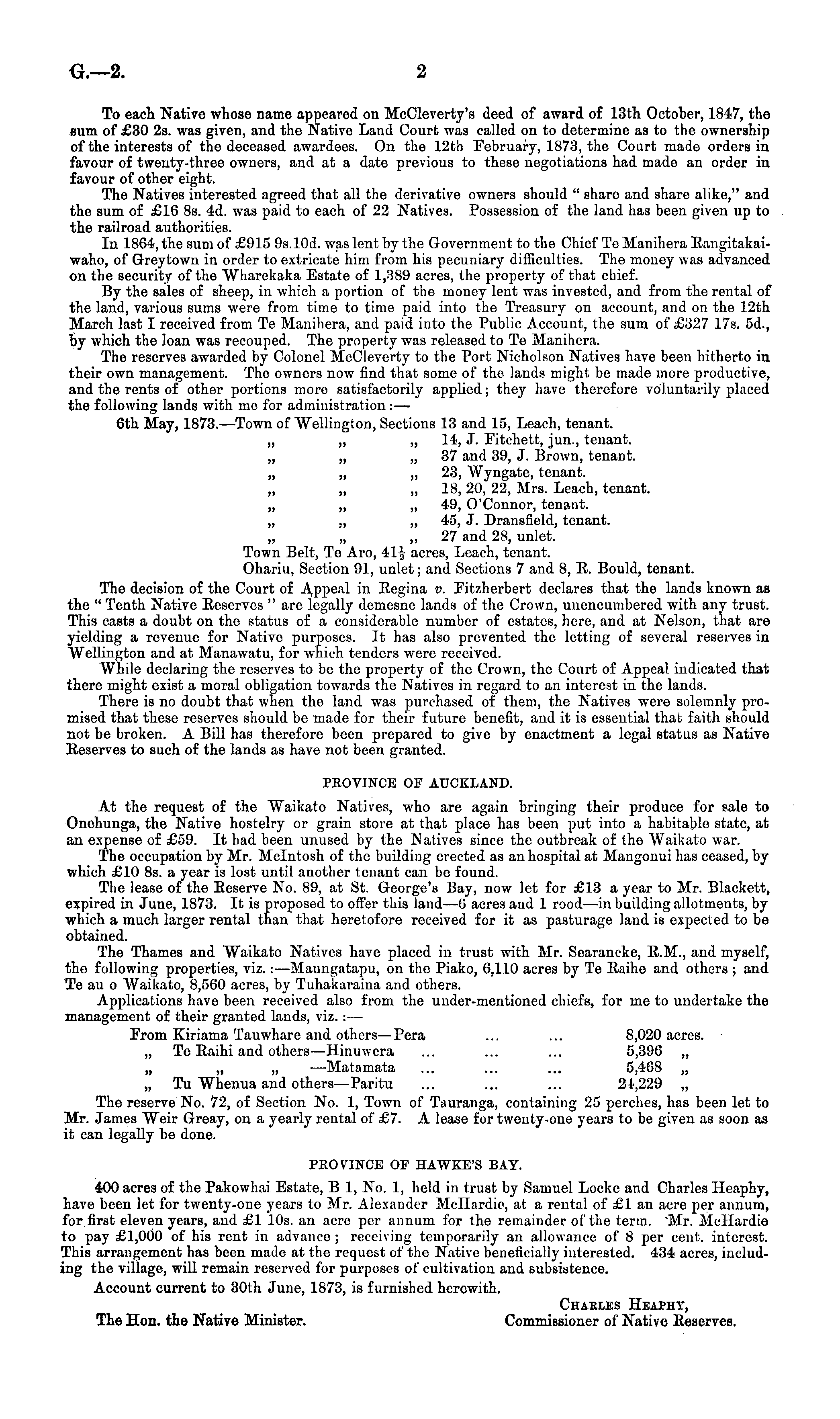 To each Native whose name appeared on McCleverty's deed of award of 13th October, 1847, the sum of £30 2s. was given, and the Native Land Court was called on to determine as to the ownership of the interests of the deceased awardees. On the 12th February, 1873, the Court made orders in favour of tweuty-three owners, and at a date previous to these negotiations had made an order in favour of other eight. The Natives interested agreed that all the derivative owners should " share and share alike," and the sum of £16 Bs. 4d. was paid to each of 22 Natives. Possession of the land has been given up to the railroad authorities. In 1804, the sum of £915 95.10 d. was lent by the Government to the Chief Te Manihera Bangitakaiwaho, of Greytown in order to extricate him from his pecuniary difficulties. The money was advanced on the security of the "Wharekaka Estate of 1,389 acres, the property of that chief. By the sales of sheep, in which a portion of the money lent was invested, and from the rental of the land, various sums were from time to time paid into the Treasury on account, and on the 12th March last I received from Te Manihera, and paid into the Public Account, the sum of £327 17s. 5d., by which the loan was recouped. The property was released to Te Manihera. The reserves awarded by Colonel McCleverty to the Port Nicholson Natives have been hitherto in their own management. The owners now find that some of the lands might be made more productive, and the rents of other portions more satisfactorily applied; they have therefore voluntarily placed the following lands with me for administration : — 6th May, 1873. —Town of Wellington, Sections 13 .and 15, Leach, tenant. „ „ „ 14, J. Fitchett, jun., tenant. „ „ „ 37 and 39, J. Brown, tenant. „ ~ „ 23, Wyngate, tenant. „ „ „ 18, 20, 22, Mrs. Leach, tenant. „ „ „ 49, O'Connor, tenant. „ „ „ 45, J. Dransfield, tenant. „ „ „ 27 and 28, unlet. Town Belt, Te Aro, 41_- acres, Leach, tenant. Ohariu, Section 91, unlet; and Sections 7 and 8, E. Bould, tenant. The decision of the Court of Appeal in Eegina v. Fitzherbert declares that the lands known as the " Tenth Native Eeserves " are legally demesne lands of the Crown, unencumbered with any trust. This casts a doubt on the status of a considerable number of estates, here, and at Nelson, that are yielding a revenue for Native purposes. It has also prevented the letting of several reserves in Wellington and at Manawatu, for which tenders were received. While declaring the reserves to be the property of the Crown, the Court of Appeal indicated that there might exist a moral obligation towards the Natives in regard to an interest in the lands. There is no doubt that when the land was purchased of them, the Natives were solemnly promised that these reserves should be made for their future benefit, and it is essential that faith should not be broken. A Bill has therefore been prepared to give by enactment a legal status as Native Eeserves to such of the lands as have not been granted. PROVINCE OE AUCKLAND. At the request of the Waikato Natives, who are again bringing their produce for sale to Onehunga, the Native hostelry or grain store at that place has been put into a habitable state, at an expense of £59. It had been unused by the Natives since the outbreak of the Waikato war. The occupation by Mr. Mcintosh of the building erected as an hospital at Mangouui has ceased, by which £10 Bs. a year is lost until another tenant can be found. The lease of the Beserve No. 89, at St. George's Bay, now let for £13 a year to Mr. Blackett, expired in June, 1873. It is proposed to offer this land —0 acres and 1 rood —in building allotments, by which a much larger rental than that heretofore received for it as pasturage land is expected to bo obtained. The Thames and Waikato Natives have placed in trust with Mr. Scarancke, E.M., and myself, the following properties, viz.: —Maungatapu, on the Piako, 6,110 acres by Te Eaiho and others ; and Te au o AVaikato, 8,560 acres, by Tuhakaraina and others. Applications have been received also from the under-mentioned chiefs, for me to undertake tho management of their granted lands, viz. : — From Kiriama Tau whare and others—Pera ... ... 8,020 acres. „ Te Eaihi and others —Hinuwera ... ... ... 5,396 „ „ „ „ ■ —Matamata ... ... ... 5,468 „ „ Tv Whenua and others—Paritu ... ... ... 24,229 „ The reserve No. 72, of Section No. 1, Town of Tauranga, containing 25 perches, has been let to Mr. James Weir Greay, on a yearly rental of £7. A lease for twenty-one years to be given as soon as it can legally be done. PROVINCE OF HAWKE'S BAY. 400 acres of the Pakowhai Estate, B 1, No. 1, held in trust by Samuel Locke and Charles Heaphy, have been let for twenty-one years to Mr. Alexander McHardie, at a rental of £1 an acre per annum, for first eleven years, and £1 10s. an acre per annum for the remainder of the term. Mr. Mclfardie to pay £1,000 of his rent in advance ; receiving temporarily an allowance of 8 per cent, interest. This arrangement has been made at the request of the Native beneficially interested. 434 acres, including the village, will remain reserved for purposes of cultivation and subsistence. Account current to 30th June, 1873, is furnished herewith. Chakies Heaphy, The Hon. the Native Minister. Commissioner of Native Eeserves.