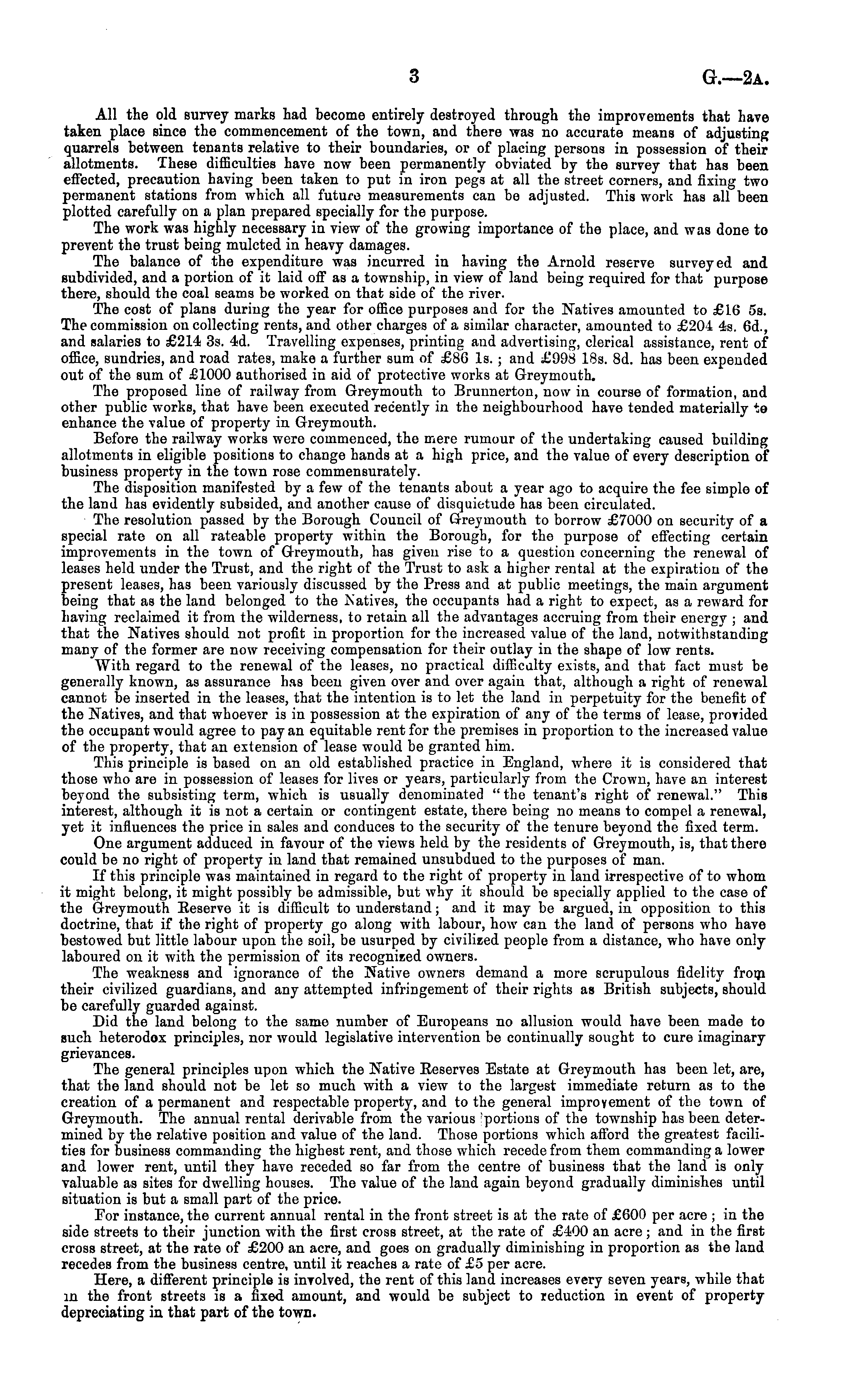 All the old survey marks had become entirely destroyed through the improvements that have taken place since the commencement of the town, and there was no accurate means of adjusting quarrels between tenants relative to their boundaries, or of placing persons in possession of their allotments. These difficulties have now been permanently obviated by the survey that has been effected, precaution having been taken to put in iron pegs at all the street corners, and fixing two permanent stations from which all future measurements can be adjusted. This work has all been plotted carefully on a plan prepared specially for the purpose. The work was highly necessary in view of the growing importance of the place, and was done to prevent the trust being mulcted in heavy damages. The balance of the expenditure was incurred in having the Arnold reserve surveyed and subdivided, and a portion of it laid off as a township, in view of land being required for that purpose there, should the coal seams be worked on that side of the river. The cost of plans during the year for office purposes and for the Natives amounted to £16 ss. The commission on collecting rents, and other charges of a similar character, amounted to £204 4s. 6d., and salaries to £214 3s. 4d. Travelling expenses, printing and advertising, clerical assistance, rent of office, sundries, and road rates, make a further sum of £86 Is. ; and £998 18s. Bd. has been expended out of the sum of £1000 authorised in aid of protective works at Greymouth. The proposed line of railway from Greymouth to Brunnerton, now in course of formation, and other public works, that have been executed recently in the neighbourhood have tended materially to enhance the value of property in Greymouth. Before the railway works were commenced, the mere rumour of the undertaking caused building allotments in eligible positions to change hands at a high price, and the value of every description of business property in the town rose commensurately. The disposition manifested by a few of the tenants about a year ago to acquire the fee simple of the land has evidently subsided, and another cause of disquietude has been circulated. The resolution passed by the Borough Council of Grevmouth to borrow £7000 on security of a special rate on all rateable property within the Borough, for the purpose of effecting certain improvements in the town of Greymouth, has given rise to a question concerning the renewal of leases held under the Trust, and the right of the Trust to ask a higher rental at the expiration of the present leases, has been variously discussed by the Press and at public meetings, the main argument being that as the land belonged to the Natives, the occupants had a right to expect, as a reward for having reclaimed it from the wilderness, to retain all the advantages accruing from their energy ; and that the Natives should not profit in proportion for the increased value of the land, notwithstanding many of the former are now receiving compensation for their outlay in the shape of low rents. With regard to the renewal of the leases, no practical difficulty exists, and that fact must be generally known, as assurance has been given over and over again that, although a right of renewal cannot be inserted in the leases, that the intention is to let the land in perpetuity for the benefit of the Natives, and that whoever is in possession at the expiration of any of the terms of lease, provided the occupant would agree to pay an equitable rent for the premises in proportion to the increased value of the property, that an extension of lease would be granted him. This principle is based on an old established practice in England, where it is considered that those who are in possession of leases for lives or years, particularly from the Crown, have an interest beyond the subsisting term, which is usually denominated " the tenant's right of renewal." This interest, although it is not a certain or contingent estate, there being no means to compel a renewal, yet it influences the price in sales and conduces to the security of the tenure beyond the fixed term. One argument adduced in favour of the views held by the residents of Greymouth, is, that there could be no right of property in land that remained unsubdued to the purposes of man. If this principle was maintained in regard to the right of property in land irrespective of to whom it might belong, it might possibly be admissible, but why it should be specially applied to the case of the Greymouth Eeserve it is difficult to understand; and it may be argued, in opposition to this doctrine, that if the right of property go along with labour, how can the land of persons who have bestowed but little labour upon the soil, be usurped by civilized people from a distance, who have only laboured on it with the permission of its recognized owners. The weakness and ignorance of the Native owners demand a more scrupulous fidelity from their civilized guardians, and any attempted infringement of their rights as British subjects, should be carefully guarded against. Did the land belong to the same number of Europeans no allusion would have been made to such heterodox principles, nor would legislative intervention be continually sought to cure imaginary grievances. The general principles upon which the Native Eeserves Estate at Greymouth has been let, are, that the land should not be let so much with a view to the largest immediate return as to the creation of a permanent and respectable property, and to the general improvement of the town of Greymouth. The annual rental derivable from the various portions of the township has been determined by the relative position and value of the land. Those portions which afford the greatest facilities for business commanding the highest rent, and those which recede from them commanding a lower and lower rent, until they have receded so far from the centre of business that the land is only valuable 