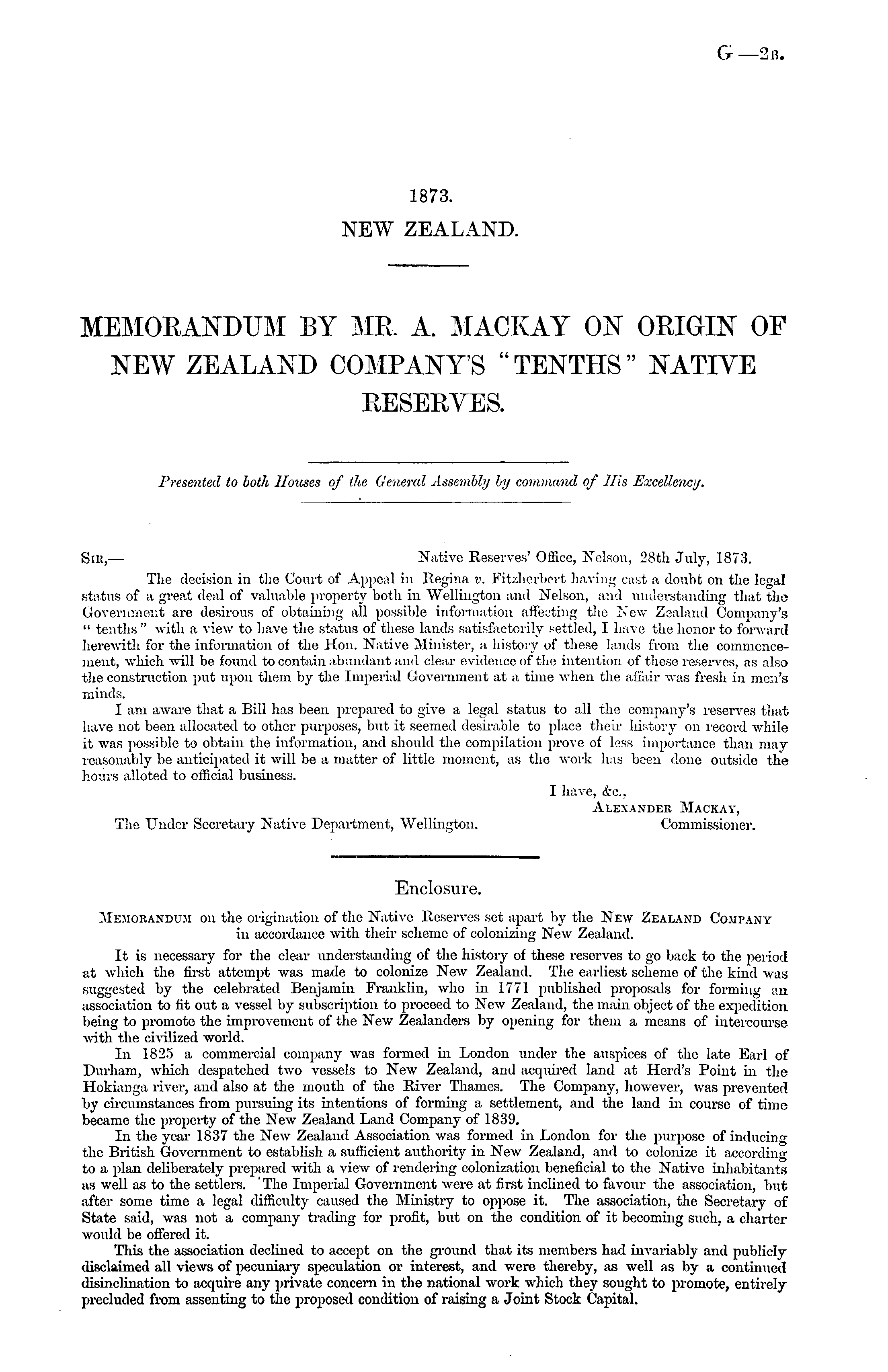 Presented to both Houses of the General Assembly by command of His Excellency. Sin,— Native Reserves' Office, Nelson, 28th July, 1873. The decision in the Court of Appeal in Regina v. Fitzherbert having cast a doubt on the legal status of a great deal of valuable property both in AVellington and Nelson, and understanding that the Government are desirous of obtaining all possible information affecting the New Zealand Company's " tenths " with a view to have the status of these lands satisfactorily settled, I have the honor to forward herewith for the information of the Hon. Native Minister, a history of these lands from the commencement, which will be found to contain abundant and clear evidence of tho intention of these reserves, as also the construction put upon them by the Imperial Government at a time when the affair was fresh in men's minds. I am aware that a Bill has been prepared to give a legal status to all the company's reserves that have not been allocated to other purposes, but it seemed desirable to place their history on record while it was possible to obtain the information, and should the compilation prove of less importance than may reasonably be anticipated it will be a matter of little moment, as the work has been done outside the hours alloted to official business. I have, <_c., Alexander Mackay, The Under Secretary Native Department, AVellington. Commissioner.