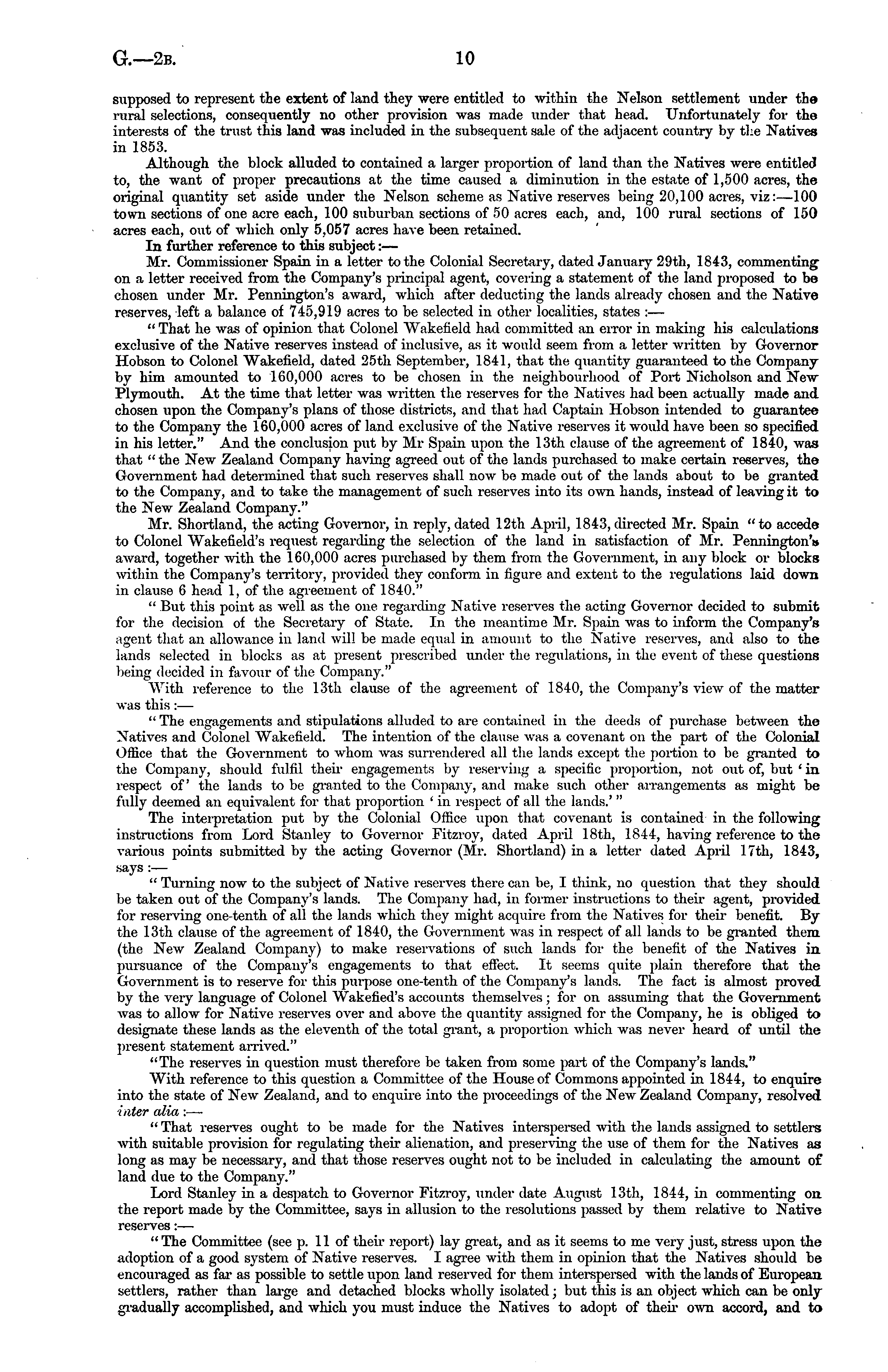 supposed to represent the extent of land they were entitled to within the Nelson settlement under the rural selections, consequently no other provision was made under that head. Unfortunately for tho interests of the trust this land was included in the subsequent sale of the adjacent country by the Natives in 1853. Although the block alluded to contained a larger proportion of land than the Natives were entitled to, the want of proper precautions at the time caused a diminution in the estate of 1,500 acres, the original quantity set aside under the Nelson scheme as Native reserves being 20,100 acres, viz:—loo town sections of one acre each, 100 suburban sections of 50 acres each, and, 100 rural sections of 150 acres each, out of which only 5,057 acres have been retained. In further reference to this subject:— Mr. Commissioner Spain in a letter to the Colonial Secretary, dated January 29th, 1843, commenting: on a letter received from the Company's principal agent, covering a statement of the land proposed to be chosen under Mr. Pennington's award, which after deducting the lands already chosen and the Native reserves, left a balance of 745,919 acres to be selected in other localities, states : — " That he was of opinion that Colonel AVakefield had committed an error in making his calculations exclusive of the Native reserves instead of inclusive, as it would seem from a letter written by Governor Hobson to Colonel Wakefield, dated 25th September, 1841, that the quantity guaranteed to the Company by him amounted to 160,000 acres to be chosen iv the neighbourhood of Port Nicholson and New Plymouth. At the time that letter was written the reserves for the Natives had been actually made and chosen upon the Company's plans of those districts, and that had Captain Hobson intended to guarantee to the Company the 160,000 acres of land exclusive of the Native reserves it would have been so specified in his letter." And the conclusion put by Mr Spain upon the 13th clause of the agreement of 1840, was that " the New Zealand Company having agreed out of the lands purchased to make certain reserves, the Government had determined that such reserves shall now be made out of the lands about to be granted to the Company, and to take the management of such reserves into its own hands, instead of leaving it to the New Zealand Company." Mr. Shortland, the acting Governor, in reply, dated 12th April, 1843, directed Air. Spain "to accede to Colonel AVakefield's request regarding the selection of the land in satisfaction of Mr. Pennington's award, together with the 160,000 acres purchased by them from the Government, in any block or blocks within the Company's territory, provided they conform in figure and extent to the regulations laid down in clause 6 head 1, of the agreement of 1840." " But this point as well as the one regarding Native reserves the acting Governor decided to submit for the decision of the Secretary of State. In the meantime Mr. Spain was to inform the Company's agent that an allowance in land will be made equal in amount to the Native reserves, and also to the lands selected in blocks as at present prescribed under the regulations, in the event of these questions being decided in favour of the Company." AVith reference to the 13th clause of the agreement of 1840, the Company's view of the matter was this :— " The engagements and stipulations alluded to are contained in the deeds of purchase between the Natives and Colonel Wakefield. The intention of the clause was a covenant on the part of the Colonial Office that the Government to whom was surrendered all the lands except the portion to be granted to the Company, should fulfil their engagements by reserving a specific proportion, not out of, but 'in respect of the lands to be granted to the Company, and make such other arrangements as might be fully deemed an equivalent for that proportion ' in respect of all the lands.' " The interpretation put by the Colonial Office upon that covenant is contained in the following instructions from Lord Stanley to Governor Fitzroy, dated April 18th, 1844, having reference to the various points submitted by the acting Governor (Mr. Shortland) in a letter dated April 17th, 1843, says :— " Turning now to the subject of Native reserves there can be, I think, no question that they should be taken out of the Company's lands. The Company had, in former instructions to their agent, provided for reserving one-tenth of all the lands which they might acquire from the Natives for then benefit. By the 13th clause of the agreement of 1840, the Government was in respect of all lands to be granted them (the New Zealand Company) to make reservations of such lands for the benefit of the Natives in pursuance of the Company's engagements to that effect. It seems quite plain therefore that the Government is to reserve for this purpose one-tenth of the Company's lands. The fact is almost proved by the very language of Colonel Wakefied's accounts themselves; for on assuming that the Government was to allow for Native reserves over and above the quantity assigned for the Company, he is obliged to designate these lands as the eleventh of tho total grant, a proportion which was never heard of until the present statement arrived." "The reserves in question must therefore be taken from some part of the Company's lands." AVith reference to this question a Committee of the House of Commons appointed in 1844, to enquire into the state of New Zealand, and to enquire into the proceedings of the New Zealand Company, resolved inter alia :— " That reserves ought to be made for the Natives interspersed with the lands assigned to settlers with suitable provision for regulating then- alienation, and preserving the use of them for the Natives as long as may be necessary, and that those reserves ought not to be included in calculating the amount of land due to the Company." Lord Stanley in a despatch to Governor Fitzroy, under date 