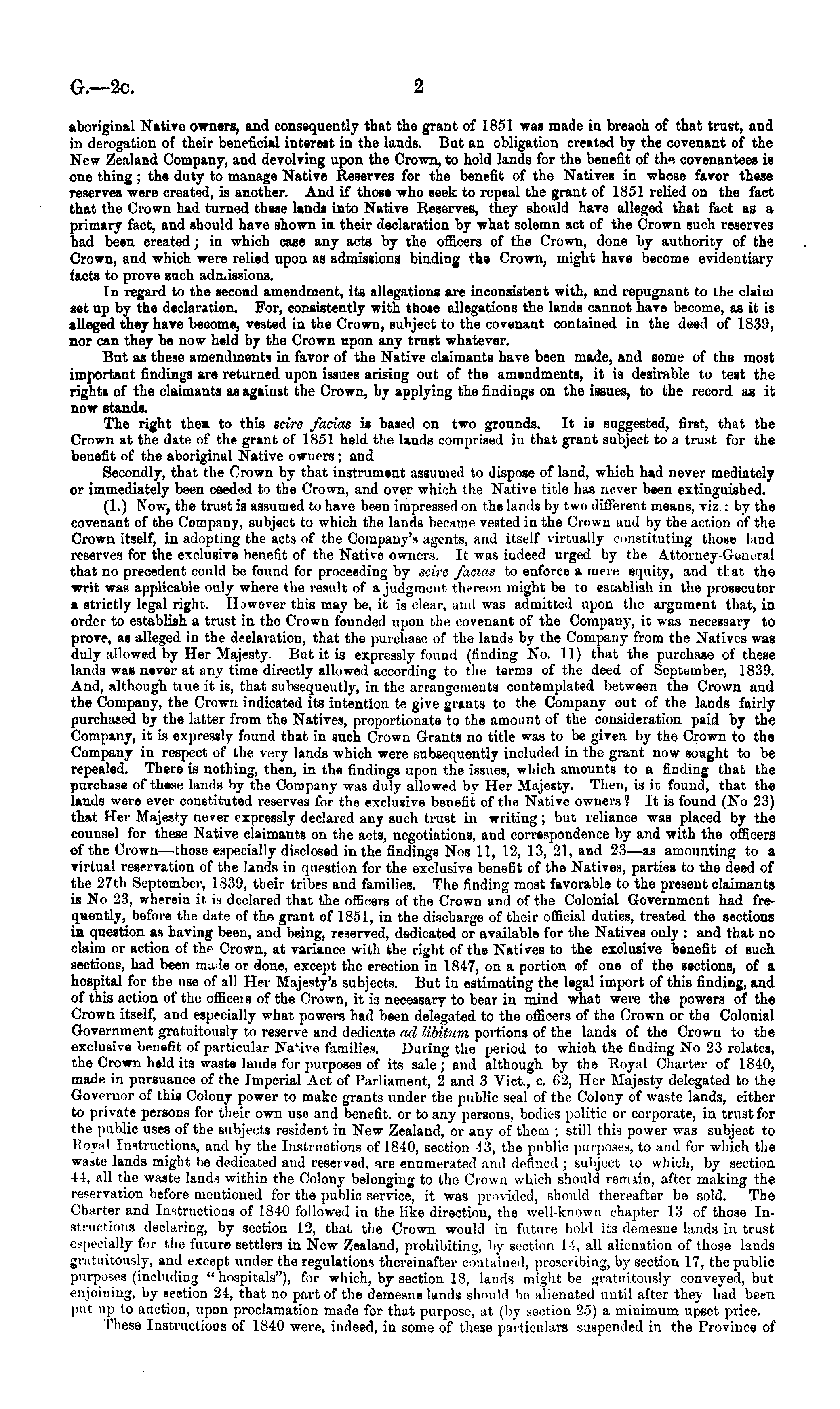 aboriginal Native owners, and consequently that the grant of 1851 was made in breach of that trust, and in derogation of their beneficial interest in the lands. But an obligation created by the covenant of the New Zealand Company, and devolving upon the Crown, to hold lands for the benefit of the covenantees is one thing; the duty to manage Native Reserves for the benefit of the Natives in whose favor these reserves were created, is another. And if thoss who seek to repeal the grant of 1851 relied on the fact that the Crown had turned these lands into Native Reserves, they should have alleged that fact as a primary fact, and should have shown in their declaration by what solemn act of the Crown such reserves had been created; in which case any acts by the officers of the Crown, done by authority of the Crown, and which were relied upon as admissions binding the Crown, might have become evidentiary facts to prove such admissions. In regard to the second amendment, its allegations are inconsistent with, and repugnant to the claim set up by the declaration. For, consistently with those allegations the lands cannot have become, as it is alleged they have become, vested in the Crown, subject to the covenant contained in the deed of 1839, nor can they be now held by the Crown upon any trust whatever. But as these amendments in favor of the Native claimants have been made, and some of the most important findings are returned upon issues arising out of the amendments, it is desirable to test the rights of the claimants as against the Crown, by applying the findings on the issues, to the record as it now stands. The right then to this scire facias is based on two grounds. It is suggested, first, that the Crown at the date of the grant of 1851 held the lands comprised in that grant subject to a trust for the benefit of the aboriginal Native owners; and Secondly, that the Crown by that instrument assumed to dispose of land, which had never mediately or immediately been ceeded to the Crown, and over which the Native title has never been extinguished. (1.) Now, the trust is assumed to have been impressed on the lands by two different means, viz.: by the covenant of the Company, subject to which the lands became vested in the Crown and by the action of the Crown itself, in adopting the acts of the Company's agents, and itself virtually constituting those land reserves for the exclusive benefit of the Native owners. It was indeed urged by the Attorney-G-iural that no precedent could be found for proceeding by scire facias to enforce a mere equity, and tbat the writ was applicable only where the result of a judgment thereon might be to establish in the prosecutor a strictly legal right. However this may be, it is clear, and was admitted upon the argument that, in order to establish a trust in the Crown founded upon the covenant of the Company, it was necessary to prove, as alleged in the declaration, that the purchase of the lands by the Company from the Natives was duly allowed by Her Majesty. But it is expressly fotiud (finding No. 11) that the purchase of these lands was never at any time directly allowed according to the terms of the deed of September, 1839. And, although tiue it is, that subsequently, in the arrangements contemplated between the Crown and the Company, the Crown indicated its intention te give grants to the Company out of the lands fairly purchased by the latter from the Natives, proportionate to the amount of the consideration paid by the Company, it is expressly found that in such Crown Grants no title was to be given by the Crown to the Company in respect of the very lands which were subsequently included in the grant now sought to be repealed. There is nothing, then, in the findings upon the issues, which amounts to a finding that the purchase of these lands by the Company was duly allowed by Her Majesty. Then, is it found, that the lsnds were ever constituted reserves for the exclusive benefit of the Native owners 1 It is found (No 23) that Her Majesty never expressly declared any such trust in writing; but reliance was placed by the counsel for these Native claimants on the acts, negotiations, and correspondence by and with the officers of the Crown—those especially disclosed in the findings Nos 11, 12, 13, 21, and 23—as amounting to a virtual reservation of the lands in question for the exclusive benefit of the Natives, parties to the deed of the 27th September, 1839, their tribes and families. The finding most favorable to the present claimants is No 23, wherein it is declared that the officers of the Crown and of the Colonial Government had frequently, before the date of the grant of 1851, in the discbarge of their official duties, treated the sections in question as having been, and being, reserved, dedicated or available for the Natives only : and that no claim or action of tho Crown, at variance with the right of the Natives to the exclusive benefit of such sections, had been made or done, except the erection in 1847, on a portion of one of the sections, of a hospital for the use of all Her Majesty's subjects. But in estimating the legal import of this finding, and of this action of the officeis of the Crown, it is necessary to bear in mind what were the powers of the Crown itself, and especially what powers had been delegated to the officers of the Crown or the Colonial Government gratuitously to reserve and dedicate ad libitum portions of the lands of the Crown to the exclusive benefit of particular Native families. During the period to which the finding No 23 relates, the Crown held its waste lands for purposes of its sale; and although by the Royal Charter of 1840, made in pursuance of the Imperial Act of Parliament, 2 and 3 Vict., c. 62, Her Majesty delegated to the Governor of this Colony power to make grants under the public seal of the Colony of waste lands, either to private persons for their own use and benefit, or to any persons, bodies politic or corporat