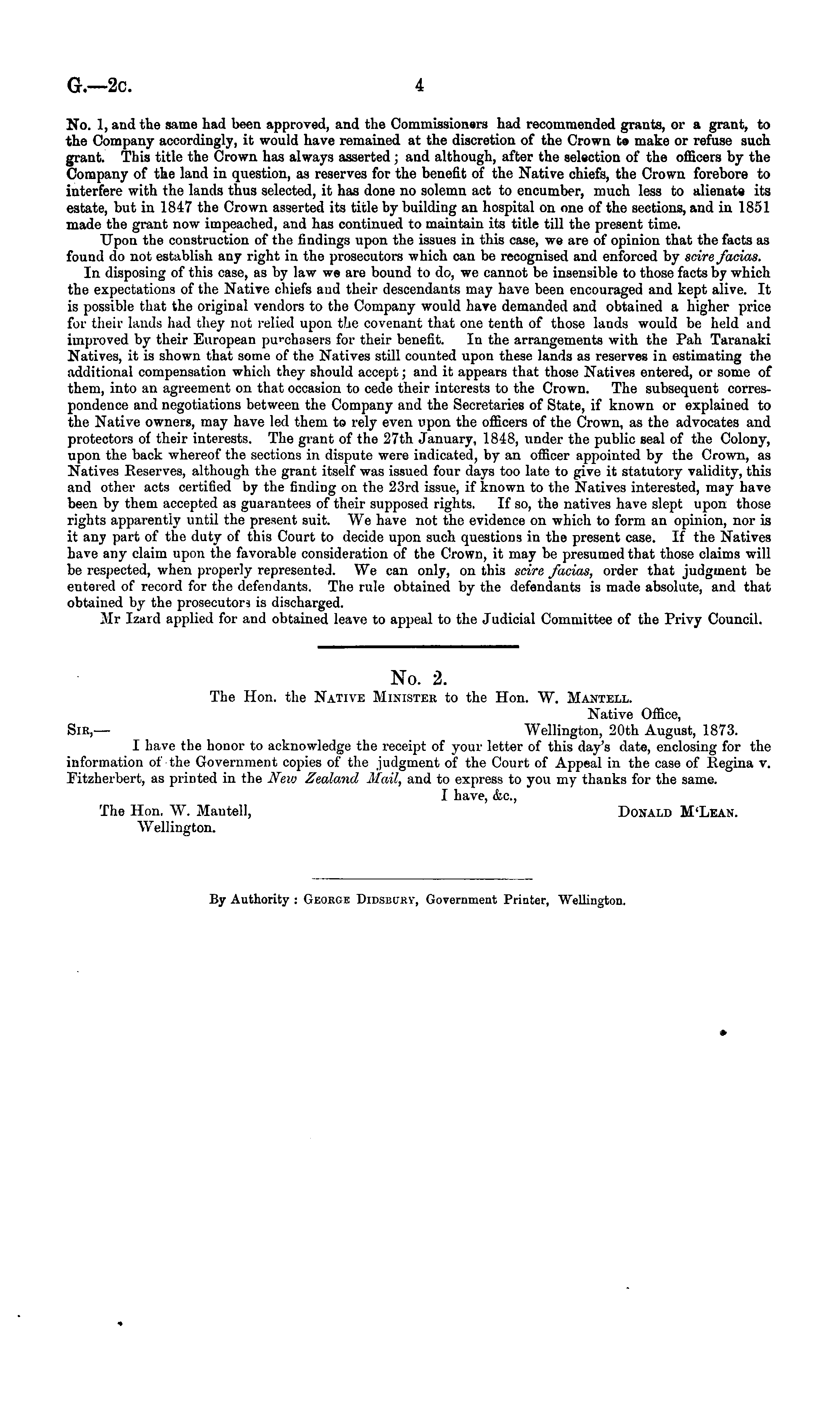 No. 2. The Hon. the Native Minister to the Hon. W. Mantell. Native Office, Sir,— Wellington, 20th August, 1873. I have the honor to acknowledge the receipt of your letter of this day's date, enclosing for the information of the Government copies of the judgment of the Court of Appeal in the case of Regina v. Fitzherbert, as printed in the New Zealand Mail, and to express to you my thanks for the same. I have, &c, The Hon. W. Mantell, Donald M'Lean. Wellington. By Authority : Geokge Didsbcrv, Government Printer, Wellington.