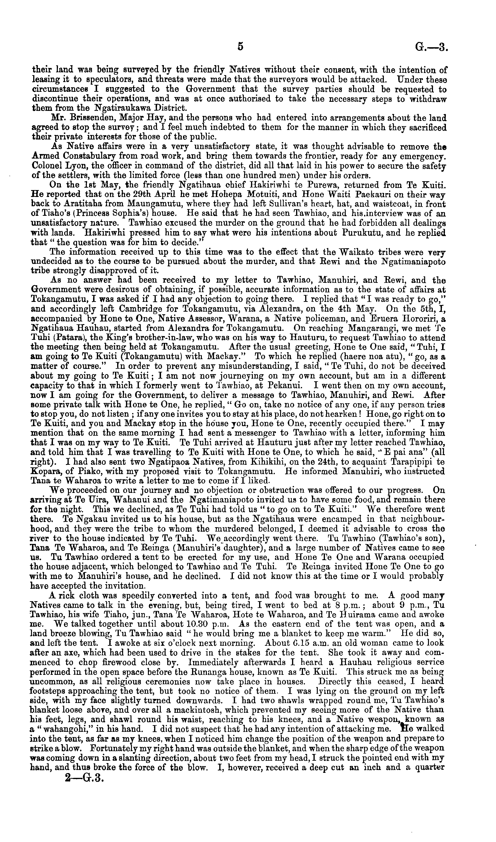 their land was being surveyed by the friendly Natives without their consent, with the intention of leasing it to speculators, and threats were made that the surveyors would be attacked. Under these circumstances I suggested to the Government that the survey parties should be requested to discontinue their operations, and was at once authorised to take the necessary steps to withdraw them from the Ngatiraukawa District. Mr. Brissenden, Major Hay, and the persons who had entered into arrangements about the land agreed to stop the survey; and I feel much indebted to them for the manner in which they sacrificed their private interests for those of the public. As Native affairs were in a very unsatisfactory state, it was thought advisable to remove the Armed Constabulary from road work, and bring them towards the frontier, ready for any emergency. Colonel Lyon, the officer in command of the district, did all that laid in his power to secure the safety of the settlers, with the limited force (less than one hundred men) under his orders. On the Ist May, the friendly Ngatihaua chief Hakiriwhi te Purewa, returned from Te Kuiti. He reported that on the 29th April he met Hohepa Motuiti, and Hone Waiti Paekauri on their way back to Aratitaha from Maungamutu, where they had left Sullivan's heart, hat, and waistcoat, in front of Tiaho's (Princess Sophia's) house. He said that he had seen Tawhiao, and his.interview was of an unsatisfactory nature. Tawhiao excused the murder on the ground that he had forbidden all dealings with lands. Hakiriwhi pressed him to say what were his intentions about Purukutu, and he replied that " the question was for him to decide." The information received up to this time was to the effect that the Waikato tribes were very undecided as to the course to be pursued about the murder, and that Eewi and the Ngatimaniapoto tribe strongly disapproved of it. As no answer had been received to my letter to Tawhiao, Manuhiri, and Eewi, and the Government were desirous of obtaining, if possible, accurate information as to the state of affairs at Tokangamutu, I was asked if I had any objection to going there. I replied that "I was ready to go," and accordingly left Cambridge for Tokangamutu, via Alexandra, on the 4th May. On tho sth, I, accompanied by Hone te One, Native Assessor, AVarana, a Native policeman, and Eruera Hororiri, a Ngatihaua Hauhau, started from Alexandra for Tokangamutu. On reaching Mangarangi, we met Te Tuhi (Patara), the King's brother-in-law, who was on his way to Hauturu, to request Tawhiao to attend the meeting then being held at Tokangamutu. After the usual greeting, Hone te One said, " Tuhi, I am going to Te Kuiti (Tokangamutu) with Mackay." To which he replied (haere noa atu), " go, as a matter of course." In order to prevent any misunderstanding, I said, "Te Tuhi, do not be deceived about my going to Te Kuiti; lam not now journeying on my own account, but am in a different capacity to that in which I formerly went to Tawhiao, at Pekanui. I went then on my own account, now I am going for the Government, to deliver a message to Tawhiao, Manuhiri, and Eewi. After some private talk with Hone te One, he replied, " Go on, take no notice of any one, if any person tries to stop you, do not listen ;if any one invites you to stay at his place, do not hearken! Hone, go right on to Te Kuiti, and you and Mackay stop in the house you, Hone te One, recently occupied there." I may mention that on the same morning I had sent a messenger to Tawhiao with a letter, informing him that I was on my way to Te Kuiti. Te Tuhi arrived at Hauturu just after my letter reached Tawhiao, and told him that I was travelling to Te Kuiti with Hone te One, to which he said, •' E pai ana" (all right). I had also sent two Ngatipaoa Natives, from Kihikihi, on the 24th, to acquaint Tarapipipi te Kopara, of Piako, with my proposed visit to Tokangamutu. He informed Manuhiri, who instructed Tana te Waharoa to write a letter to me to come if I liked. We proceeded on our journey and no objection or obstruction was offered to our progress. On arriving at Te Uira, Wahanui and the Ngatimaniapoto invited us to have some food, and remain there for the night. This we declined, as Te Tuhi had told us "togoon to Te Kuiti." We therefore went there. Te Ngakau invited us to his house, but as the Ngatihaua were encamped in that neighbourhood, and they were the tribe to whom the murdered belonged, I deemed it advisable to cross the river to the house indicated by To Tuhi. We accordingly went there. Tv Tawhiao (Tawhiao's son), Tana Te Waharoa, and Te Eeinga (Manuhiri's daughter), and a large number of Natives came to see us. Tv Tawhiao ordered a tent to be erected for my use, and Hone Te One and Warana occupied the house adjacent, which belonged to Tawhiao and Te Tuhi. Te Eeinga invited Hone Te One to go with me to Manuhiri's house, and he declined. I did not know this at the time or I would probably have accepted the invitation. A rick cloth was speedily converted into a tent, and food was brought to me. A good many Natives came to talk in the evening, but, being tired, I went to bed at 8 p.m.; about 9 p.m., Tv Tawhiao, his wife Tiaho, jun., Tana Te AVaharoa, Hote te AVaharoa, and Te Huirama came and awoke me. We talked together until about 10.30 p.m. As the eastern end of the tent was open, and a land breeze blowing, Tv Tawhiao said "he would bring me a blanket to keep me warm." He did so, and left the tent. I awoke at six o'clock next morning. About G. 15 a.m. an old woman came to look after an axe, which had been used to drive in the stakes for the tent. She took it away and commenced to chop firewood close by. Immediately afterwards I heard a Hauhau religious service performed in the open space before the Eunanga house, known as Te Kuiti. This struck me as being uncommon, as all religious ceremonies now take place in houses. Directly this ceased, I heard footsteps approaching the tent, but took no notice of them