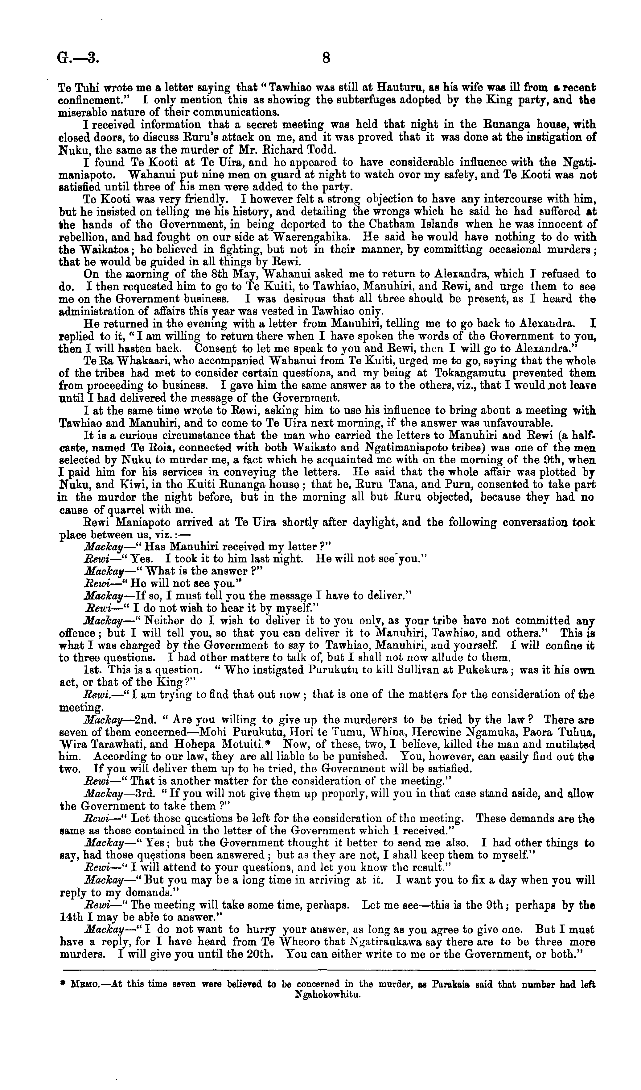 Te Tuhi wrote me a letter saying that " Tawhiao was still at Hauturu, as his wife was ill from a recent confinement." 1 only mention this as showing the subterfuges adopted by the King party, and the miserable nature of their communications. I received information that a secret meeting was held that night in the Bunanga house, with closed doors, to discuss Bum's attack on me, and it was proved that it was done at the instigation of Nuku, the same as the murder of Mr. Bichard Todd. I found Te Kooti at Te Uira, and ho appeared to have considerable influence with the Ngatimaniapoto. Wahanui put nine men on guard at night to watch over my safety, and Te Kooti was not satisfied until three of his men were added to the party. Te Kooti was very friendly. I however felt a strong objection to have any intercourse with him, but he insisted on telling me his history, and detailing the wrongs which he said he had suffered at the hands of the Government, in being deported to the Chatham Islands when he was innocent of rebellion, and had fought on our side at Waerengahika. He said he would have nothing to do with the Waikatos; he believed in fighting, but not in their manner, by committing occasional murders ; that he would be guided in all things by Eewi. On the morning of the Bth May, Wahanui asked me to return to Alexandra, which I refused to do. I then requested him to go to Te Kuiti, to Tawhiao, Manuhiri, and Eewi, and urge them to see me on the Government business. I was desirous that all three should be present, as I heard the administration of affairs this year was vested in Tawhiao only. He returned in the evening with a letter from Manuhiri, telling me to go back to Alexandra. I replied to it, " I am willing to return there when I have spoken the words of the Government to you, then I will hasten back. Consent to let me speak to you and Eewi, then I will go to Alexandra." Te Ea Whakaari, who accompanied Wahanui from Te Kuiti, urged me to go, saying that the whole of the tribes had met to consider certain questions, and my being at Tokangamutu prevented them from proceeding to business. I gave him the same answer as to the others, viz., that I would not leave until I had delivered the message of the Government. I at the same time wrote to Eewi, asking him to use his influence to bring about a meeting with Tawhiao and Manuhiri, and to come to Te Uira next morning, if the answer was unfavourable. It is a curious circumstance that the man who carried the letters to Manuhiri and Eewi (a halfcaste, named Te Eoia, connected with both Waikato and Ngatimaniapoto tribes) was one of the men selected by Nuku to murder me, a fact which he acquainted me with on the morning of the 9th, when I paid him for his services in conveying the letters. He said that the whole affair was plotted by Nuku, and Kiwi, in the Kuiti Eunanga house ; that he, Euru Tana, and Puru, consented to take part in the murder the night before, but in the morning all but Euru objected, because they had no cause of quarrel with me. Eewi Maniapoto arrived at Te Uira shortly after daylight, and the following conversation tooV place between us, viz.: — Mackay —" Has Manuhiri received my letter ?" Rewi —" Yes. I took it to him last night. He will not seeyou." Mackay —" What is the answer ?" Rewi —"He will not see you." Mackay —If so, I must tell you the message I have to deliver." Rewi —" Ido not wish to hear it by myself." Mackay —" Neither do I wish to deliver it to you only, as your tribe have not committed any offence ; but I will tell you, so that you can deliver it to Manuhiri, Tawhiao, and others." This is what I was charged by the Government to say to Tawhiao, Manuhiri, and yourself. I will confine it to three questions. I had other matters to talk of, but I shall not now allude to them. Ist. This is a question. " Who instigated Purukutu to kill Sullivan at Pukekura ; was it his own act, or that of the King?" Rewi. —"l am trying to find that out now ; that is one of the matters for the consideration of tbe meeting. Mackay —2nd. " Are you willing to give up the murderers to be tried by the law ? There are seven of them concerned—Mohi Purukutu, Hori te Tumu, Whina, Herewine Ngamuka, Paora Tuhua, Wira Tarawhati, and Hohepa Motuiti.* Now, of these, two, I believe, killed the man and mutilated him. According to our law, they are all liable to be punished. Tou, however, can easily find out the two. If you will deliver them up to be tried, the Government will be satisfied. Rewi —" That is another matter for the consideration of the meeting." Mackay —3rd. "If you will not give them up properly, will you in that case stand aside, and allow the Government to take them ?" Rewi —" Let those questions bo left for the consideration of the meeting. These demands are the same as those contained in the letter of the Government which I received." Mackay —" Yes; but the Government thought it better to send me also. I had other things to say, had those questions been answered; but as they are not, I shall keep them to myself." Rewi —" I will attend to your questions, and let you know the result." Mackay —" But you may be a long time in arriving at it. I want you to fix a day when you will reply to my demands." Rewi —" The meeting will take some time, perhaps. Let me see —this is tho 9th ; perhaps by the 14th I may be able to answer." Mackay —"l do not want to hurry your answer, as long as you agree to give one. But I must have a reply, for I have heard from Te Wheoro that Ngatiraukawa say there are to be three more murders. I will give you until the 20th. You can either write to mo or the Government, or both." * Memo. —At this time seven were believed to be concerned in the murder, as Parakaia said that number had left Ngahokowhitu.