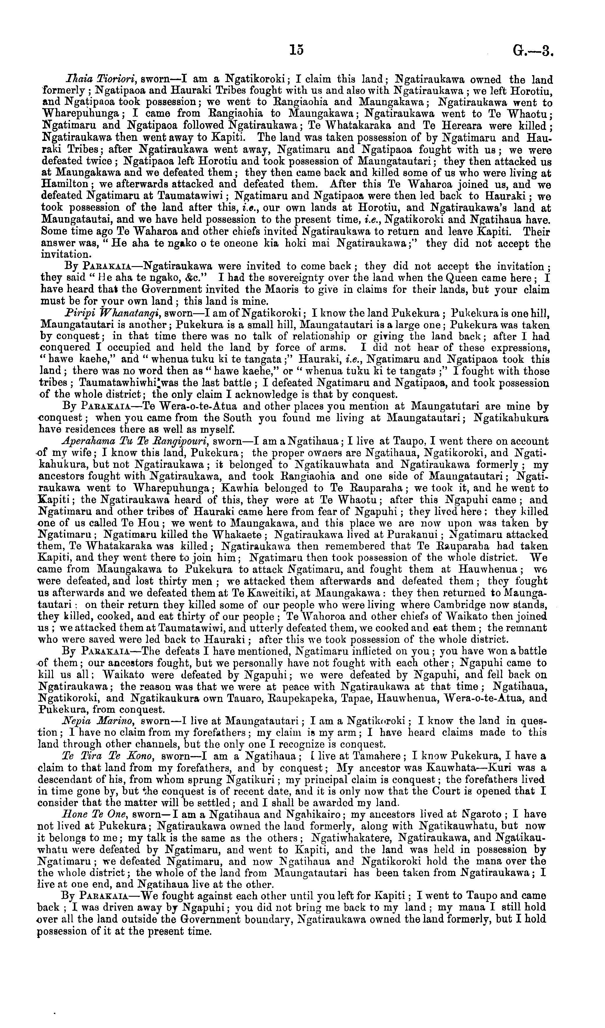 Ihaia Tioriori, sworn —I am a Ngatikoroki; I claim this land; Ngatiraukawa owned the land formerly ; Ngatipaoa and Hauraki Tribes fought with us and also with Ngatiraukawa ; we left Horotiu, and Ngatipaoa took possession; we went to Eangiaohia and Maungakawa; Ngatiraukawa went to Wharepuhunga; I came from Eangiaohia to Maungakawa; Ngatiraukawa went to Te Whaotu; Ngatimaru and Ngatipaoa followed Ngatiraukawa; Te AVhatakaraka and Te Hereara were killed; Ngatiraukawa then went away to Kapiti. The land was taken possession of by Ngatimaru and Hauraki Tribes; after Ngatiraukawa went away, Ngatimaru and Ngatipaoa fought with us; we were defeated twice ; Ngatipaoa left Horotiu and took possession of Maungatautari; they then attacked us at Maungakawa and we defeated them; they then came back and killed some of us who were living at Hamilton ; w re afterwards attacked and defeated them. After this Te Waharoa joined us, and we defeated Ngatimaru at Taumatawiwi; Ngatimaru and Ngatipaoa were then led back to Hauraki; we took possession of the land after this, i.e., our own lands at Horotiu, and Ngatiraukawa's land at Maungatautai, and we have held possession to the present time, i.e., Ngatikoroki and Ngatihaua have. Some time ago Te Waharoa and other chiefs invited Ngatiraukawa to return and leave Kapiti. Their answer was, "He aha te ngako ote oneone kia hoki mai Ngatiraukawa;" they did not accept tho invitation. By Paeakaia —Ngatiraukawa were invited to come back ; they did not accept the invitation ; they said "He aha te ngako, &c." I had the sovereignty over the land when the Queen came here; I have heard that the Government invited the Maoris to give in claims for their lands, but your claim must be for your own land ; this land is mine. Piripi Whanatangi, sworn —I am of Ngatikoroki; I know the land Pukekura ; Pukekura is one hill, Maungatautari is another; Pukekura is a small hill, Maungatautari is a large one ; Pukekura was taken by conquest; in that time there was no talk of relationship or giving the land back; after I had conquered I occupied and held the land by force of arms. I did not hear of these expressions, " hawe kaehe," and " whenua tuku kite tangata ;" Hauraki, i.e., Ngatimaru and Ngatipaoa took this land ; there was no word then as " hawe kaehe," or " whenua tuku kite tangato ;" I fought with those tribes ; Taumatawhiwhi'was the last battle ; I defeated Ngatimaru and Ngatipaoa, and took possession of the whole district; the only claim I acknowledge is that by conquest. By Paeakaia—Te Wera-o-te-Atua and other places you mention at Maungatutari are mine by conquest; when you came from the South you found me living at Maungatautari; Ngatikahukura have residences there as well as myself. Aperahama Tv, Te Rangipouri, sworn —I am a Ngatihaua; I live at Taupo, I went there on account •of my wife; I know this land, Pukekura; the proper owners are Ngatihaua, Ngatikoroki, and Ngatikahukura, but not Ngatiraukawa ; it belonged to Ngatikauwhata and Ngatiraukawa formerly ; my ancestors fought with Ngatiraukawa, and took Eangiaohia and one side of Maungatautari; Ngatiraukawa went to AVharepuhunga; Kawhia belonged to Te Eauparaha; we took it, and he went to Kapiti; the Ngatiraukawa heard of this, they were at Te Whaotu; after this Ngapuhi came ; and Ngatimaru and other tribes of Hauraki came here from fear of Ngapuhi; they lived here ; they killed one of us called Te Hou; we went to Maungakawa, and this place we are now upon was taken by Ngatimaru ; Ngatimaru killed the AVhakaete ; Ngatiraukawa lived at Purakanui; Ngatimaru attacked them, Te AVhatakaraka was killed; Ngatiraukawa then remembered that Te Eauparaha had taken Kapiti, and they went there to join him ; Ngatimaru then took possession of the whole district. We came from Maungakawa to Pukekura to attack Ngatimaru, and fought them at Hauwhenua ; W6 were defeated, and lost thirty men ; we attacked them afterwards and defeated them; they fought us afterwards and we defeated them at Te Kaweitiki, at Maungakawa : they then returned to Maungatautari •. on their return they killed some of our people who were living where Cambridge now stands, they killed, cooked, and eat thirty of our people ; Te Wahoroa and other chiefs of AVaikato then joined us ; we attacked them at Taumatawiwi, and utterly defeated them, we cooked and eat them ; the remnant who were saved were led back to Hauraki; after this we took possession of the whole district. By Paeakaia —The defeats I have mentioned, Ngatimaru inflicted on you; you have won a battle of them; our ancestors fought, but we personally have not fought with each other; Ngapuhi came to kill us all; Waikato were defeated by Ngapuhi; we were defeated by Ngapuhi, and fell back on Ngatiraukawa; the reason was that we were at peace with Ngatiraukawa at that time ; Ngatihaua, Ngatikoroki, and Ngatikaukura own Tauaro, Eaupekapeka, Tapae, Hauwhenua, AVera-o-te-Atua, and Pukekura, from conquest. Nepia Marino, sworn —I live at Maungatautari; lam a Ngatikoroki; I know the land in question ; I have no claim from my forefathers ;my claim is my arm; I have heard claims made to this land through other channels, but the only one I recognize is conquest. Te Tira Te Kono, sworn—l am a Ngatihaua ; [ live at Tamahere ; I know Pukekura, I have a claim to that land from my forefathers, and by conquest; My ancestor was Kauwhata-—Kuri was a descendant of his, from whom sprung Ngatikuri; my principal claim is conquest; the forefathers lived in time gone by, but the conquest is of recent date, and it is only now that the Court is opened that I consider that the matter will be settled ; and I shall be awarded my land. Hone Te One, sworn —I am a Ngatihaua and Ngahikairo; my ancestors lived at Ngaroto ; I have not lived at Pukekura; Ngatiraukawa owned tho land formerly, along with Ngatikauwhatu, but now it belongs to me; my talk is the same as the others; Ngatiwhakatere, Ngatiraukawa, and Ngatikauwhatu were def
