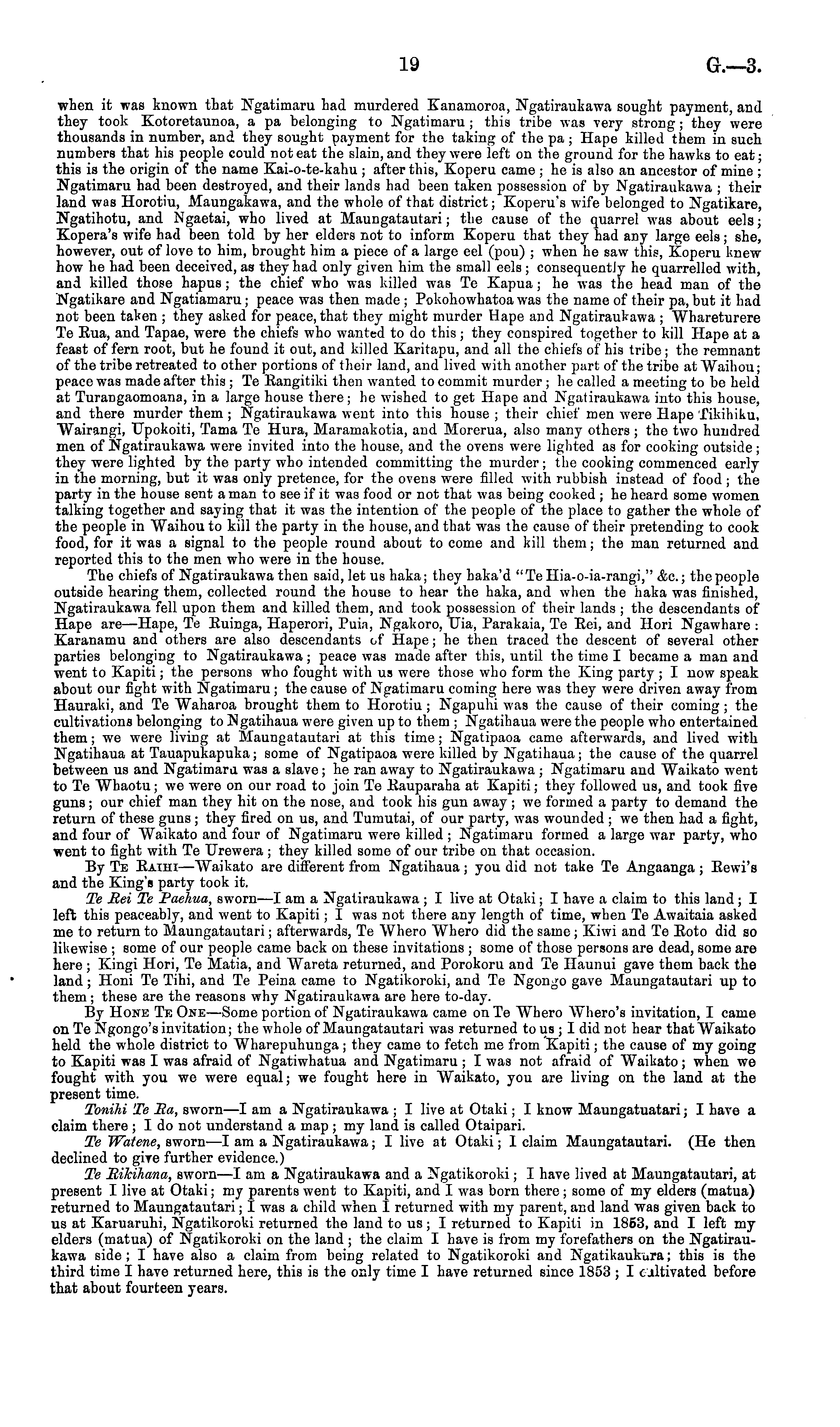 when it was known that Ngatimaru had murdered Kanamoroa, Ngatiraukawa sought payment, and they took Kotoretaunoa, a pa belonging to Ngatimaru ; this tribe was very strong ; they were thousands in number, and they sought payment for the taking of the pa ; Hape killed them in such numbers that his people could not eat the slain, and they were left on the ground for the hawks to eat; this is the origin of the name Kai-o-te-kahu ; after this, Koperu came ; he is also an ancestor of mine ; Ngatimaru had been destroyed, and their lands had been taken possession of by Ngatiraukawa j their land was Horotiu, Maungakawa, and the whole of that district; Koperu's wife belonged to Ngatikare, Ngatihotu, and Ngaetai, who lived at Maungatautari; the cause of the quarrel was about eels; Kopera's wife had been told by her elders not to inform Koperu that they had any large eels; she, however, out of love to him, brought him a piece of a large eel (pou) ; when he saw this, Koperu knew how he had been deceived, as they had only given him the small eels; consequently he quarrelled with, and killed those hapus ; the chief who was killed was Te Kapua; he was the head man of the Ngatikare and Ngatiamaru; peace was then made ; Pokohowhatoa was the name of their pa, but it had not been taken ; they asked for peace, that they might murder Hape and Ngatiraukawa ; AVhareturere Te Bua, and Tapae, were the chiefs who wanted to do this ; they conspired together to kill Hape at a feast of fern root, but he found it out, and killed Karitapu, and all the chiefs of his tribe; the remnant of the tribe retreated to other portions of their land, and lived with another part of the tribe at AVaihou; peace was made after this ; Te Bangitiki then wanted to commit murder ; he called a meeting to be held at Turangaomoana, in a large house there; he wished to get Hape and Ngatiraukawa into this house, and there murder them ; Ngatiraukawa went into this house ; their chief men were Hape Tikihiku, Wairangi, Upokoiti, Tama Te Hura, Maramakotia, and Morerua, also many others ; the two hundred men of Ngatiraukawa were invited into the house, and the ovens were lighted as for cooking outside; they were lighted by the party who intended committing the murder; the cooking commenced early in the morning, but it was only pretence, for the ovens were filled with rubbish instead of food ; the party in the house sent a man to see if it was food or not that was being cooked ; he heard some women talking together and saying that it was the intention of the people of the place to gather the whole of the people in Waihou to kill the party in the house, and that was the cause of their pretending to cook food, for it was a signal to the people round about to come and kill them; the man returned and reported this to the men who were in the house. The chiefs of Ngatiraukawa then said, let us haka; they haka'd "TeHia-o-ia-rangi," <fee.; the people outside hearing them, collected round the house to hear the haka, and when the haka was finished, Ngatiraukawa fell upon them and killed them, and took possession of their lands ; the descendants of Hape are —Hape, Te Buinga, Haperori, Puia, Ngakoro, Uia, Parakaia, Te Bei, and Hori Ngawhare : Karanamu and others are also descendants of Hape; he then traced the descent of several other parties belonging to Ngatiraukawa ; peace was made after this, until the time I became a man and went to Kapiti; the persons who fought with us were those who form the King party; I now speak about our fight with Ngatimaru ; the cause of Ngatimaru coming here was they were driven away from Hauraki, and Te AVaharoa brought them to Horotiu ; Ngapuhi was the cause of their coming ; the cultivations belonging to Ngatihaua were given up to them ; Ngatihaua were the people who entertained them; we were living at Maungatautari at this time; Ngatipaoa came afterwards, and lived with Ngatihaua at Tauapukapuka; some of Ngatipaoa were killed by Ngatihaua; the cause of the quarrel between us and Ngatimaru was a slave; he ran away to Ngatiraukawa ; Ngatimaru and Waikato went to Te AVhaotu; we were on our road to join Te Bauparaha at Kapiti; they followed us, and took five guns; our chief man they hit on the nose, and took his gun away ; we formed a party to demand the return of these guns; they fired on us, and Tumutai, of our party, was wounded ; we then had a fight, and four of Waikato and four of Ngatimaru were killed ; Ngatimaru formed a large war party, who went to fight with Te Urewera; they killed some of our tribe on that occasion. By Te Baihi —-AVaikato are different from Ngatihaua; you did not take Te Angaanga ; Eewi's and the King's party took it. Te Rei Te Paehua, sworn—l am a Ngatiraukawa ; I live at Otaki; I have a claim to this land ; I left this peaceably, and went to Kapiti; I was not there any length of time, when Te Awaitaia asked me to return to Maungatautari; afterwards, Te AVhero AV^hero did the same ; Kiwi and Te Boto did so likewise ; some of our people came back on these invitations ; some of those persons are dead, some are here ; Kingi Hori, Te Matia, and Wareta returned, and Porokoru and Te Haunui gave them back the land ; Honi Te Tihi, and Te Peina came to Ngatikoroki, and Te Ngongo gave Maungatautari up to them; these are the reasons why Ngatiraukawa are here to-day. By Hone Te One—Some portion of Ngatiraukawa came on Te Whero AA'hero's invitation, I came on Te Ngongo's invitation; the whole of Maungatautari was returned to us ; I did not hear that Waikato held the whole district to Wharepuhunga; they came to fetch me from Kapiti; the cause of my going to Kapiti was I was afraid of Ngatiwhatua and Ngatimaru ; I was not afraid of Waikato; when we fought with you we were equal; we fought here in AVaikato, you are living on the land at the present time. Tonihi Te Ra, sworn —I am a Ngatiraukawa ; I live at Otaki; I know Maungatuatari; I have a claim there ; I do not understand a map ; my land is called Otaip