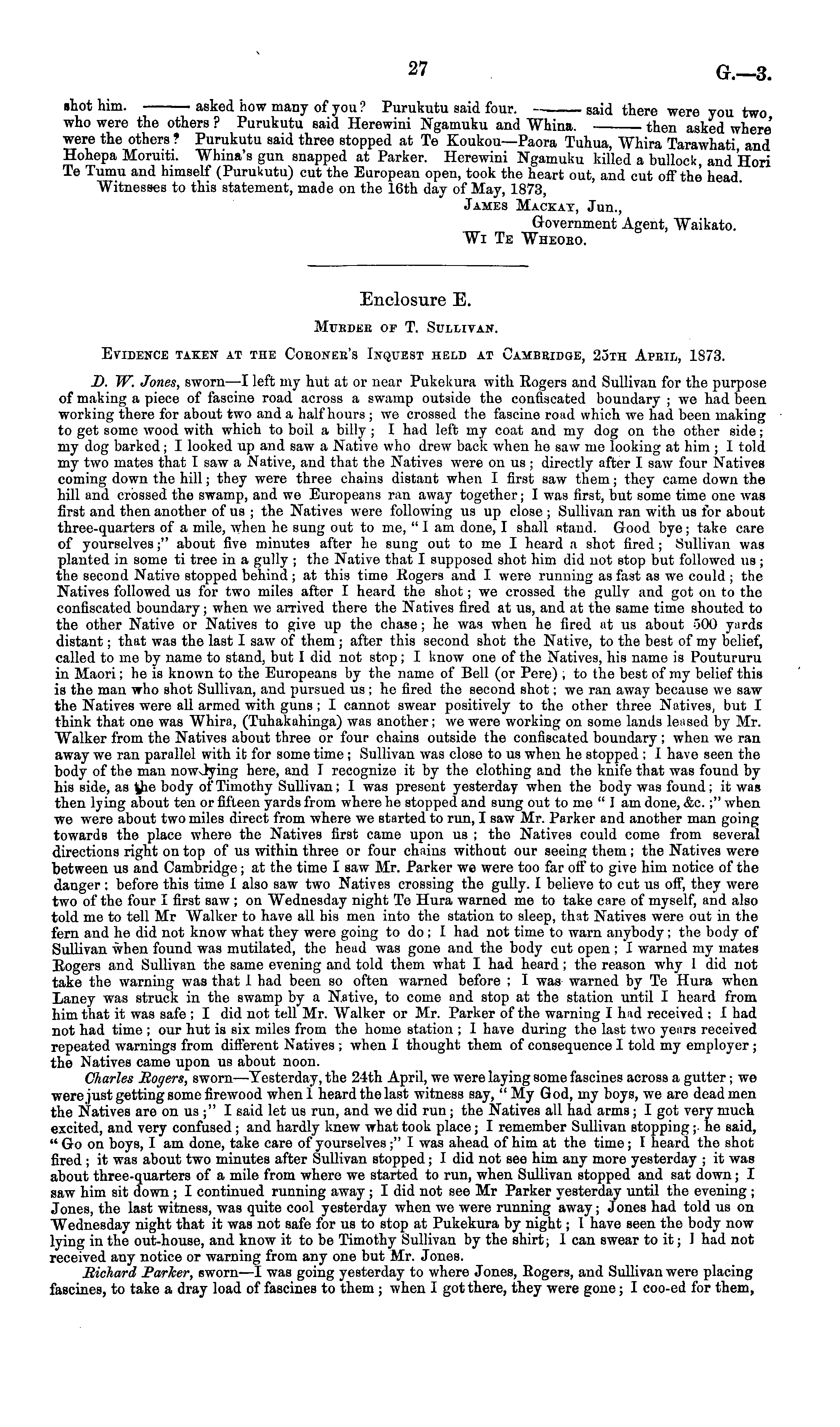 Enclosure E. Muedee of T. Sullivan. Evidence taken at the Coeonee's Inquest held at Cambeidge, 25th Apbil, 1573. D. W. Jones, sworn —I left my hut at or near Pukekura with Eogers and Sullivan for the purpose of making a piece of fascine road across a swamp outside the confiscated boundary ; we had been working there for about two and a half hours ; we crossed the fascine road which we had been making to get some wood with which to boil a billy ; I had left my coat and my dog on the other side; my dog barked; I looked up and saw a Native who drew back when he saw me looking at him ; 1 told my two mates that I saw a Native, and that the Natives were on us; directly after I saw four Natives coming down the hill; they were three chains distant when I first saw them; they came down the hill and crossed the swamp, and we Europeans ran away together; I was first, but some time one was first and then another of us ; the Natives were following us up close ; Sullivan ran with us for about three-quarters of a mile, when he sung out to me, "I am done, I shall stand. Good bye; take care of yourselves;" about five minutes after he sung out to me I heard a shot fired; Sullivan was planted in some ti tree in a gully ; the Native that I supposed shot him did not stop but followed us ; the second Native stopped behind ; at this time Eogers and I were running as fast as we could ; the Natives followed us for two miles after I heard the shot; we crossed the gully and got on to the confiscated boundary; when we arrived there the Natives fired at us, and at the same time shouted to the other Native or Natives to give up the chase; he was when he fired at us about 500 yards distant; that was the last I saw of them ; after this second shot the Native, to the best of my belief, called to me by name to stand, but I did not stop; I know one of the Natives, his name is Poutururu in Maori; he is known to the Europeans by the name of Bell (or Pero) , to the best of my belief this is the man who shot Sullivan, and pursued us ;he fired the second shot; we ran away because we saw the Natives were all armed with guns ; I cannot swear positively to tho other three Natives, but I think that one was Whira, (Tuhakahinga) was another; we were working on some lands leased by Mr. Walker from the Natives about three or four chains outside the confiscated boundary ; when we ran away we ran parallel with it for some time ; Sullivan was close to us when he stopped ; I havo seen the body of the man now lying here, and I recognize it by the clothing and tho knife that was found by his side, as body of Timothy Sullivan; I was present yesterday when the body was found; it was then lying about ten or fifteen yards from where he stopped and sung out to me "I am done, &c.;" when we were about two miles direct from where we started to run, I saw Mr. Parker and another man going towards the place where the Natives first came upon us ; the Natives could come from several directions right on top of us within three or four chains without our seeing them ; the Natives were between us and Cambridge; at the time I saw Mr. Parker we were too far off to give him notice of the danger ; before this time I also saw two Natives crossing the gully. I believe to cut us off, they were two of the four I first saw ; on AVednesday night Te Hura warned me to take care of myself, and also told me to tell Mr AValker to have all his men into the station to sleep, that Natives were out in the fern and he did not know what they were going to do ; I had not time to warn anybody ; the body of Sullivan when found was mutilated, the head was gone and the body cut open ; I warned my mates Eogers and Sullivan the same evening and told them what I had heard ; the reason why I did not take the warning was that 1 had been so often warned before ; I was warned by Te Hura when Laney was struck in the swamp by a Native, to come and stop at the station until I heard from him that it was safe ; I did not tell Mr. AValker or Mr. Parker of the warning I had received ; I had not had time ; our hut is six miles from the home station ; I have during the last two years received repeated warnings from different Natives ; when I thought them of consequence I told my employer ; the Natives came upon us about noon. Charles Rogers, sworn —Yesterday, the 24th April, we were laying some fascines across a gutter; we were just getting some firewood when 1 heard the last witness say, " My God, my boys, we are dead men the Natives are on us ;" I said let us run, and we did run; the Natives all had arms; I got very much excited, and very confused ; and hardly knew what took place; I remember Sullivan stopping; he said, " Go on boys, I am done, take care of yourselves ;" I was ahead of him at the time ; I heard the shot fired ; it was about two minutes after Sullivan stopped; I did not see him any more yesterday ; it was about three-quarters of a mile from where we started to run, when Sullivan stopped and sat down; I saw him sit down ; I continued running away ; I did not see Mr Parker yesterday until the evening ; Jones, the last witness, was quite cool yesterday when we were running away; Jones had told us on Wednesday night that it was not safe for us to stop at Pukekura by night; I have seen the body now lying in the out-house, and know it to be Timothy Sullivan by the shirt; 1 can swear to it; 1 had not received any notice or warning from any one but Mr. Jones. Richard Parker, sworn —I was going yesterday to where Jones, Eogers, and Sullivan were placing fascines, to take a dray load of fascines to them ; when I got there, they were gone; I coo-ed for them,