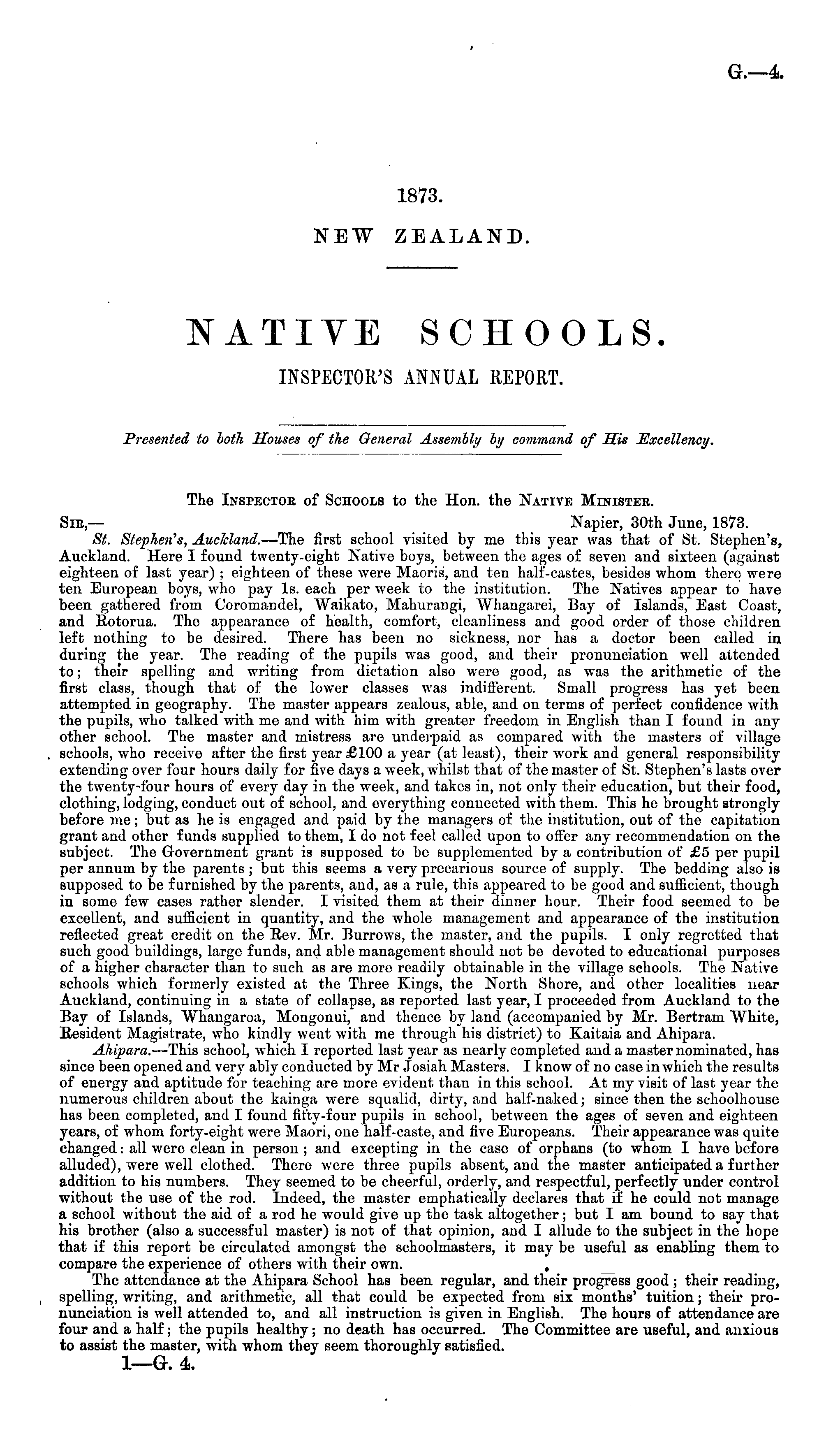 The Inspectoe of Schools to the Hon. the Native Ministee. Sic,— Napier, 30th June, 1873. St. Stephen's, Auckland. —The first school visited by me this year was that of St. Stephen's, Auckland. Here I found twenty-eight Native boys, between the ages of seven and sixteen (against eighteen of last year) ; eighteen of these were Maoris, and ten half-castes, besides whom there were ten European boys, who pay Is. each per week to the institution. The Natives appear to have been gathered from Coromandel, Waikato, Mahurangi, Whangarei, Bay of Islands, East Coast, and Rotorua. The appearance of health, comfort, cleanliness and good order of those children left nothing to be desired. There has been no sickness, nor has a doctor been called in during the year. The reading of the pupils was good, and their pronunciation well attended to; their spelling and writing from dictation also were good, as was the arithmetic of the first class, though that of the lower classes was indifferent. Small progress has yet been attempted in geography. The master appears zealous, able, and on terms of perfect confidence with the pupils, who talked with me and with him with greater freedom in English than I found in any other school. The master and mistress aro underpaid as compared with the masters of village schools, who receive after the first year £100 a year (at least), their work and general responsibility extending over four hours daily for five days a week, whilst that of the master of St. Stephen's lasts over the twenty-four hours of every day in the week, and takes in, not only their education, but their food, clothing, lodging, conduct out of school, and everything connected with them. This he brought strongly before me; but as he is engaged and paid by the managers of the institution, out of the capitation grant and other funds supplied to them, I do not feel called upon to offer any recommendation on the subject. The Government grant is supposed to be supplemented by a contribution of £5 per pupil per annum by the parents ; but this seems a very precarious source of supply. The bedding also is supposed to be furnished by the parents, and, as a rule, this appeared to be good and sufficient, though in some few cases rather slender. I visited them at their dinner hour. Their food seemed to be excellent, and sufficient in quantity, and the whole management and appearance of the institution reflected great credit on the Rev. Mr. Burrows, the master, and the pupils. I only regretted that such good buildings, large funds, and able management should not be devoted to educational purposes of a higher character than to such as are more readily obtainable in the village schools. The Native schools which formerly existed at the Three Kings, the North Shore, and other localities near Auckland, continuing in a state of collapse, as reported last year, I proceeded from Auckland to the Bay of Islands, Whangaroa, Mongonui, and thence by land (accompanied by Mr. Bertram White, Resident Magistrate, who kindly went with me through his district) to Kaitaia and Ahipara. Ahipara. —This school, which I reported last year as nearly completed and a master nominated, has since been opened and very ably conducted by Mr Josiah Masters. I know of no case in which the results of energy and aptitude for teaching are more evident than in this school. At my visit of last year the numerous children about the kainga were squalid, dirty, and half-naked; since then the schoolhouse has been completed, and I found fifty-four pupils in school, between the ages of seven and eighteen years, of whom forty-eight were Maori, one half-caste, and five Europeans. Their appearance was quite changed: all were clean in person ; and excepting in the case of orphans (to whom I have before alluded), were well clothed. There were three pupils absent, and the master anticipated a further addition to his numbers. They seemed to be cheerful, orderly, and respectful, perfectly under control without the use of the rod. Indeed, the master emphatically declares that if he could not manage a school without the aid of a rod he would give up the task altogether; but I am bound to say that his brother (also a successful master) is not of that opinion, and I allude to the subject in the hope that if this report be circulated amongst tho schoolmasters, it may be useful as enabling them to compare the experience of others with their own. , The attendance at the Ahipara School has been regular, and their progress good ; their reading, spelling, writing, and arithmetic, all that could be expected from six months' tuition; their pronunciation is well attended to, and all instruction is given in English. The hours of attendance are four and a half; the pupils healthy; no death has occurred. The Committee are useful, and anxious to assist the master, with whom they seem thoroughly satisfied. I—G. 4.