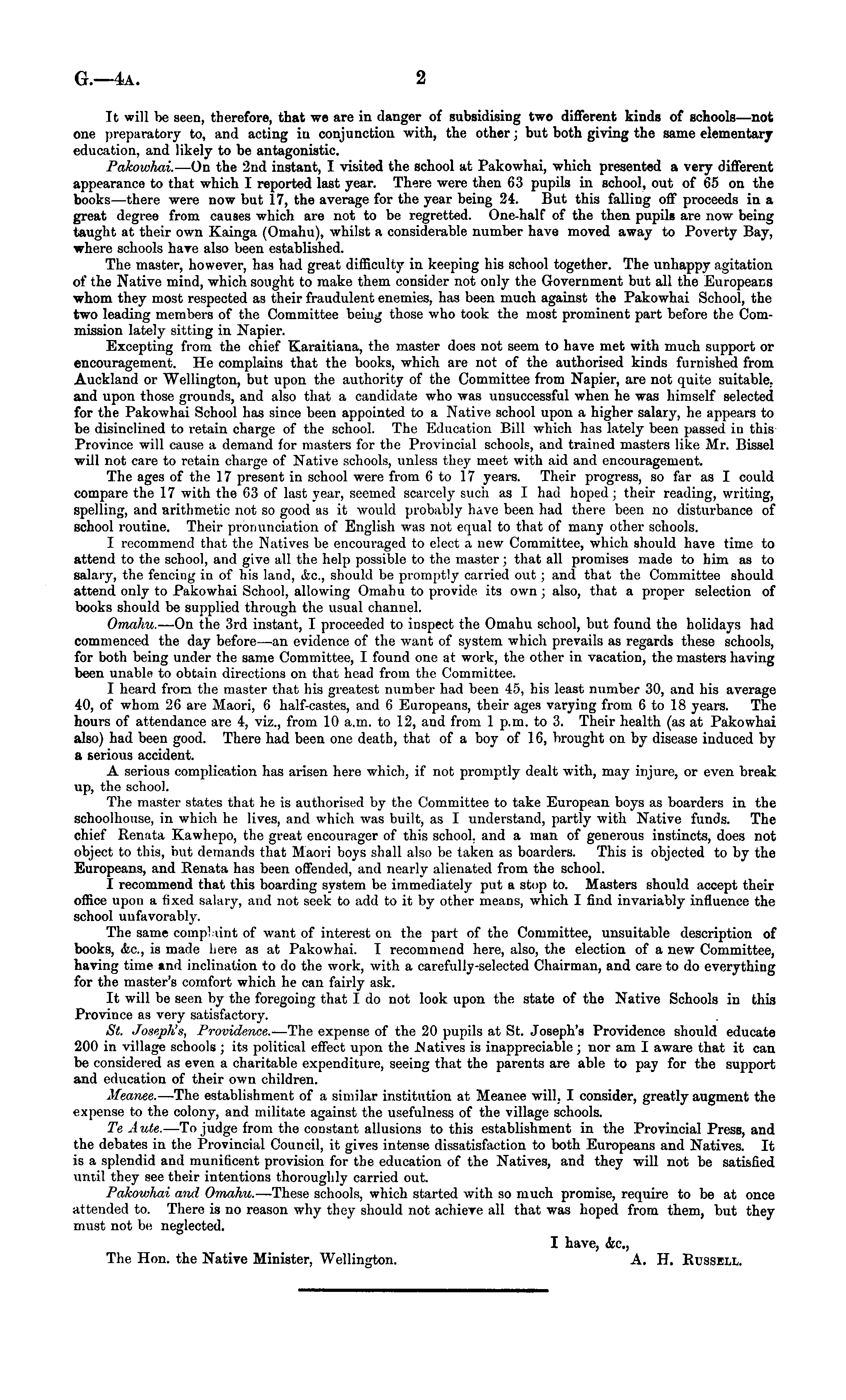It will be seen, therefore, that we are in danger of subsidising two different kinds of schools—not one preparatory to, and acting iv conjunction with, the other; but both giving the same elementary education, and likely to be antagonistic. Pakowhai. —On the 2nd instant, I visited the school at Pakowhai, which presented a very different appearance to that which I reported last year. There were then 63 pupils in school, out of 65 on the books—there were now but 17, the average for the year being 24. But this falling off proceeds in a great degree from causes which are not to be regretted. One-half of the then pupils are now being taught at their own Kainga (Omahu), whilst a considerable number have moved away to Poverty Bay, where schools have also been established. The master, however, has had great difficulty in keeping his school together. The unhappy agitation of the Native mind, which sought to make them consider not only the Government but all the Europeans whom they most respected as their fraudulent enemies, has been much against the Pakowhai School, the two leading members of the Committee being those who took the most prominent part before the Commission lately sitting in Napier. Excepting from the chief Karaitiana, the master does not seem to have met with much support or encouragement. He complains that the books, which are not of the authorised kinds furnished from Auckland or Wellington, but upon the authority of the Committee from Napier, are not quite suitable, and upon those grounds, and also that a candidate who was unsuccessful when he was himself selected for the Pakowhai School has since been appointed to a Native school upon a higher salary, he appears to be disinclined to retain charge of the school. The Education Bill which has lately been passed in this Province will cause a demand for masters for the Provincial schools, and trained masters like Mr. Bissel will not care to retain charge of Native schools, unless they meet with aid and encouragement. The ages of the 17 present in school were from 6to 17 years. Their progress, so far as I could compare the 17 with the 63 of last year, seemed scarcely such as I had hoped; their reading, writing, spelling, and arithmetic not so good as it would probably have been had there been no disturbance of school routine. Their pronunciation of English was not equal to that of many other schools. I recommend that the Natives be encouraged to elect a new Committee, which should have time to attend to the school, and give all the help possible to the master; that all promises made to him as to salary, the fencing in of his land, (fee, should be promptly carried out ; and that the Committee should attend only to Pakowhai School, allowing Omahu to provide its own ; also, that a proper selection of books should be supplied through the usual channel. Omahu. —On the 3rd instant, I proceeded to inspect the Omahu school, but found the holidays had commenced the day before—-an evidence of the want of system which prevails as regards these schools, for both being under the same Committee, I found one at work, the other in vacation, the masters having been unable to obtain directions on that head from the Committee. I heard from the master that his greatest number had been 45, his least number 30, and his average 40, of whom 26 are Maori, 6 half-castes, and 6 Europeans, their ages varying from 6to 18 years. The hours of attendance are 4, viz., from 10 a.m. to 12, and from 1 p.m. to 3. Their health (as at Pakowhai also) had been good. There had been one death, that of a boy of 16, brought on by disease induced by a serious accident. A serious complication has arisen here which, if not promptly dealt with, may injure, or even break up, the school. The master states that he is authorised by the Committee to take European boys as boarders in the schoolhouse, in which he lives, and which was built, as I understand, partly with Native funds. The chief Renata Kawhepo, the great encourager of this school, and a man of generous instincts, does not object to this, but demands that Maori boys shall also be taken as boarders. This is objected to by the Europeans, and Renata has been offended, and nearly alienated from the school. I recommend that this boarding system be immediately put a stop to. Masters should accept their office upon a fixed salary, and not seek to add to it by other means, which I find invariably influence the school uufavorably. The same compl unt of want of interest on the part of the Committee, unsuitable description of books, <fee, is made here as at Pakowhai. I recommend here, also, the election of a new Committee, having time and inclination to do the work, with a carefully-selected Chairman, and care to do everything for the master's comfort which he can fairly ask. It will be seen by the foregoing that I do not look upon the state of the Native Schools in this Province as very satisfactory. St. Joseph's, Providence. —The expense of the 20 pupils at St. Joseph's Providence should educate 200 in village schools ; its political effect upon the .Natives is inappreciable; nor am I aware that it can be considered as even a charitable expenditure, seeing that the parents are able to pay for the support and education of their own children. Meanee. —The establishment of a similar institution at Meanee will. I consider, greatly augment the expense to the colony, and militate against the usefulness of the village schools. Te Ante. —To judge from the constant allusions to this establishment in the Provincial Press, and the debates in the Provincial Council, it gives intense dissatisfaction to both Europeans and Natives. It is a splendid and munificent provision for the education of the Natives, and they will not be satisfied until they see their intentions thoroughly carried out. Pakowhai and Omahu. —-These schools, which started with so much promise, require to be at once attended to. There is no reason why they shoul