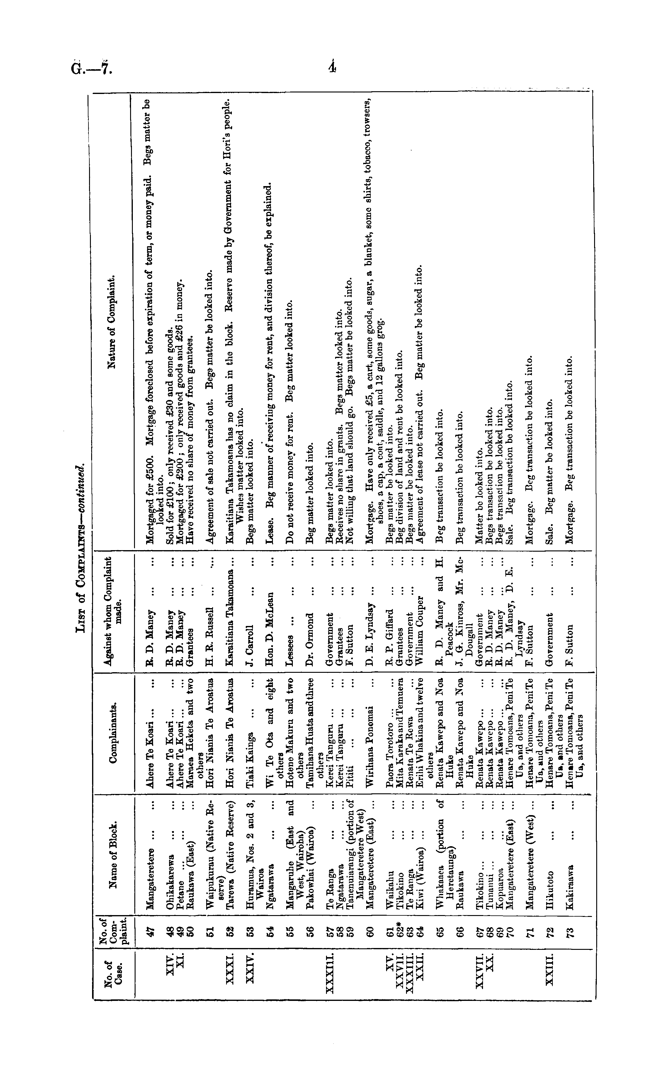 iIST Ol 'OMPL, '3— eontinuet No. of Case. No. of Complaint. Name of Block. Complainants. Against whom Complaint made. Nature of Complaint. 47 Mangateretere ... Ahere To Koari ... K. D. Maney Mortgaged for £500. Mortgage foreclosed before expiration of term, or money paid. Begs matter be looked into. Sold for £100; only received £30 and some goods. Mortgaged for £200 ; only received goods and £26 in money. Have received no share of money from grantees. XIV. XI. 48 49 50 Ohikakarewa Pctane ... ... Raukawa (East) Ahere To Koari ... Ahere Te Koari ... Mamea Heketa and two others Hori Niania Te Aroatua R. D. Maney R. D. Maney Grantees XXXI. - 52 Waipukurau (Native Reserve) Tarewa (Native Reserve) Hori Niania Te Aroatua II. R. Russell ... Karaitiana Takamoana ... Agreement of sale not carried out. Beg» matter be looked into. Karaitiana Takamoana has no claim in tlio block. Reserve made by Government for Hori's people. Wishes matter looked into. Begs matter looked into. XXIV. 53 Huramua, Nos. 2 and 3, Wairoa Ngatarawa Tiaki Kainga J. Carroll 54 Wi Te Ota and eight others Hotene Makuru and two others Tamihanalluata and three others Kerei Tanguru ... Kerei Tanguru ... Pititi Hon. D. McLean Lease. Beg manner of receiving money for rent, and division thereof, bo explained. 55 Mangarulie (East and West, Wairoha) Pakowhai (Wairoa) Lessees ... Do not receive money for rent. Beg matter looked into. 56 Dr. Ormond Beg matter looked into. XXXIII. 57 58 59 TeEanga Ngatarawa Tanenuiarangi (portion of Maugateretere West) Mangateretere (East) ... Government Grantees >\ Sutton Begs matter looked into. Receives no share in grants. Begs matter looked into. Not willing that land should go. Begs matter be looked into. 60 Wirihana Ponomai D. E. Lyndsay ... Mortgage. Have only received £5, a cart, some goods, sugar, a blanket, some shirts, tobacco, trowsers, shoes, a cap, a coat, saddle, and 12 gallons grog. Begs matter be looked into. Beg division of land and rent be looked into. Begs matter be looked into. Agreement of lease not carried out. Beg matter be looked into. XV. XXVII. XXXIII. XXII. XXVII. XX. 61 62* 63 61 65 66 j f>7 68 69 70 Waikahu Tikokino Tc! Kanga Kiwi (Wairoa) ... Wlmkaaea (portion of Heretaunga) Eaukawa Tikokino Tunanui ... Kopuaroa Mangateretere (East) ... Paora Torotoro ... Mita KarakaandTemuera Kenata Te Rewa Erihi Whakina and twelve others Eeiinta Kawepo and Noa Huke Senate Kawepo and Noa Huke Eenata Kawepo ... Ronata Kawepo ... Kenata Kawepo ... Henare Tomouna, PeniTo Ua, and others Henare Tomoana, PeniTe Ua, and others Henare Tomoana, PeniTe Ua, and others Hen»re Tomoana, Peni Te Ua, and others R. P. Giffard Grantees Government William Couper R. D. Maney and H. Peacock J. G-. Kinross, Mr. McDougall Government R. D. Maney R. D. Maney R. D. Maney, D. E. Lyndsay F. Button Beg transaction be looked into. Beg transaction be looked into. Matter be looked into. Begs transaction be looked into. Begs transaction be looked into. Sale, lieg transaction be looked into. 71 Mangateretere (West) ... Mortgage. Beg transaction bo looked into. XXIII. 72 Hikutoto Government Sale. Beg matter be looked into. 73 Kakiraawa F. Sutton Mortgage. Beg transaction be looked into.