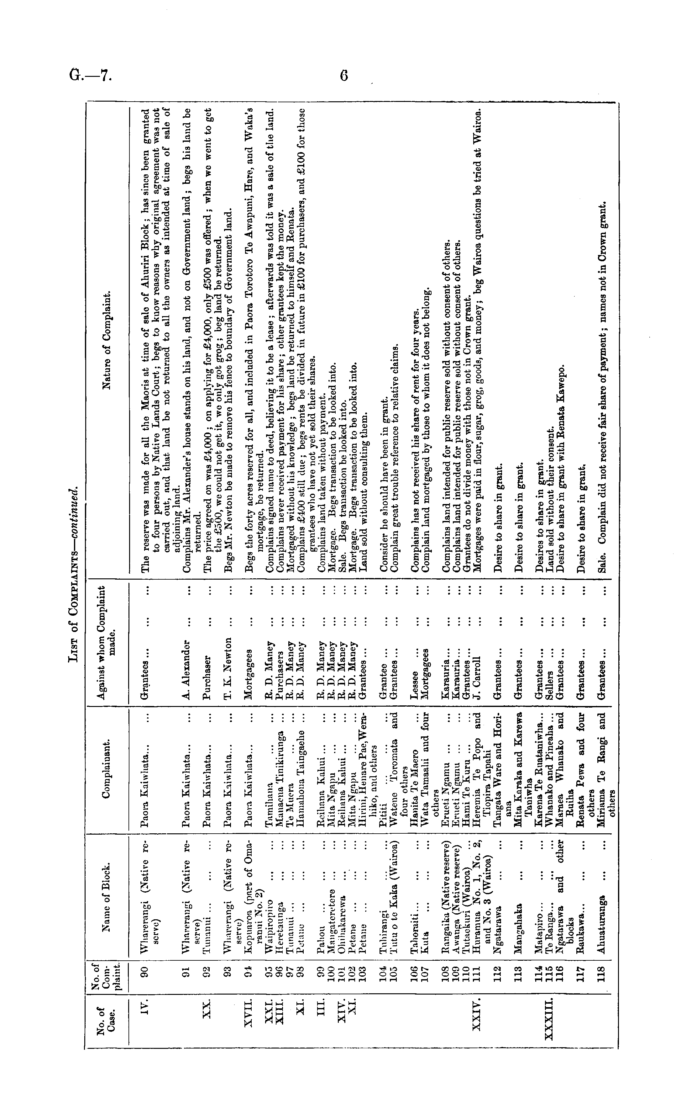 iIst o: 'omplaints — continue) No. of Case. No. of Complaint. {fame of Block. Complainant. Against whom Complaint made. Nature of Complaint. IV. 90 Wharanngi (Native reserve) Paora Kaiwhata... Grantees ... 91 Wharerangi (Native reserve) Tunanui ... Paora Kaiwhata... A. Alexander The reserve was made for all the Maoris at time of salo of Ahuriri Block ; has since been granted to four persons by Native Lands Court; begs to know reasons why original agreement was not carried out, and that land be not returned to all the owners as intended at time of sale of adjoining land. Complains Mr. Alexander's house stands on his land, and not on Government land ; begs his land be returned. The price agreed on was £4,000 ; on applying for £1,000, only £300 was offered ; when we went to get the £500, we could not get it, we only got grog ; beg land be returned. Begs Mr. Newton be made to remove his "fence to boundary of Government land. XX. 92 Paora Ivaiwhata... Purchaser XVII. XXI. XIII. 93 94 95 96 97 98 Whorerangi (Native reserve) Kopuaroa (part of Omaranui No. 2) Waipiropii-o Ileretaunga Tunanui ... PeUiie Paora Kaiwhata... Paora Kaiwhata,.. Tamihana Manaena Tinikirunga ... Te Muera llamahona Taingaeho ... T. K. Newton Mortgagees R. D. Maney Purchasers R. D. Maney B. D. Maney Begs the forty acres reserved for all, and included in Paora Torotoro Te Awapuni, Hare, and Waka's mortgage, be returned. Complains signed name to deed, believing it to be a lease ; afterwards was told it was a sale of the land. Complains never received payment for his share ; other grantees kept the money. Mortgaged without his knowledge ; begs laud be returned to himself and Benata. Complains £400 still due; begs rents be divided in future in £100 for purchasers, and £100 for those grantees who havo not yet sold their shares. Complains land taken without payment. Mortgage, liegs transaction to be looked into. Sale. Begs transaction be looked into. Mortgage. Begs transaction to be looked into. Land sold without consulting them. XI. III. XIV. XI. 99 100 101 102 103 Paliou Mangateretore ... Ohihakarcwa Petane Petana Reihana Kahui... Mila Ngapu Reihana Kaluu ... Mita Ngapu Hirini, Henare Pae,Weraliiko, and others Pititi Watene Toromata and four others Hanita Te Macro Wata Taraaahi and four others Erueti Ngamu ... Krueti Ngamu ... llami Te Kuru ... Heretnia Te Popo and Tiopira Tapahi Tangata Ware and Horiana Mita Karaka and Karewa Taniwha Karena Te Kuataniwha... Whanako and Pineaha ... Manea Whauako and Ruiha Renata Pewa and four others Miriiima Te Rangi and others B. D. Maney K. D. Maney B. D. Maney B. D. Mauey Grantees ... 104 103 Tuhirangi Tutu o te Iiaka (Wairoa) Grantee ... Grantees ... Consider he should have been in grant. Complain great trouble reference to relative claims. 106 107 Tahoraiti... Kuta Lessee Mortgagees Complains has not received his share of rent for four years. Complain land mortgaged by those to whom it does not belong. 108 109 110 111 Rangaika (Native reserve) Awanga (Native reserve) Tutaekun (Wairoa) Hnramua No. 1, No. 2, and No. 3 (Wairoa) Ngatarawa Karauria... Karauria... Grantees ... J. Carroll Complains land intended for public reserve sold without consent of others. Complains land intended for public reserve sold without consent of others. Grantees do not divide money with those not in Crown grant. Mortgages were paid in flour,sugar, grog, goods, and money; beg Wairoa questions be tried at Wairoa. XXIV. 112 Grantees... Desire to share in grant. 113 Hangahaka Grantees ... Desire to sharo in grant. XXXIII. 114 115 116 Matapiro... TeRanga... Ngatarawa and other blocks Raukawa... Grantees ... Sellers ... Grantees... Desires to share in grant. Land sold without their consent. Desire to share in grant with Renata Kawepo. 117 Grantees... Desire to sharo in grant. 118 Ahuaturanga Grantees... Sale. Complain did not receive fair share of payment; names not in Crown grant.