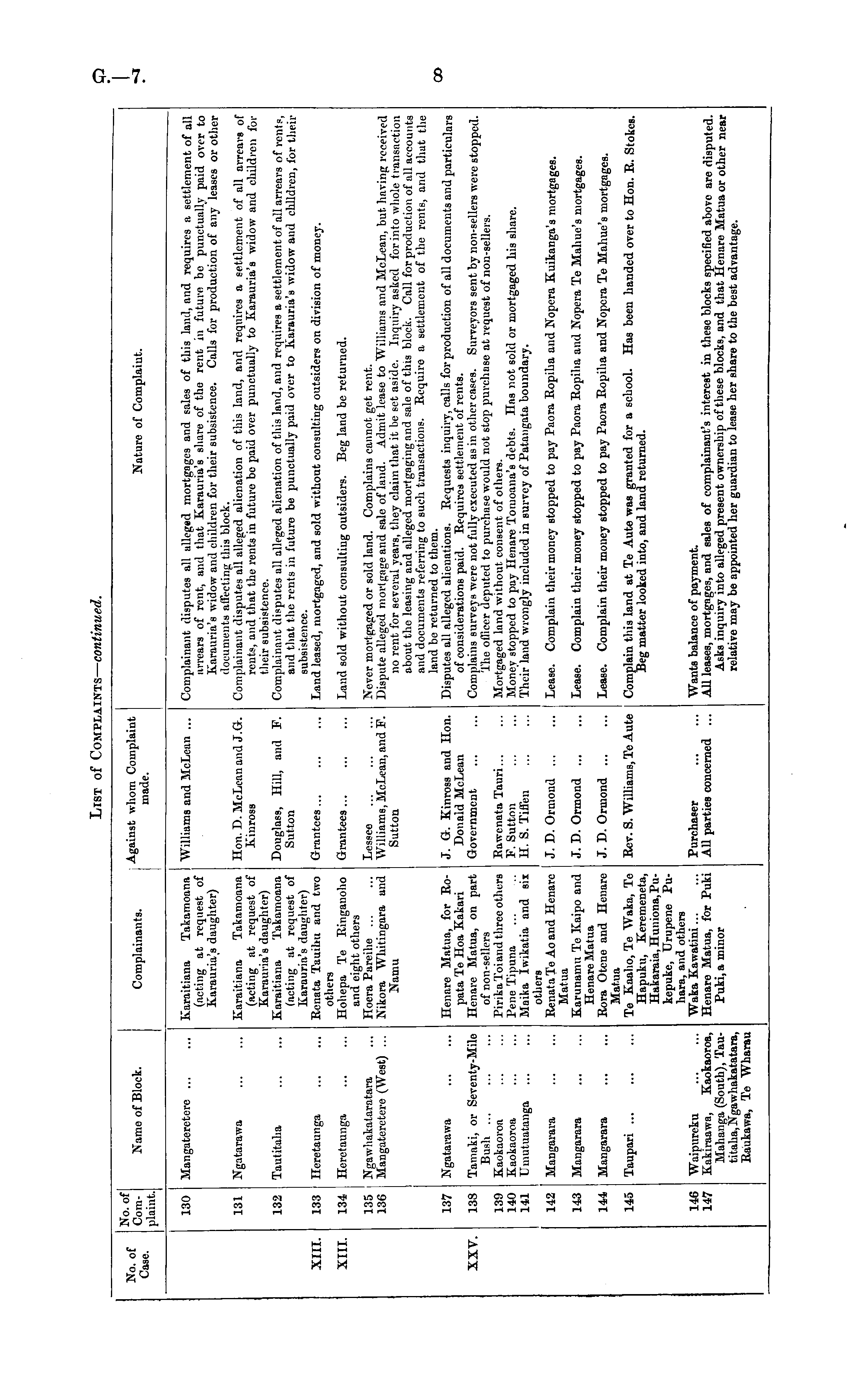 iiST o: 'omplaints — continuei No. of Case. No. of Complaint. Name of Block. Complainants. Against whom Complaint made. Nature of Complaint. 130 Mangaterctcrc ... Karaitiana Takamoana (noting at request of Karauria's daughter) Williams and McLean ... Complainant disputes all alleged mortgages and sales of this land, and requires a settlement of all arrears of rent, and that Karauria's share of the rent in future be punctually paid over to Karauria's widow and children for their subsistence. Calls for production of any leases or other documents affecting this block. Complainant disputes all alleged alienation of this land, and requires a settlement of all arrears of rents, and that the rents in future be paid over punctually to Karauria's widow and children for their subsistence. Complainant disputes all alleged alienation of this land, and requires a settlement of all arrears of rents, and that the rents in future be punctually paid over to Karauria's widow and children, for their subsistence. Land leased, mortgaged, and sold without consulting outsiders on division of money. 131 Ngatarawa Karaitiana Takamoana (acting at request of Karauria's daughter) Karaitiana Takamoana (acting at request of Karauria's daughter) Renata Tauihu and two others Ilohepa Te Ringanoho and eight others Iloera Pareihe ... Nikora Whitingara and Namu Hon. D. McLean and J.Gr. Kinross 132 Tautitalia Douglass, Hill, and F. Sutton XIII. 133 Heretaunga Grantees ... XIII. 134 Heretaunga Grantees ... Land sold without consulting outsiders. Beg land be returned. 135 136 Ngawhakalaratara Mangateretero (West) ... Lessee Williams, McLean, and F. Suttou Never mortgaged or sold land. Complains cannot get rent. Dispute alleged mortgage and sale of land. Admit lease to Williams and McLean, but having received no rent for several years, they claim that it be set aside. Inquiry asked for into whole transaction about the leasing and alleged mortgaging and sale of this block. Call for production of all accounts and documents referring to such transactions. Require a settlement of the rents, and that the land be returned to them. Disputes all alleged alienations. Requests inquiry, calls for production of all documents and particulars of considerations paid. Requires settlement of rents. Complains surveys were not fully executed as in other cases. Surveyors sent by non-sellers were stopped. The officer deputed to purchase would not stop purchase at request of non-sellers. Mortgaged land without consent of others. Money stopped to pay Henare Toiuoana's debts. Has not sold or mortgaged his share. Their land wrongly included in survey of Patangata boundary. Ngatarawa Ilennre Matua, for Ropata Te Hoa Kakari Ilenare Matua, on part of non-sellers PirikaToiand three others Pene Tipuna Maika Iwikatia and six others Kenata Te Aoand Ilenare Matua Karunamu Te Kaipo and Henare Matua Kora Otene and Henare Matua Te Kaaho, Te Waka, Te Hapuku, Keremeueta, Hakaraia, IIuniona,Pukepuke, Urupene Puhara, and others Waka Kawatini... Henare Matua, for Puki Fuki, a minor J. G-. Kinross and Hon. Donald McLean Government 137 XXV. 138 Tamaki, or Seventy-Mile Bush Kaokaoroa Kaokaoroa Umutuatanga 139 140 141 Rnwcnuta Tauri... V. Sutton U. S. TiiTen 142 Mangarara J. D. Ormond ... Lease. Complain their money stopped to pay Paora Ropiha and Nopera Kuikanga's mortgages. 143 Mangarara J. D. Ormond ... Lease. Complain their money stopped to pay Paora Ropiha and Nopera Te Mahue's mortgages. 144 Mangarara J. D. Ormond ... Lease. Complain their money stopped to pay Paora Ropiha and Nopera Te Mahue's mortgages. 145 Taupari Her. S. Williams, Te Aute Complain this land at Te Aute was granted for a school. Has been handed over to Hou. R. Stokes. Beg matter looked into, and land returned. 146 147 Waipureku Kakiraawa, Kaokaoroa, Mahanga (South), Tautitalia, Ngawhakatatara, Raukawa, Te Wharau Purchaser All parties concerned ... Wants balance of payment. All leases, mortgages, and sales of complainant's interest in these blocks specified above are disputed. Asks inquiry into alleged present ownership of these blocks, and that Henare Matua or other near relative may be appointed her guardian to lease her share to the best advantage.