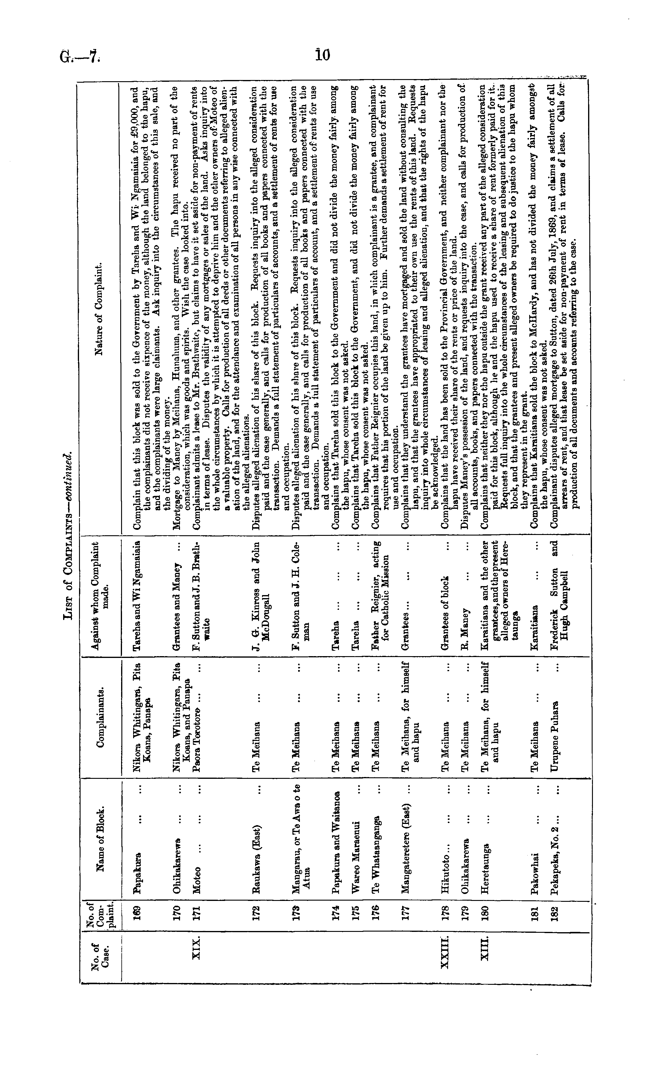 iIst o: '05IPL. .ijtts — continue! No. of Case. No. of Complaint. Name of Block. Complainants. Against whom Complaint made. Nature of Complaint. 169 Papafcura Nikora Whitingara, Pita Koana, Panapa Tareha and Wi Ngamaiaia Complain that this block was sold to the GoTernment by Tareha and Wi Ngamaiaia for £9,000, and the complainants did not receive sixpence of the money, although the land belonged to the hapu, and the complainants were large claimants. Ask inquiry into the circumstanoes of this sale, and the dividing of the monej'. Mortgage to Maney by Meihana, Ilunahuna, and other grantees. Tho hapu received no part of tho consideration, which was goods and spirits. Wish the case looked into. Complainant admits a lease to Mr. Brathwaite, but claims to have it set aside for non-payment of rents in terms of lease. Disputes tho validity of any mortgages or sales of the land. Asks inquiry into the whole circumstances by which it is attempted to deprive him and the other owners of Moteo of a valuable property. Calls for production of all deeds or other documents referring to alleged alienation of the land, and for the attendance and examination of all persons in any wise connected with the alleged alienations. Disputes alleged alienation of his share of this block. Requests inquiry into the alleged consideration paid and the ease generally, and calls for production of all books and papers connected with the transaction. Demands a full statement of particulars of accounts, and a settlement of rents for uso and occupation. Disputes alleged alienation of his share of this block. Requests inquiry into the alleged consideration paid and the case generally, and calls for production of all books and papers connected with the transaction. Demands a lull statement of particulars of account, and a settlement of rents for uso and occupation. Complains that Tareha sold this block to the Government and did not divide the money fairly among the hapu, whose consent was not asked. Complains that Tareha sold this block to the Government, and did not divide the money fairly among the hapu, whose consent was not asked. Complains that Father Reignier occupies this land, in which complainant is a grantee, and complainant requires that his portion of the land be given up to him. Further demands a settlement of rent for use and occupation. Complains that they understand tho grantees have mortgaged and sold the land without consulting the hapu, and that the grantees have appropriated to their own use the rents of this land. Requests inquiry into whole circumstances of leasing and alleged alienation, and that the rights of the hapu be acknowledged. Complains that the lund has been sold to the Provincial Government, and neither complainant nor the hapu have received their sharo of the rents or price of the land. Disputes Maney's possession of the land, and requests inquiry into the case, and calls for production of all accounts, books, and papers connected with the transaction. Complains that neither they nor the hapu outside the grant received any part of the alleged consideration paid for this block, although he and the hapu used to receive a share of rent formerly paid for it. Requests full inquiry into the whole circumstances of the leasing and subsequent alienation of this block, and that the grantees and present alleged owners be required to do justice to the hapu whom they represent in the grant. Complains that Karaitiana sold the block to McIIardy, and has not divided the money fairly amongst the hapu, whose consent was not asked. Complainant disputes alleged mortgage to Sutton, dated 26th July, 1869, and claims a settlement of all arrears of rent, and that lease be set aside for non-payment of rent in terms of lease. Calls for production of all documents and accounts referring to the case. Ohikiikarewa Nikora Whitingarn, Pita Koana, and Panapa Paora Torotoro ... Grantees and Maney 170 XIX. 171 Moteo F. Sutton and J. B. Brathwaite Raukawa (East) Te Meihana J. G-. Kinross and John MeDougall 172 173 Mangarau, or Te Awa o te Atua Te Meihana F. Sutton and J. II. Coleman Papakura and Waitanoa Te Meihana Tareha 174 175 Wareo Maraenui Te Meihana Tareha 176 Te Whataanganga Te Meihana Father Reignier, acting for Catholic Mission 177 Mangateretero (East) ... Te Meihana, for himself and hapu Grantees Ilikutoto... Te Meihana Grantees of block XXIII. 178 XIII. 179 Ohikakarcwa Te Meihana K. Maney 180 Heretaunga Te Meihana, for himself and hapu Karaitiana and the other grantees, and the present alleged owners of Heretaunga Pakowhai Te Meihana Karaitiana 181 182 Pekapeka, No. 2 XJrupene Puhara Frederick Sutton and Hugh Campbell