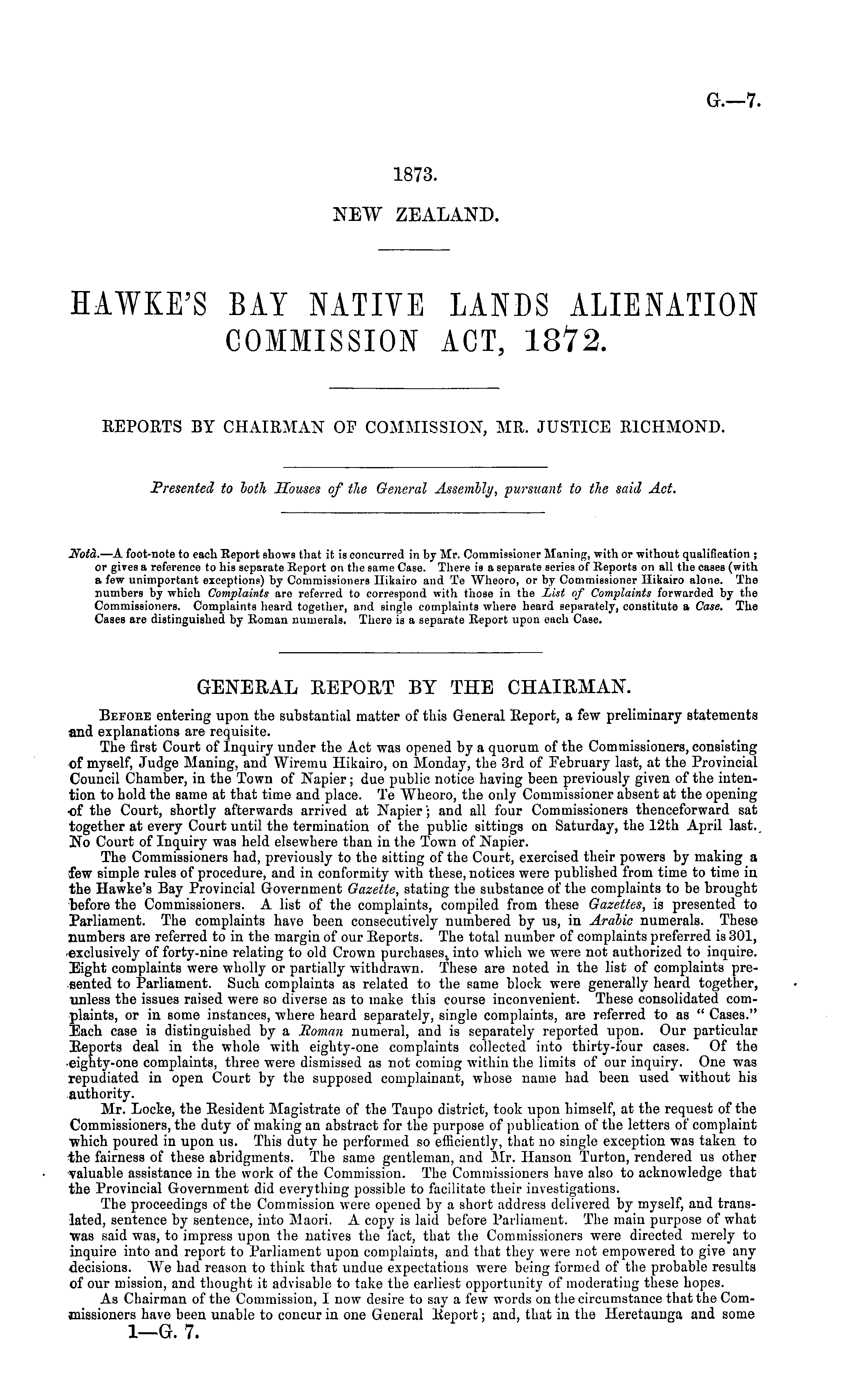 GENERAL REPORT BY THE CHAIRMAN. Befoee entering upon the substantial matter of this General Eeport, a few preliminary statements and explanations are requisite. The first Court of Inquiry under the Act was opened by a quorum of the Commissioners, consisting of myself, Judge Maning, and Wiremu Hikairo, on Monday, the 3rd of February last, at the Provincial Council Chamber, in the Town of Napier; due public notice having been previously given of the intention to hold the same at that time and place. Te "Wheoro, the only Commissioner absent at the opening ■of the Court, shortly afterwards arrived at Napier; and all four Commissioners thenceforward sat together at every Court until the termination of the public sittings on Saturday, the 12th April last. No Court of Inquiry was held elsewhere than in the Town of Napier. The Commissioners had, previously to the sitting of the Court, exercised their powers by making a few simple rules of procedure, and in conformity with these, notices were published from time to time in the Hawke's Bay Provincial Government Gazette, stating the substance of the complaints to be brought before the Commissioners. A list of the complaints, compiled from these Gazettes, is presented to Parliament. The complaints have been consecutively numbered by us, in Arabic numerals. These numbers are referred to in the margin of our Reports. The total number of complaints preferred is 301, ■exclusively of forty-nine relating to old Crown purchases s into which we were not authorized to inquire. Eight complaints were wholly or partially withdrawn. These are noted in the list of complaints presented to Parliament. Such complaints as related to the same block were generally heard together, unless the issues raised were so diverse as to make this course inconvenient. These consolidated complaints, or in some instances, -where heard separately, single complaints, are referred to as " Cases." Each case is distinguished by a 'Roman numeral, and is separately reported upon. Our particular Reports deal in the whole with eighty-one complaints collected into thirty-four cases. Of the eighty-one complaints, three were dismissed as not coming within the limits of our inquiry. One was repudiated in open Court by the supposed complainant, whose name had been used without his authority. Mr. Locke, the Resident Magistrate of the Taupo district, took upon himself, at the request of the Commissioners, the duty of making an abstract for the purpose of publication of the letters of complaint which poured in upon us. This duty he performed so efficiently, that no single exception was taken to the fairness of these abridgments. The same gentleman, and Mr. Hanson Turton, rendered us other valuable assistance in the work of the Commission. The Commissioners have also to acknowledge that the Provincial Government did everything possible to facilitate their investigations. The proceedings of the Commission were opened by a short address delivered by myself, and translated, sentence by sentence, into Maori. A copy is laid before Parliament. The main purpose of what was said was, to impress upon the natives the fact, that the Commissioners were directed merely to inquire into and report to Parliament upon complaints, and that they were not empowered to give any decisions. We had reason to think that undue expectations were being formed of the probable results of our mission, and thought it advisable to take the earliest opportunity of moderating these hopes. As Chairman of the Commission, I now desire to say a few words on the circumstance that the Commissioners have been unable to concur in one General Report; and, that in the Heretaunga and some I—G. 7.